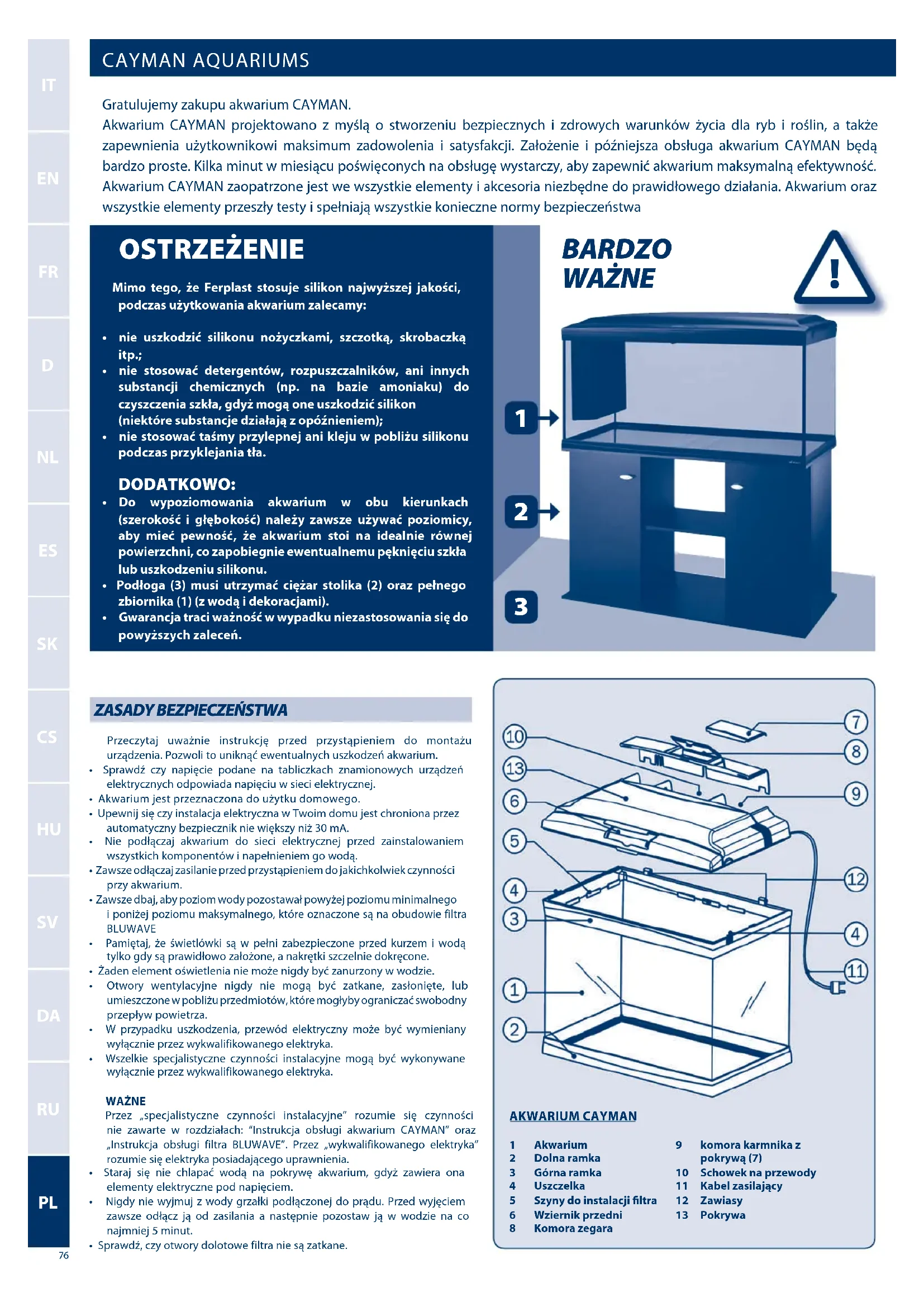 Przez „specjalistyczne czynności instalacyjne” rozumie się czynności nie zawarte w rozdziałach: "Instrukcja obsługi akwarium CAYMAN" oraz „Instrukcja obsługi filtra BLUWAVE”. Przez „wykwalifikowanego elektryka” rozumie się elektryka posiadającego uprawnienia.
