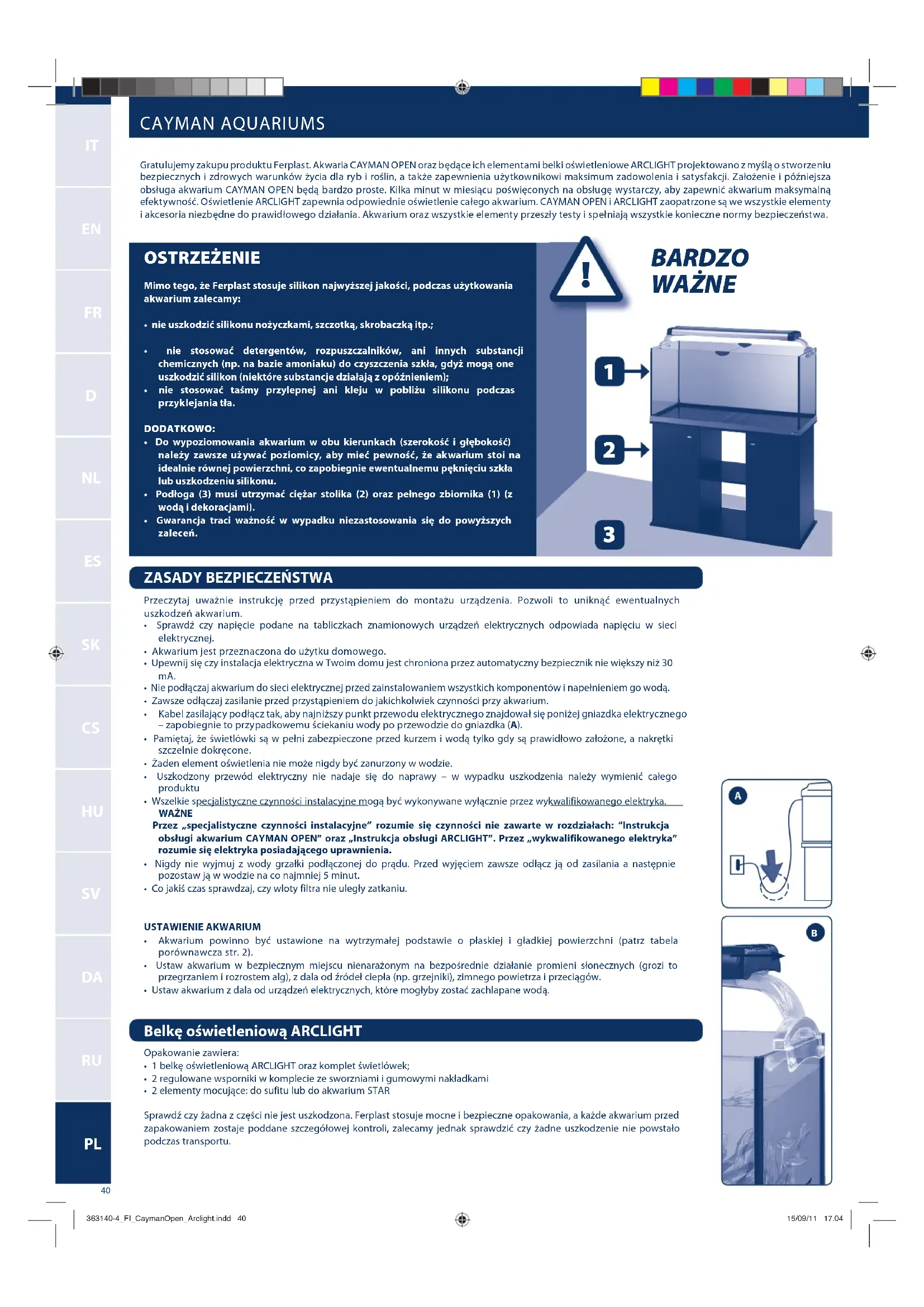 Gratulujemy zakupu produktu Ferplast. Akwaria CAYMAN OPEN oraz;bace ich elementami belki oswieteniowe ARCLIGHT Projekttozwo stworzeniu bezpiecznych i zdrwych warunkow zycia dlra yb i roslin, a takze zapewnienia uzytkownikowski maksimum zadowolenia i satysfakci. Zaloenie i poznejssa obluga akwarium CAYMAN OPEN beda bardzo proste. Kilkma minut w mieziću poswieconych na obsluge wystarczy, aby zapewnic akwarium maksymalna efektywnoŚ. Oswietlenie ARCLIGHT zapewnia opdowiednie calgo akwarium. CAYMAN OPEN i ARCLIGHT zaopatrzone są we szystkie elementy i akcesoria niedne do prawidlowego dzialania. Akwarium oraz wzystkie elementy przyszly testy i spelniljaż wyszstkie konieczne normy bezpiecieznstwa.