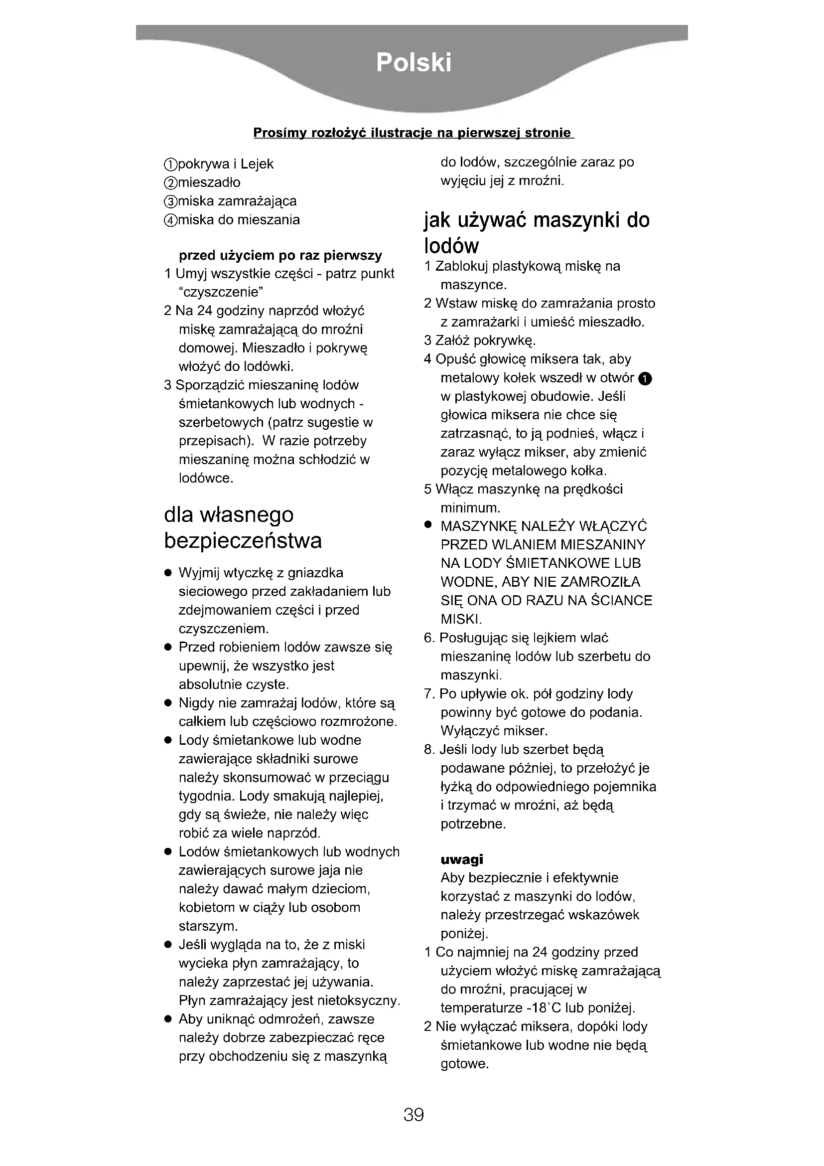 a külsò hòmérséklet 38 pokrywa i Lejek mieszad¢o miska zamra¯ajåca miska do mieszania przed u¯yciem po raz pierwszy 1 Umyj wszystkie czëÿci - patrz punkt “czyszczenie” 2 Na 24 godziny naprzód w¢o¯yç miskë zamra¯ajåcå do mro¶ni domowej. Mieszad¢o i pokrywë w¢o¯yç do lodówki. 3 Sporzådziç mieszaninë lodów ÿmietankowych lub wodnych - szerbetowych (patrz sugestie w przepisach). W razie potrzeby mieszaninë mo¯na sch¢odziç w lodówce. dla w¢asnego bezpieczeæstwa