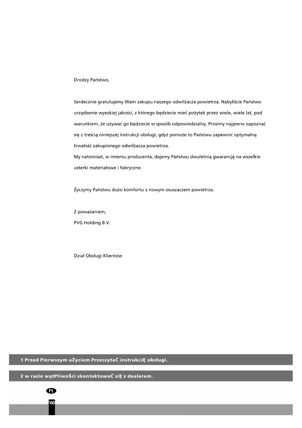 1 Przed Pierwszym użyciem Przeczytać instrukcję obsługi. 2 w razie wątPliwości skontaktować się z dealerem. Drodzy Państwo, Serdecznie gratulujemy Wam zakupu naszego odwilżacza powietrza. Nabyliście Państwo urządzenie wysokiej jakości, z którego będziecie mieć pożytek przez wiele, wiele lat, pod warunkiem, że używać go będziecie w sposób odpowiedzialny. Prosimy najpierw zapoznać się z treścią niniejszej instrukcji obsługi, gdyż pomoże to Państwu zapewnić optymalną trwałość zakupionego odwilżacza powietrza. My natomiast, w imieniu producenta, dajemy Państwu dwuletnią gwarancję na wszelkie usterki materiałowe i fabryczne. Życzymy Państwu dużo komfortu z nowym osuszaczem powietrza. Z poważaniem, PVG Holding B.V. Dział Obsługi Klientów :BELANGRIJKE ONDERDELEN Bedieningspaneel Uitlaat van droge lucht Uitneembaar waterreservoir Inlaat van vochtige lucht Luchtfilter Afvoertuit (ø 13 mm) met dop Zwenkwieltje Stekker en snoer Handvat