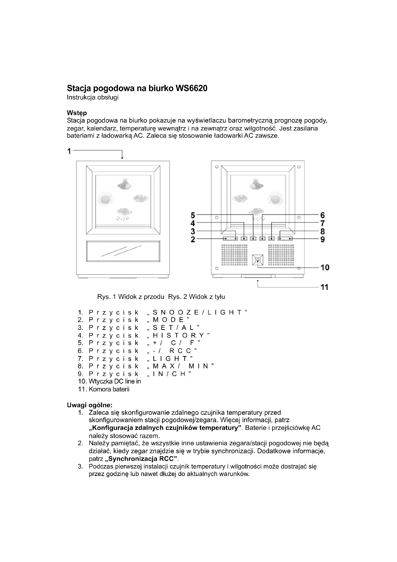 - Recycle indien mogelijk. Specificaties Temperatuurbereik binnenshuis: 0°C tot 50°C (32°F tot 122°F) Temperatuurbereik buitenshuis: -20°C tot 50°C (-4°F tot 122°F) Bereik relatieve vochtigheid: 20%-95% Bereik barometrische druk: 930mb tot 1050mb Voeding (Weerstation): 4 x type AAA 1,5V batterijen Voeding (Temperatuursensor): 2 x type AAA 1,5V batterijenStacja pogodowa na biurko WS6620 Instrukcja obsługi Wstęp Stacja pogodowa na biurko pokazuje na wyświetlaczu barometryczną prognozę pogody, zegar, kalendarz, temperaturę wewnątrz i na zewnątrz oraz wilgotność. Jest zasilana bateriami z ładowarką AC. Zaleca się stosowanie ładowarki AC zawsze.