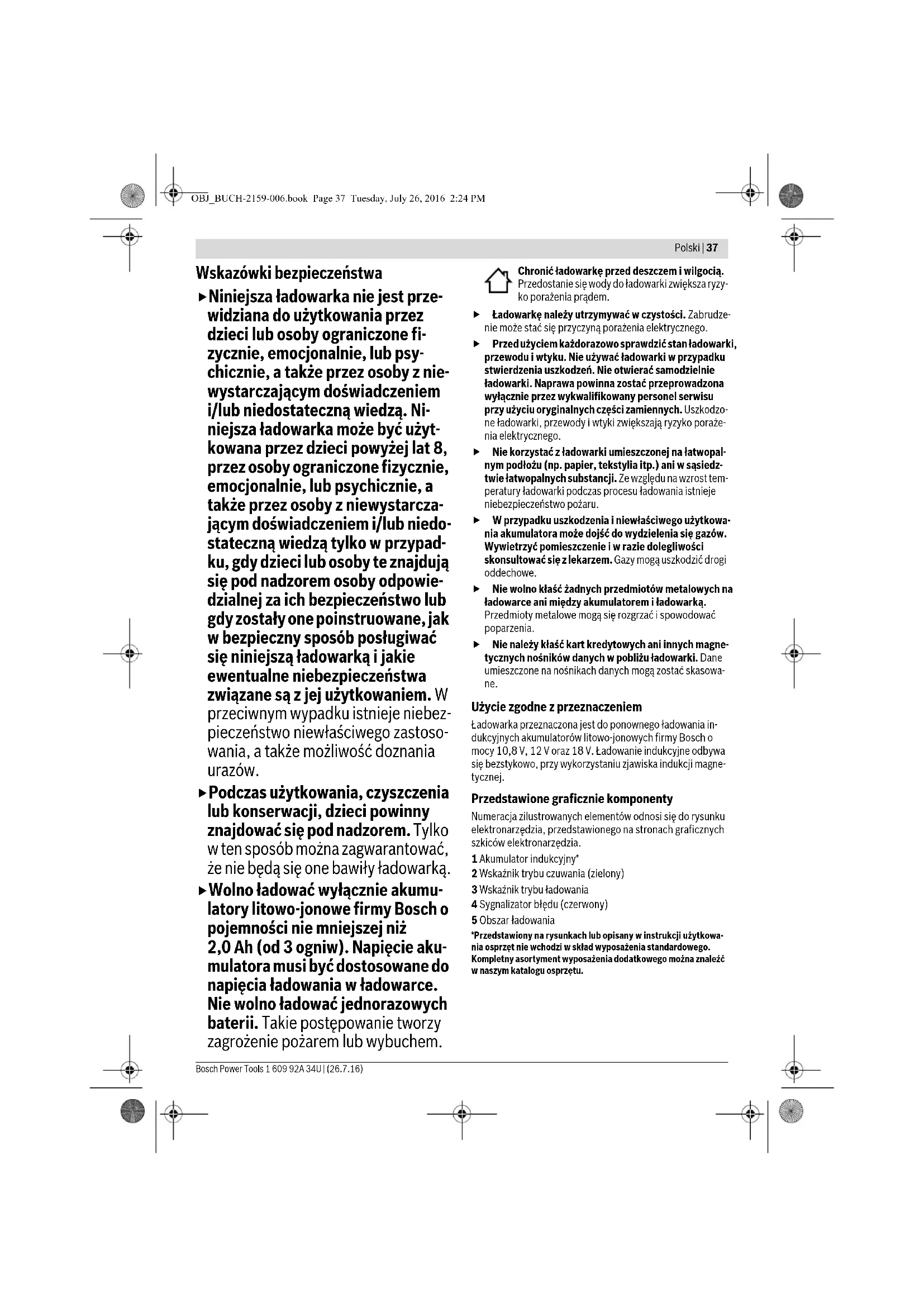 Denizli Tel.: 0258 2620666 Bulut Elektrik İstasyon Cad. No: 52/B Devlet Tiyatrosu Karşısı Elazığ Tel.: 0424 2183559 Körfez Elektrik Sanayi Çarşısı 770 Sok. No: 71 Erzincan Tel.: 0446 2230959 Ege Elektrik İnönü Bulvaro No: 135 Muğla Makasarası Fethiye Fethiye Tel.: 0252 6145701 Değer İş Bobinaj İsmetpaşa Mah. İlk Belediye Başkan Cad. 5/C Şahinbey Gaziantep Tel.: 0342 2316432 Çözüm Bobinaj İsmetpaşa Mah. Eski Şahinbey Belediyesi altı Cad. No: 3/C Gaziantep Tel.: 0342 2319500 Onarım Bobinaj Raifpaşa Cad. No: 67 İskenderun Hatay Tel.: 0326 6137546 Günşah Otomotiv Beylikdüzü Sanayi Sit. No: 210 Beylikdüzü İstanbul Tel.: 0212 8720066 Aygem 10021 Sok. No: 11 AOSB Çiğli İzmir Tel.: 0232 3768074 Sezmen Bobinaj Ege İş Merkezi 1201/4 Sok. No: 4/B Yenişehir İzmir Tel.: 0232 4571465 Ankaralı Elektrik Eski Sanayi Bölgesi 3. Cad. No: 43 Kayseri Tel.: 0352 3364216 Asal Bobinaj Eski Sanayi Sitesi Barbaros Cad. No: 24 Samsun Tel.: 0362 2289090 Üstündağ Elektrikli Aletler Nusretiye Mah. Boyacılar Aralığı No: 9 Tekirdağ Tel.: 0282 6512884 Tasfiye Şarj cihazları, aksesuar ve ambalaj malzemesi çevre dostu bir yeniden kazanım işlemine tabi tutulmalıdır. Şarj cihazını evsel çöplerin içine atmayın! Sadece AB üyesi ülkeler için: Elektro ve elektronik eski aletlere ait 2012/19/EU sayılı Avrupa Yönetmeliği ve bunların ulusal hukuka uyarlanmış halleri uyarınca kullanılamaz duruma gelmiş şarj ci- hazları ayrı ayrı toplanıp çevre dostu yeniden kazanım işlemine tabi tutulmak zorundadır. Değişiklik haklarımız saklıdır. Polski Opis urządzenia i jego zastosowania Należy przeczytać wszystkie wskazówki i przepisy. Błędy w przestrzeganiu poniższych wskazówek mogą spowodo- wać porażenie prądem, pożar i/lub ciężkie obrażenia ciała. Należy starannie przechowywać niniejszą instrukcję. Ładowarkę wolno używać tylko wtedy, gdy jest się w stanie w pełni ocenić jej wszystkie funkcje, wykonywać na niej bez ograniczeń wszystkie czynności lub, gdy uprzednio uzyskało się odpowiednie instrukcje. OBJ_BUCH-2159-006.book Page 36 Tuesday, July 26, 2016 2:24 PMPolski | 37 Bosch Power Tools 1 609 92A 34U | (26.7.16) Wskazówki bezpieczeństwa Niniejsza ładowarka nie jest prze- widziana do użytkowania przez dzieci lub osoby ograniczone fi- zycznie, emocjonalnie, lub psy- chicznie, a także przez osoby z nie- wystarczającym doświadczeniem i/lub niedostateczną wiedzą. Ni- niejsza ładowarka może być użyt- kowana przez dzieci powyżej lat 8, przez osoby ograniczone fizycznie, emocjonalnie, lub psychicznie, a także przez osoby z niewystarcza- jącym doświadczeniem i/lub niedo- stateczną wiedzą tylko w przypad- ku, gdy dzieci lub osoby te znajdują się pod nadzorem osoby odpowie- dzialnej za ich bezpieczeństwo lub gdy zostały one poinstruowane, jak w bezpieczny sposób posługiwać się niniejszą ładowarką i jakie ewentualne niebezpieczeństwa związane są z jej użytkowaniem. W przeciwnym wypadku istnieje niebez- pieczeństwo niewłaściwego zastoso- wania, a także możliwość doznania urazów. Podczas użytkowania, czyszczenia lub konserwacji, dzieci powinny znajdować się pod nadzorem. Tylko w ten sposób można zagwarantować, że nie będą się one bawiły ładowarką. Wolno ładować wyłącznie akumu- latory litowo-jonowe firmy Bosch o pojemności nie mniejszej niż 2,0 Ah (od 3 ogniw). Napięcie aku- mulatora musi być dostosowane do napięcia ładowania w ładowarce. Nie wolno ładować jednorazowych baterii. Takie postępowanie tworzy zagrożenie pożarem lub wybuchem. Chronić ładowarkę przed deszczem i wilgocią. Przedostanie się wody do ładowarki zwiększa ryzy- ko porażenia prądem. Ładowarkę należy utrzymywać w czystości. Zabrudze- nie może stać się przyczyną porażenia elektrycznego. Przed użyciem każdorazowo sprawdzić stan ładowarki, przewodu i wtyku. Nie używać ładowarki w przypadku stwierdzenia uszkodzeń. Nie otwierać samodzielnie ładowarki. Naprawa powinna zostać przeprowadzona wyłącznie przez wykwalifikowany personel serwisu przy użyciu oryginalnych części zamiennych. Uszkodzo- ne ładowarki, przewody i wtyki zwiększają ryzyko poraże- nia elektrycznego. Nie korzystać z ładowarki umieszczonej na łatwopal- nym podłożu (np. papier, tekstylia itp.) ani w sąsiedz- twie łatwopalnych substancji. Ze względu na wzrost tem- peratury ładowarki podczas procesu ładowania istnieje niebezpieczeństwo pożaru. W przypadku uszkodzenia i niewłaściwego użytkowa- nia akumulatora może dojść do wydzielenia się gazów. Wywietrzyć pomieszczenie i w razie dolegliwości skonsultować się z lekarzem. Gazy mogą uszkodzić drogi oddechowe. Nie wolno kłaść żadnych przedmiotów metalowych na ładowarce ani między akumulatorem i ładowarką. Przedmioty metalowe mogą się rozgrzać i spowodować poparzenia. Nie należy kłaść kart kredytowych ani innych magne- tycznych nośników danych w pobliżu ładowarki. Dane umieszczone na nośnikach danych mogą zostać skasowa- ne. Użycie zgodne z przeznaczeniem Ładowarka przeznaczona jest do ponownego ładowania in- dukcyjnych akumulatorów litowo-jonowych firmy Bosch o mocy 10,8 V, 12 V oraz 18 V. Ładowanie indukcyjne odbywa się bezstykowo, przy wykorzystaniu zjawiska indukcji magne- tycznej. Przedstawione graficznie komponenty Numeracja zilustrowanych elementów odnosi się do rysunku elektronarzędzia, przedstawionego na stronach graficznych szkiców elektronarzędzia. 1 Akumulator indukcyjny* 2 Wskaźnik trybu czuwania (zielony) 3 Wskaźnik trybu ładowania 4 Sygnalizator błędu (czerwony) 5 Obszar ładowania *Przedstawiony na rysunkach lub opisany w instrukcji użytkowa-nia osprzęt nie wchodzi w skład wyposażenia standardowego. Kompletny asortyment wyposażenia dodatkowego można znaleźć w naszym katalogu osprzętu. OBJ_BUCH-2159-006.book Page 37 Tuesday, July 26, 2016 2:24 PM38 | Polski 1 6