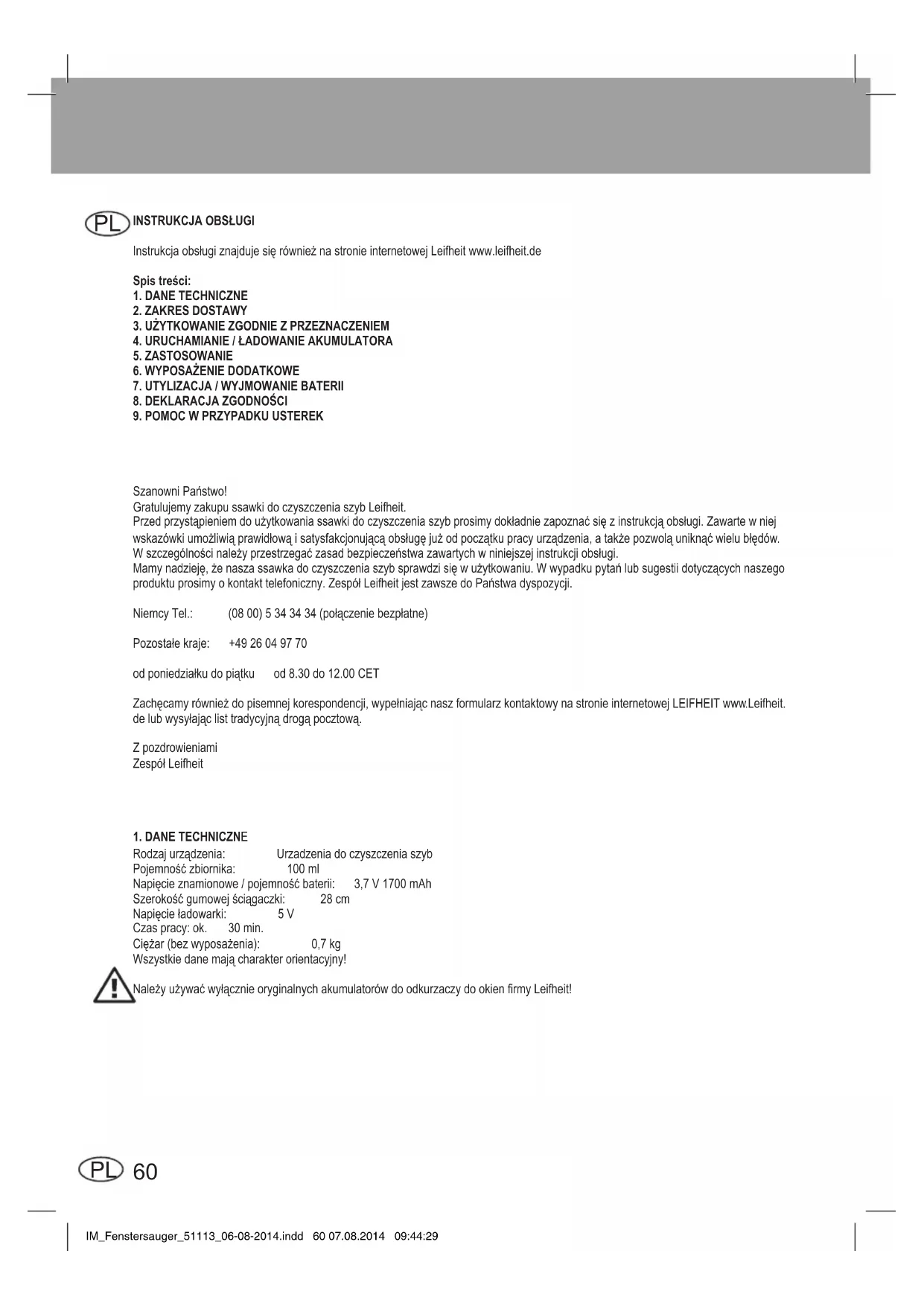 SzanowniPaństwo! Gratulujemy zakupu ssawki do czyszczenia szyb Leifheit. Przedprzystąpieniemdoużytkowaniassawkidoczyszczeniaszybprosimydokładniezapoznaćsięzinstrukcjąobsługi.Zawartewniej wskazówkiumożliwiąprawidłowąisatysfakcjonującąobsługęjużodpoczątkupracyurządzenia,atakżepozwoląuniknąćwielubłędów. Wszczególnościnależyprzestrzegaćzasadbezpieczeństwazawartychwniniejszejinstrukcjiobsługi. Mamynadzieję,żenaszassawkadoczyszczeniaszybsprawdzisięwużytkowaniu.Wwypadkupytańlubsugestiidotyczącychnaszego produktuprosimyokontakttelefoniczny.ZespółLeifheitjestzawszedoPaństwadyspozycji. NiemcyTel.: (0800)5343434(połączeniebezpłatne) Pozostałekraje: +4926049770 odponiedziałkudopiątku od8.30do12.00CET Zachęcamyrównieżdopisemnejkorespondencji,wypełniającnaszformularzkontaktowynastronieinternetowejLEIFHEITwww.Leifheit. delubwysyłająclisttradycyjnądrogąpocztową. Z pozdrowieniami ZespółLeifheit