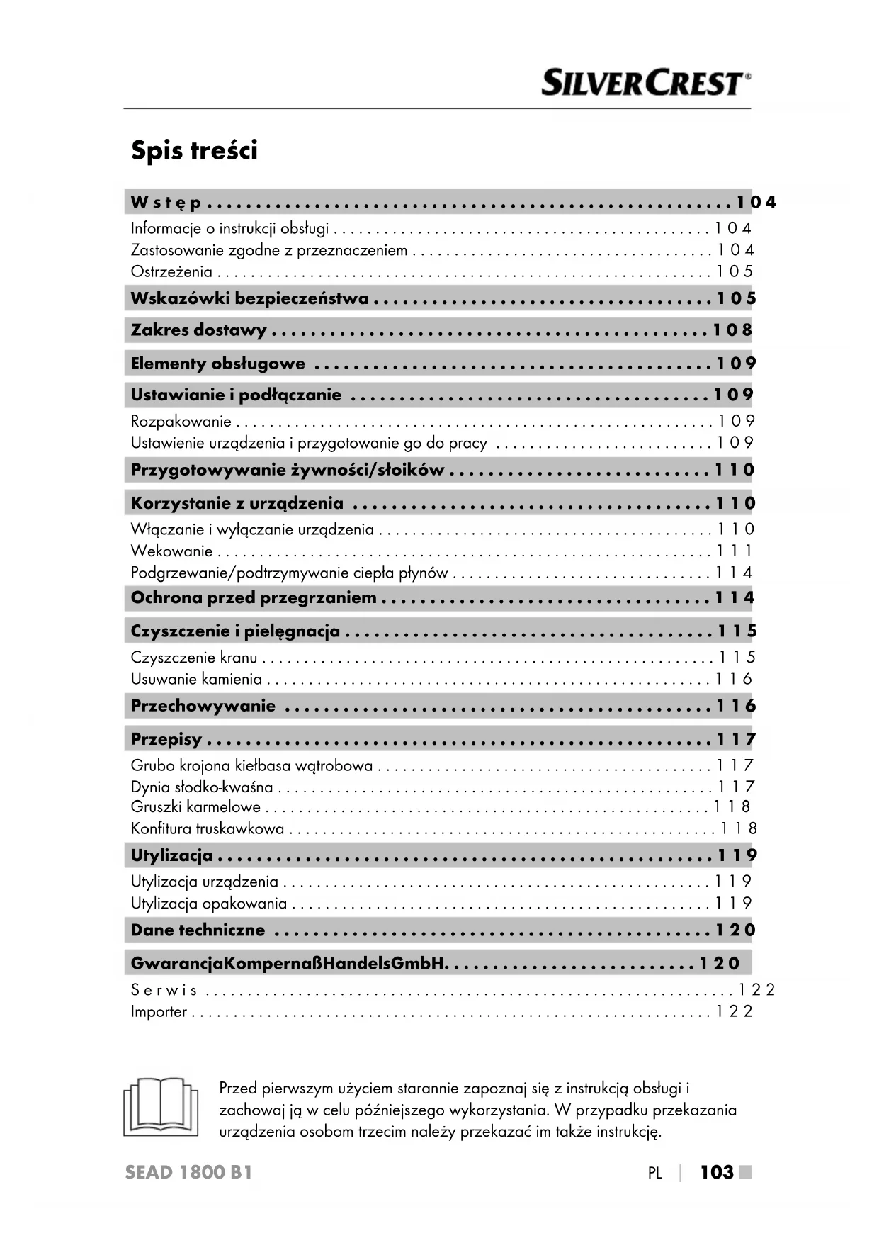 - Importer Przed pierwszym użyciem starannie zapoznaj się z instrukcją obsługi i zachowaj ją w celu późniejszego wykorzystania. Wprzypadku przekazania urządzenia osobom trzecim należy przekazać im także instrukcję. IB_444431_SEAD1800B1_LB8.indb 103 23.10.2023 13:24:11■ 104 p. 122