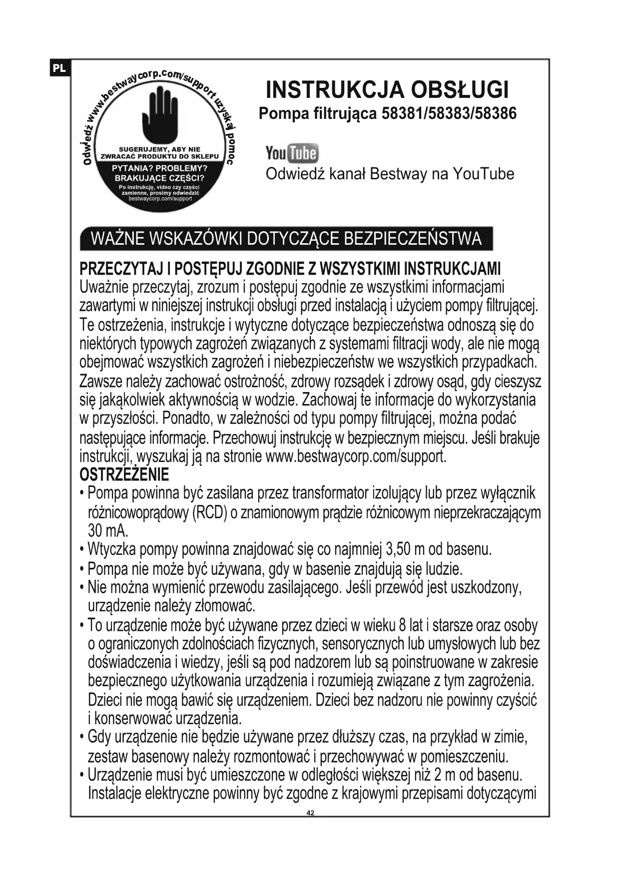 - Firma Bestway nie ponosi odpowiedzialności za jakiekolwiek uszkodzenia pompy filtrującej spowodowane niewłaściwą obsługą lub nieprzestrzeganiem tych instrukcji.