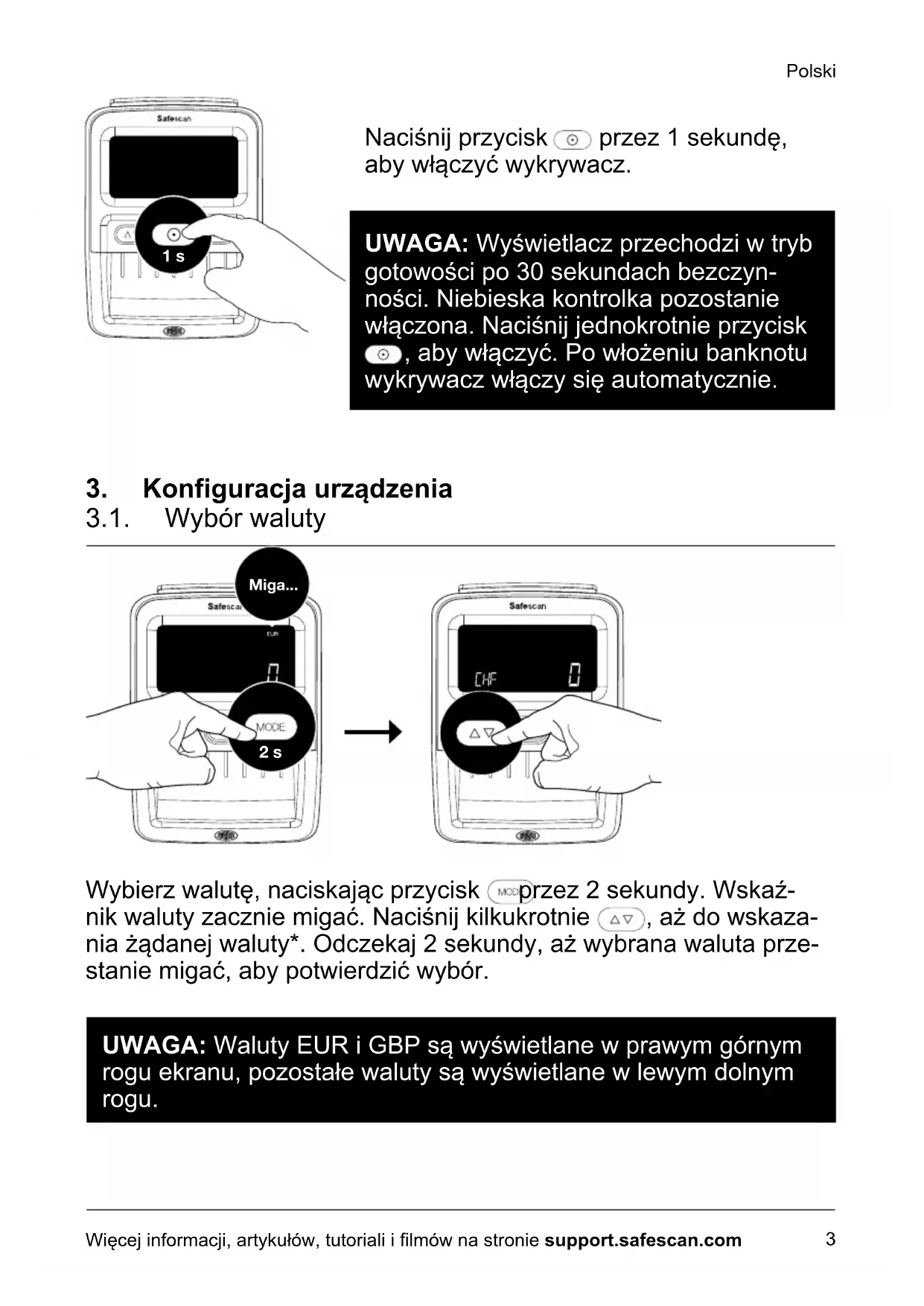 Wybierzwalutę,naciskającprzycisk przez2sekundy.Wskaź- nikwalutyzaczniemigać.Naciśnijkilkukrotnie ,ażdowskaza- niażądanejwaluty*.Odczekaj2sekundy,ażwybranawalutaprze- staniemigać,abypotwierdzićwybór.Więcej informacji, artykułów, tutoriali i lmów na stronie support.safescan.com