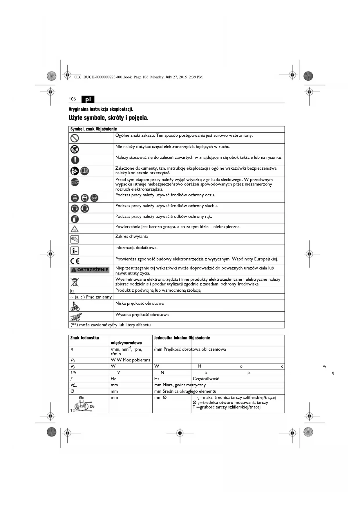 Oryginalna instrukcja eksploatacji. Użyte symbole, skróty i pojęcia. Symbol, znak Objaśnienie Ogólne znaki zakazu. Ten sposób postępowania jest surowo wzbroniony. Nie należy dotykać części elektronarzędzia będących w ruchu. Należy stosować się do zaleceń zawartych w znajdującym się obok tekście lub na rysunku! Załączone dokumenty, tzn. instrukcję eksploatacji i ogólne wskazówki bezpieczeństwa należy koniecznie przeczytać. Przed tym etapem pracy należy wyjąć wtyczkę z gniazda sieciowego. W przeciwnym wypadku istnieje niebezpieczeństwo obrażeń spowodowanych przez niezamierzony rozruch elektronarzędzia. Podczas pracy należy używać środków ochrony oczu. Podczas pracy należy używać środków ochrony słuchu. Podczas pracy należy używać środków ochrony rąk. Powierzchnia jest bardzo gorąca. a co za tym idzie – niebezpieczna. Zakres chwytania Informacja dodatkowa. Potwierdza zgodność budowy elektronarzędzia z wytycznymi Wspólnoty Europejskiej. Nieprzestrzeganie tej wskazówki może doprowadzić do poważnych urazów ciała lub nawet utraty życia. Wyeliminowane elektronarzędzia i inne produkty elektrotechniczne i elektryczne należy zbierać oddzielnie i poddać utylizacji zgodnie z zasadami ochrony środowiska. Produkt z podwójną lub wzmocnioną izolacją ~ (a. c.) Prąd zmienny Niska prędkość obrotowa Wysoka prędkość obrotowa (**) może zawierać cyfry lub litery alfabetu Znak Jednostka międzynarodowa Jednostka lokalna Objaśnienie