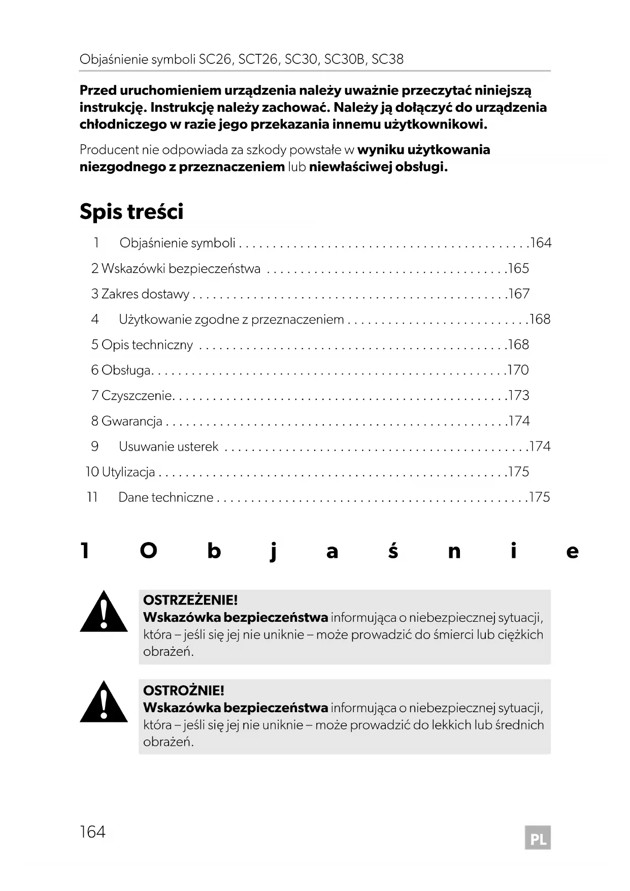 - Przed uruchomieniem urządzenia należy uważnie przeczytać niniejszą instrukcję. Instrukcję należy zachować. Należy ją dołączyć do urządzenia chłodniczego w razie jego przekazania innemu użytkownikowi. Producent nie odpowiada za szkody powstałe w wyniku użytkowania niezgodnego z przeznaczeniem lub niewłaściwej obsługi. Spis treści 1 Objaśnienie symboli p. 164