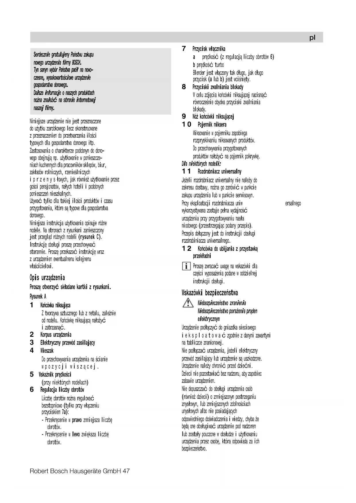 Deðiþiklikler olabilir.Robert Bosch Hausgeräte GmbH 47 Niniejsze urz¹dzenie nie jest przeznaczone do u¿ytku zarobkowego lecz skonstruowane z przeznaczeniem do przetwarzania iloœci typowych dla gospodarstwa domowego itp. Zastosowania o charakterze podobnym do domo- wego obejmuj¹ np. u¿ytkowanie w pomieszcze- niach kuchennych dla pracowników sklepów, biur, zakładów rolniczych, rzemieœlniczych iprzemysłowych, jak równie¿ u¿ytkowanie przez goœci pensjonatów, małych hoteli i podobnych pomieszczeñ mieszkalnych. U¿ywać tylko dla takiej iloœci produktów i czasu przygotowania, które s¹ typowe dla gospodarstwa domowego. Niniejsza instrukcja u¿ytkowania opisuje ró¿ne modele. Na stronach z rysunkami zamieszczony jest przegl¹d ró¿nych modeli (rysunek C). Instrukcjê obsługi proszê przechowywać starannie. Proszê przekazać instrukcjê wraz z urz¹dzeniem ewentualnemu kolejnemu właœcicielowi. Opis urz¹dzenia Proszê otworzyć składane kartki z rysunkami. Rysunek A 1 Koñcówka miksuj¹ca Z tworzywa sztucznego lub z metalu, zale¿nie od modelu. Koñcówkê miksuj¹c¹ nało¿yć i zatrzasn¹ć. 2 Korpus urz¹dzenia 3 Elektryczny przewód zasilaj¹cy 4 Wieszak Do przechowywania urz¹dzenia na œcianie wpozycji wisz¹cej. 5 WskaŸnik prêdkoœci (przy niektórych modelach) 6 Regulacja liczby obrotów Liczbê obrotów mo¿na regulować bezstopniowo (tylko przy wł¹czeniu przyciskiem 7a): – Przekrêcenie w prawo zmniejsza liczbê obrotów. – Przekrêcenie w lewo zwiêksza liczbê obrotów. 7 Przycisk wł¹cznika a prêdkoœć (z regulacj¹ liczby obrotów 6) b prêdkoœć turbo Blender jest wł¹czony tak długo, jak długo przycisk (a lub b) jest wciœniêty. 8 Przyciski zwalniania blokady W celu zdjêcia koñcówki miksuj¹cej nacisn¹ć równoczeœnie obydwa przyciski zwalniania blokady. 9 Nó¿ koñcówki miksuj¹cej 10 Pojemnik miksera Miksowanie w pojemniku zapobiega rozpryskiwaniu miksowanych produktów. Do przechowywania przygotowanych produktów nało¿yć na pojemnik pokrywkê. Dla niektórych modeli: 11 Rozdrabniacz uniwersalny Je¿eli rozdrabniacz uniwersalny nie nale¿y do zakresu dostawy, mo¿na go zamówić w punkcie zakupu urz¹dzenia lub w punkcie serwisowym. Przy eksploatacji rozdrabniacza uniw ersalnego wykorzystywana zostaje pełna wydajnoœć urz¹dzenia przy przygotowywaniu masła miodowego (przestrzegaj¹c podany przepis). Przepis doł¹czony jest do instrukcji obsługi rozdrabiniacza uniwersalnego. 12 Koñcówka do ubijania z przystawk¹ przekładni Proszê zwracać uwagê na wskazówki dla czêœci wyposa¿enia podane w oddzielnej instrukcji obsługi. Wskazówki bezpieczeñstwa Niebezpieczeñstwo zranienia Niebezpieczeñstwo pora¿enia pr¹dem elektrycznym Urz¹dzenie podł¹czyć do gniazdka sieciowego ieksploatować zgodnie z danymi zawartymi na tabliczce znamionowej. Nie podł¹czać urz¹dzenia, je¿eli elektryczny przewód zasilaj¹cy lub urz¹dzenie s¹ uszkodzone. Urz¹dzenie nale¿y chronić przed dziećmi. Dzieci nie pozostawiać bez nadzoru, aby zapobiec zabawie urz¹dzeniem. Nie dopuszczać do obsługi urz¹dzenia osób (równie¿ dzieci) o zmniejszonym postrzeganiu zmysłowym, lub zmniejszonych zdolnoœciach umysłowych albo nie posiadaj¹cych odpowiedniego doœwiadczenia i wiedzy, chyba ¿e bêd¹ one obsługiwać urz¹dzenie pod nadzorem lub zostały pouczone w obsłudze i u¿ytkowaniu urz¹dzenia przez osobê, która odpowiada za ich bezpieczeñstwo.