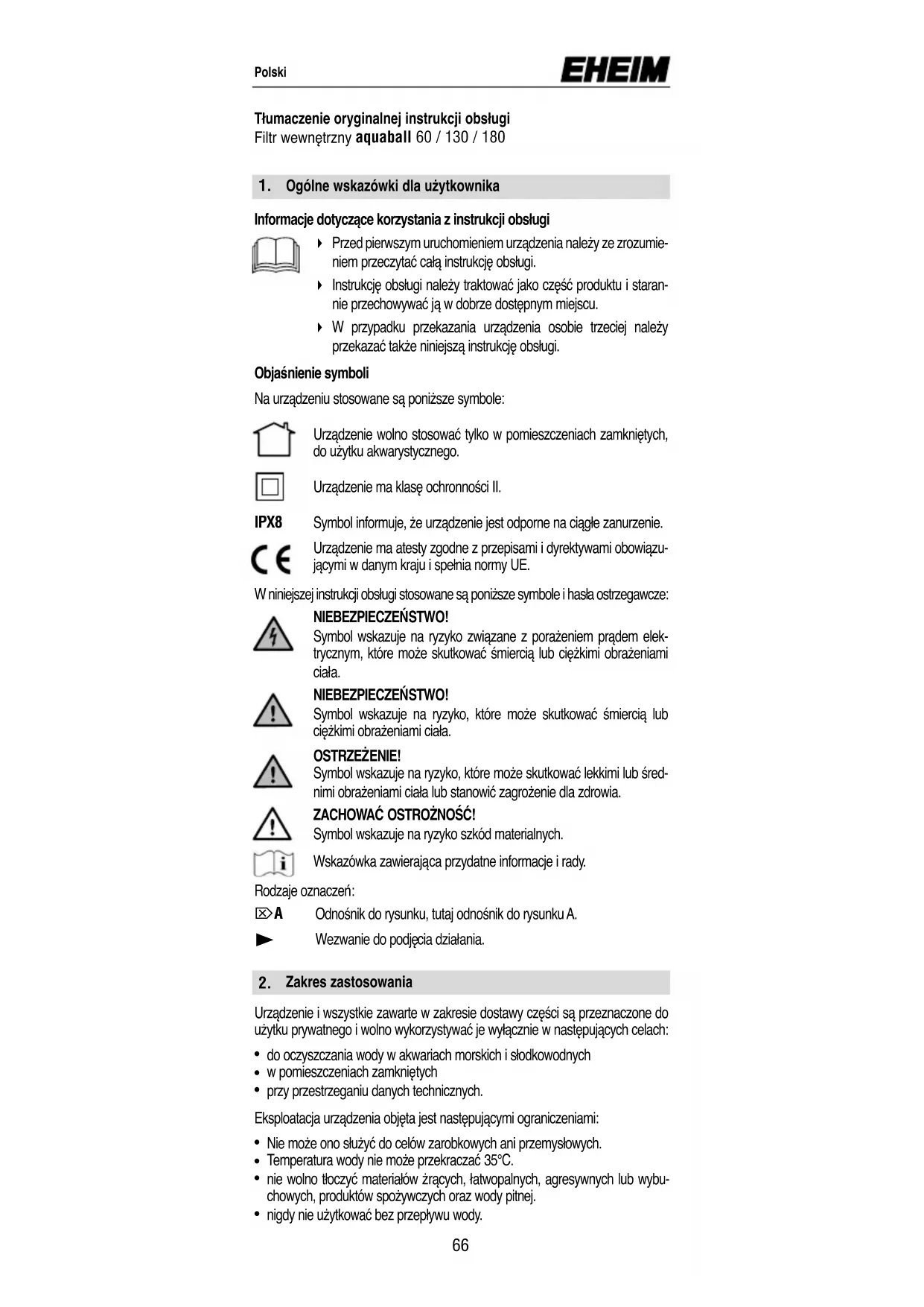 Üzemen kívül helyezés és ártalmatlanítás1. Ogólne wskazówki dla użytkownika Informacje dotyczące korzystania z instrukcji obsługi 4 Przed pierwszym uruchomieniem urządzenia należy ze zrozumie- niem przeczytać całą instrukcję obsługi. 4 Instrukcję obsługi należy traktować jako część produktu i staran- nie przechowywać ją w dobrze dostępnym miejscu. 4 W przypadku przekazania urządzenia osobie trzeciej należy przekazać także niniejszą instrukcję obsługi. Objaśnienie symboli Na urządzeniu stosowane są poniższe symbole: Urządzenie wolno stosować tylko w pomieszczeniach zamkniętych, do użytku akwarystycznego. Urządzenie ma klasę ochronności II. IPX8 Symbol informuje, że urządzenie jest odporne na ciągłe zanurzenie. Urządzenie ma atesty zgodne z przepisami i dyrektywami obowiązu- jącymi w danym kraju i spełnia normy UE. W niniejszej instrukcji obsługi stosowane są poniższe symbole i hasła ostrzegawcze: NIEBEZPIECZEŃSTWO! Symbol wskazuje na ryzyko związane z porażeniem prądem elek- trycznym, które może skutkować śmiercią lub ciężkimi obrażeniami ciała. NIEBEZPIECZEŃSTWO! Symbol wskazuje na ryzyko, które może skutkować śmiercią lub ciężkimi obrażeniami ciała. OSTRZEŻENIE! Symbol wskazuje na ryzyko, które może skutkować lekkimi lub śred- nimi obrażeniami ciała lub stanowić zagrożenie dla zdrowia. ZACHOWAĆ OSTROŻNOŚĆ! Symbol wskazuje na ryzyko szkód materialnych. Wskazówka zawierająca przydatne informacje i rady