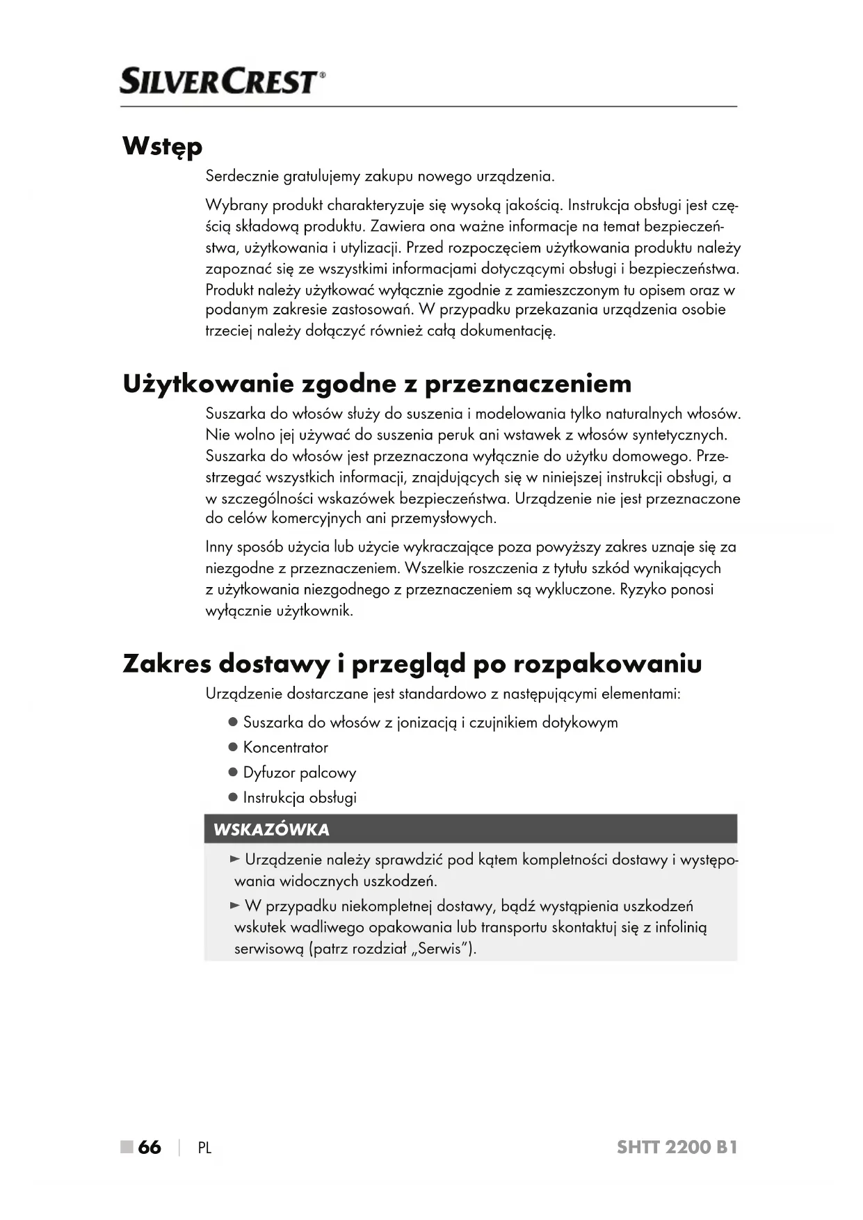 PL SHTT 2200 B1 Wstęp Serdecznie gratulujemy zakupu nowego urządzenia. Wybrany produkt charakteryzuje się wysoką jakością. Instrukcja obsługi jest czę- ścią składową produktu. Zawiera ona ważne informacje na temat bezpieczeń- stwa, użytkowania i utylizacji. Przed rozpoczęciem użytkowania produktu należy zapoznać się ze wszystkimi informacjami dotyczącymi obsługi i bezpieczeństwa. Produkt należy użytkować wyłącznie zgodnie z zamieszczonym tu opisem oraz w podanym zakresie zastosowań. W przypadku przekazania urządzenia osobie trzeciej należy dołączyć również całą dokumentację. Użytkowanie zgodne z przeznaczeniem Suszarka do włosów służy do suszenia i modelowania tylko naturalnych włosów. Nie wolno jej używać do suszenia peruk ani wstawek z włosów syntetycznych. Suszarka do włosów jest przeznaczona wyłącznie do użytku domowego. Prze- strzegać wszystkich informacji, znajdujących się w niniejszej instrukcji obsługi, a w szczególności wskazówek bezpieczeństwa. Urządzenie nie jest przeznaczone do celów komercyjnych ani przemysłowych. Inny sposób użycia lub użycie wykraczające poza powyższy zakres uznaje się za niezgodne z przeznaczeniem. Wszelkie roszczenia z tytułu szkód wynikających z użytkowania niezgodnego z przeznaczeniem są wykluczone. Ryzyko ponosi wyłącznie użytkownik. Zakres dostawy i przegląd po rozpakowaniu Urządzenie dostarczane jest standardowo z następującymi elementami: ▯ Suszarka do włosów z jonizacją i czujnikiem dotykowym ▯ Koncentrator ▯ Dyfuzor palcowy ▯ Instrukcja obsługi WSKAZÓWKA ► Urządzenie należy sprawdzić pod kątem kompletności dostawy i występo- wania widocznych uszkodzeń. ► W przypadku niekompletnej dostawy, bądź wystąpienia uszkodzeń wskutek wadliwego opakowania lub transportu skontaktuj się z infolinią serwisową (patrz rozdział „Serwis”).PL