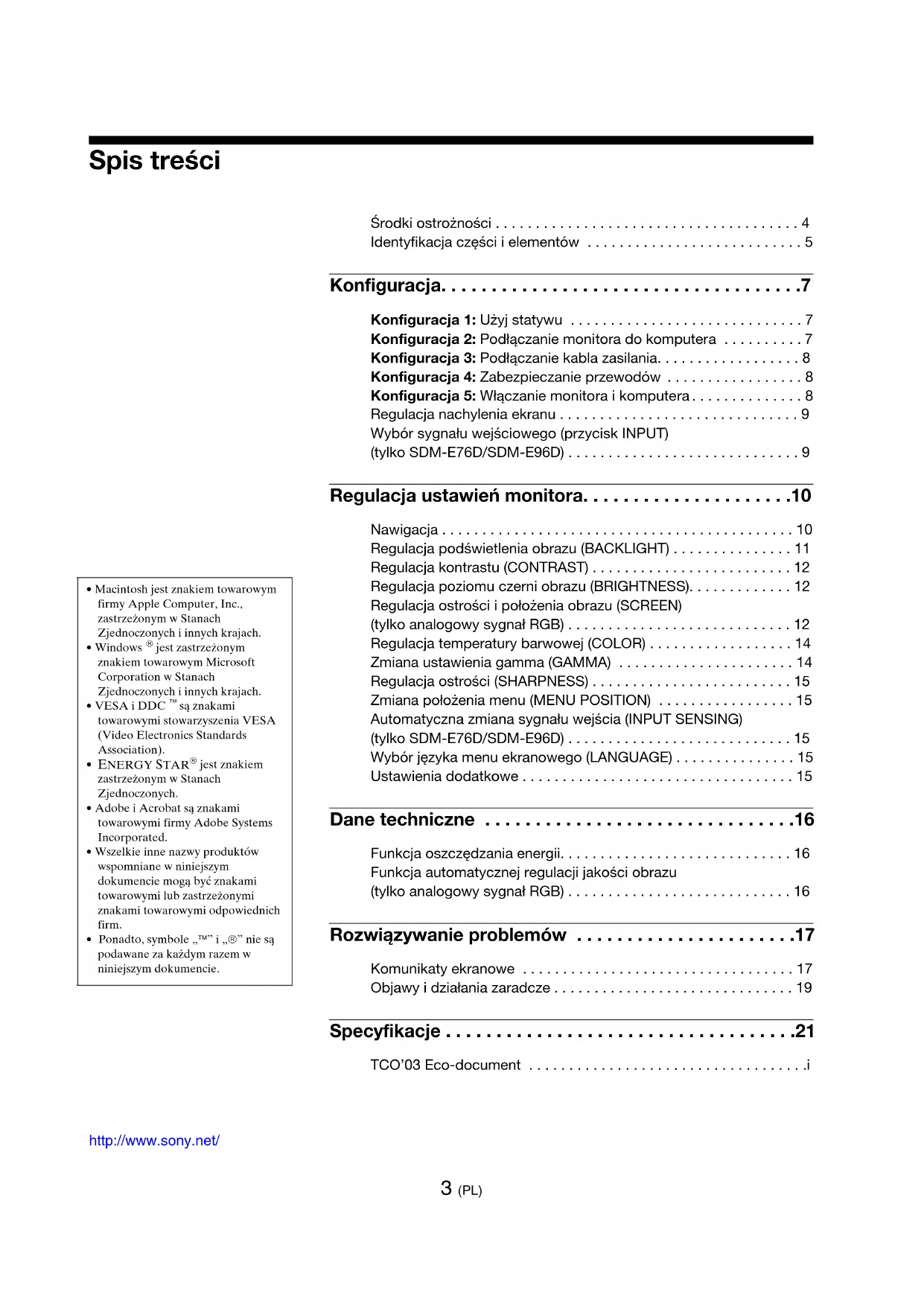 - Ponadto, symbole „™” i „®” nie są podawane za każdym razem w niniejszym dokumencie. http://www.sony.net/ 3 (PL) Środki ostrożności . . . . . . . . . . . . . . . . . . . . . . . . . . . . . . . . . . . . . . 4 Identyfikacja części i elementów . . . . . . . . . . . . . . . . . . . . . . . . . . . 5 Konfiguracja. . . . . . . . . . . . . . . . . . . . . . . . . . . . . . . . . . . .7 Konfiguracja 1: Użyj statywu . . . . . . . . . . . . . . . . . . . . . . . . . . . . . 7 Konfiguracja 2: Podłączanie monitora do komputera . . . . . . . . . . 7 Konfiguracja 3: Podłączanie kabla zasilania. . . . . . . . . . . . . . . . . . 8 Konfiguracja 4: Zabezpieczanie przewodów . . . . . . . . . . . . . . . . . 8 Konfiguracja 5: Włączanie monitora i komputera . . . . . . . . . . . . . . 8 Regulacja nachylenia ekranu . . . . . . . . . . . . . . . . . . . . . . . . . . . . . . 9 Wybór sygnału wejściowego (przycisk INPUT) (tylko SDM-E76D/SDM-E96D) . . . . . . . . . . . . . . . . . . . . . . . . . . . . . 9 Regulacja ustawień monitora. . . . . . . . . . . . . . . . . . . . .10 Nawigacja . . . . . . . . . . . . . . . . . . . . . . . . . . . . . . . . . . . . . . . . . . . . 10 Regulacja podświetlenia obrazu (BACKLIGHT) . . . . . . . . . . . . . . . 11 Regulacja kontrastu (CONTRAST) . . . . . . . . . . . . . . . . . . . . . . . . . 12 Regulacja poziomu czerni obrazu (BRIGHTNESS). . . . . . . . . . . . . 12 Regulacja ostrości i położenia obrazu (SCREEN) (tylko analogowy sygnał RGB) . . . . . . . . . . . . . . . . . . . . . . . . . . . . 12 Regulacja temperatury barwowej (COLOR) . . . . . . . . . . . . . . . . . . 14 Zmiana ustawienia gamma (GAMMA) . . . . . . . . . . . . . . . . . . . . . . 14 Regulacja ostrości (SHARPNESS) . . . . . . . . . . . . . . . . . . . . . . . . . 15 Zmiana położenia menu (MENU POSITION) . . . . . . . . . . . . . . . . . 15 Automatyczna zmiana sygnału wejścia (INPUT SENSING) (tylko SDM-E76D/SDM-E96D) . . . . . . . . . . . . . . . . . . . . . . . . . . . . 15 Wybór języka menu ekranowego (LANGUAGE) . . . . . . . . . . . . . . . 15 Ustawienia dodatkowe . . . . . . . . . . . . . . . . . . . . . . . . . . . . . . . . . . 15 Dane techniczne . . . . . . . . . . . . . . . . . . . . . . . . . . . . . . .16 Funkcja oszczędzania energii. . . . . . . . . . . . . . . . . . . . . . . . . . . . . 16 Funkcja automatycznej regulacji jakości obrazu (tylko analogowy sygnał RGB) . . . . . . . . . . . . . . . . . . . . . . . . . . . . 16 Rozwiązywanie problemów . . . . . . . . . . . . . . . . . . . . . .17 Komunikaty ekranowe . . . . . . . . . . . . . . . . . . . . . . . . . . . . . . . . . . 17 Objawy i działania zaradcze . . . . . . . . . . . . . . . . . . . . . . . . . . . . . . 19 Specyfikacje . . . . . . . . . . . . . . . . . . . . . . . . . . . . . . . . . . .21 TCO’03 Eco-document . . . . . . . . . . . . . . . . . . . . . . . . . . . . . . . . . . .i4 (PL) Środki ostrożności Ostrzeżenie dotyczące podłączania zasilania
