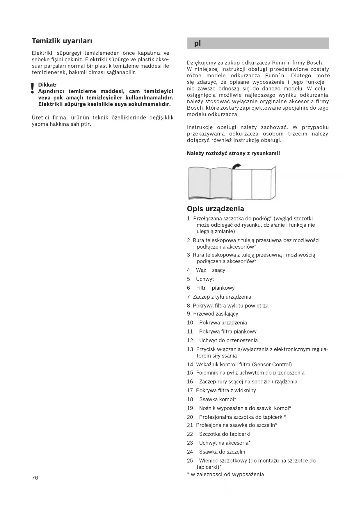 Dziękujemy za zakup odkurzacza Runn`n firmy Bosch. W niniejszej instrukcji obsługi przedstawione zostały różne modele odkurzacza Runn`n. Dlatego może się zdarzyć, że opisane wyposażenie i jego funkcje nie zawsze odnoszą się do danego modelu. W celu osiągnięcia możliwie najlepszego wyniku odkurzania należy stosować wyłącznie oryginalne akcesoria firmy Bosch, które zostały zaprojektowane specjalnie do tego modelu odkurzacza. Instrukcję obsługi należy zachować. W przypadku przekazywania odkurzacza osobom trzecim należy dołączyć również instrukcję obsługi. Należy rozłożyć strony z rysunkami! Opis urządzenia 1 Przełączana szczotka do podłóg* (wygląd szczotki może odbiegać od rysunku, działanie i funkcja nie ulegają zmianie) 2 Rura teleskopowa z tuleją przesuwną bez możliwości podłączenia akcesoriów* 3 Rura teleskopowa z tuleją przesuwną i możliwością podłączenia akcesoriów* 4 Wąż ssący 5 Uchwyt 6 Filtr piankowy 7 Zaczep z tyłu urządzenia 8 Pokrywa filtra wylotu powietrza 9 Przewód zasilający 10 Pokrywa urządzenia 11 Pokrywa filtra piankowy 12 Uchwyt do przenoszenia 13 Przycisk włączania/wyłączania z elektronicznym regula- torem siły ssania 14 Wskaźnik kontroli filtra (Sensor Control) 15 Pojemnik na pył z uchwytem do przenoszenia 16 Zaczep rury ssącej na spodzie urządzenia 17 Pokrywa filtra z włókniny 18 Ssawka kombi* 19 Nośnik wyposażenia do ssawki kombi* 20 Profesjonalna szczotka do tapicerki* 21 Profesjonalna ssawka do szczelin* 22 Szczotka do tapicerki 23 Uchwyt na akcesoria* 24 Ssawka do szczelin 25 Wieniec szczotkowy (do montażu na szczotce do tapicerki)*