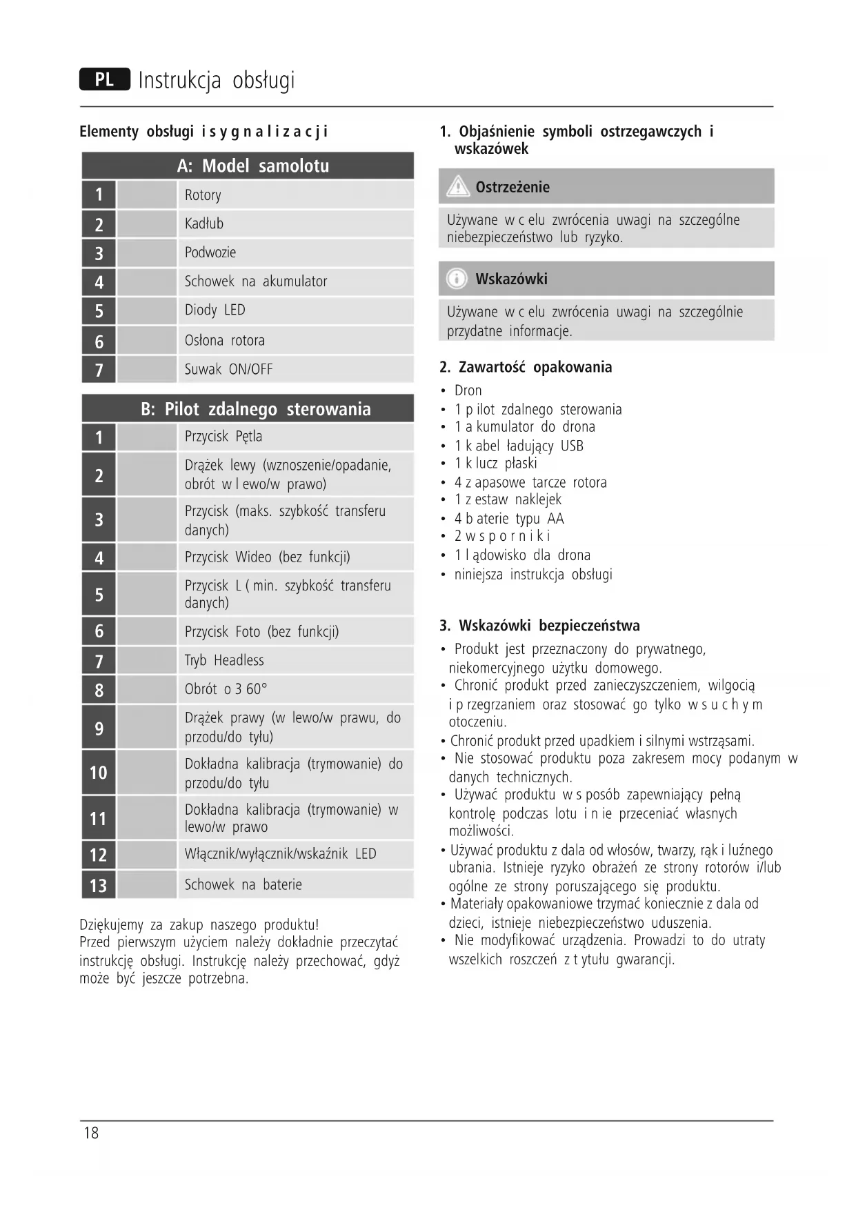 Problem Możliwa przyczyna Usuwanie usterki Dron zatrzymuje się bez oczywistego powodu i/lub nie startuje. Bateria drona jest słaba lub rozładowana. Całkowicie naładować baterię drona. Baterie pilota zdalnego sterowania są słabe lub rozładowane. Sprawdzić baterie pilota zdalnego sterowania iwrazie potrzeby wymienić je na nowe. Rotory drona nie poruszają się. Akumulator drona jest nieprawidłowo połączony zdronem. Sprawdzić połączenie akumulatora zdronem. Bateria drona jest słaba lub rozładowana. Całkowicie naładować baterię drona. Baterie pilota zdalnego sterowania są słabe lub rozładowane. Sprawdzić baterie pilota zdalnego sterowania iwrazie potrzeby wymienić je na nowe. Dron obraca się tylko wokół oso pionowej, koziołkuje inie startuje. Śmigła drona są uszkodzone lub niewłaściwie dopasowane. Sprawdzić śmigła. Sprawdzić przyporządkowanie śmigieł i zamontować je wraziepotrzeby zgodnie zopisem wrozdziale 7.6. Wymiana tarcz rotora. Dron mocno ciągnie wjednym kierunku. Kalibracja drona jest nieprawidłowa. Przeprowadzić dokładną kalibrację, zgodnie zopisem wrozdziale 7.3 Dokładna kalibracja sterowania (trymowanie). Dron nie wykonuje pętli. Poziom naładowania akumulatora jest zbyt niski. Całkowicie naładować baterię drona.25
