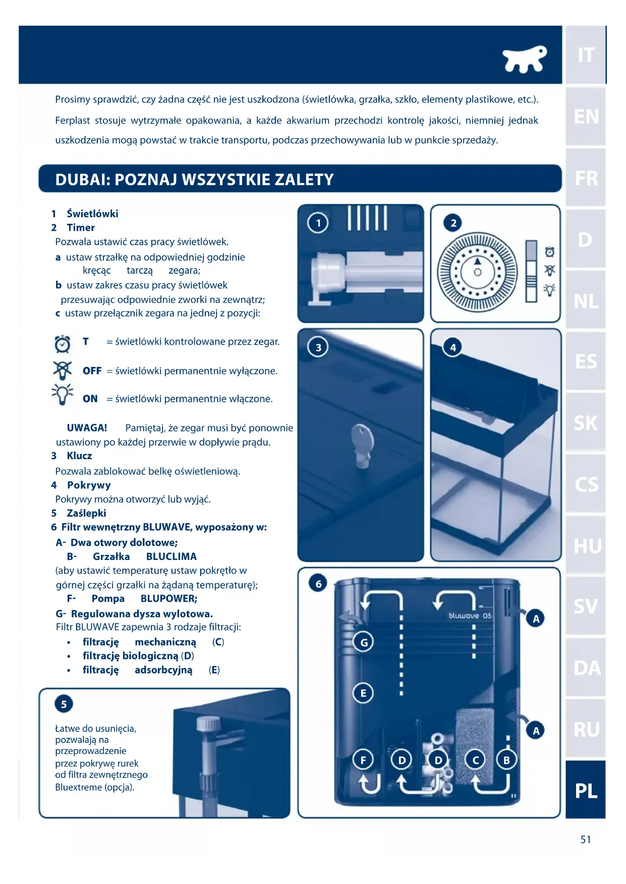Prosimy sprawdzić,czyżadna czȩść nie jest uszkodzona (swietłowka, grz空气质量, szkło, elementy plastikowe, etc.). Ferplast stosuje wytrzymały opakowania, a kaźde akwarium przechodzi kontrôle jakosci, niemniej"Justukuszkodzenia mogą powstać w trakcie transportu, podczas przechowywania lub w punkcie sprezaź.