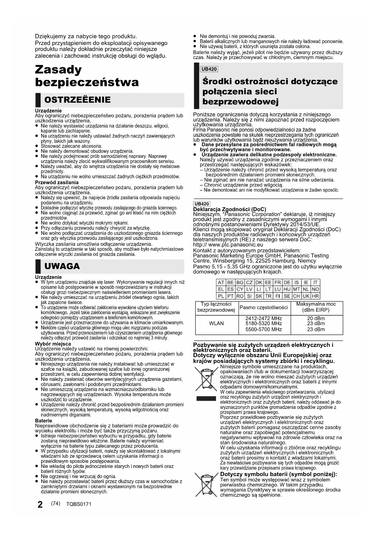 Nie wkładaj do pilota jednocześnie starych i nowych baterii oraz baterii różnych typów. Nie ogrzewaj i nie wrzucaj do ognia. Nie należy pozostawiać baterii przez dłuższy czas w samochodzie z zamkniętymi drzwiami i oknami wystawionym na bezpośrednie działanie promieni słonecznych. Nie demontuj i nie powoduj zwarcia. Baterii alkalicznych lub manganowych nie należy ładować ponownie. Nie używaj baterii, z których usunięta została osłona.Baterie należy wyjąć, jeżeli pilot nie będzie używany przez dłuższy czas. Należy je przechowywać w chłodnym, ciemnym miejscu. Poniższe ograniczenia dotyczą korzystania z niniejszego urządzenia. Należy się z nimi zapoznać przed rozpoczęciem użytkowania urządzenia. Firma Panasonic nie ponosi odpowiedzialności za żadne uszkodzenia powstałe na skutek nieprzestrzegania tych ograniczeń lub warunków użytkowania bądź nieużywania urządzenia. ≥ Dane przesyłane za pośrednictwem fal radiowych mogą być przechwytywane i monitorowane.≥ Urządzenie zawiera delikatne podzespoły elektroniczne.Należy używać urządzenia zgodnie z przeznaczeniem oraz przestrzegać następujących wskazówek:– Urządzenie należy chronić przed wysoką temperaturą oraz bezpośrednim działaniem promieni słonecznych.– Nie zginać ani nie narażać urządzenia na silne uderzenia.– Chronić urządzenie przed wilgocią.– Nie demontować ani nie modyfikować urządzenia w żaden sposób. Pozbywanie się zużytych urządzeń elektrycznych i elektronicznych oraz baterii. Dotyczy wyłącznie obszaru Unii Europejskiej oraz krajów posiadających systemy zbiórki i recyklingu. Niniejsze symbole umieszczane na produktach, opakowaniach i/lub w dokumentacji towarzyszącej oznaczają, że nie wolno mieszać zużytych urządzeń elektrycznych i elektronicznych oraz baterii z innymi odpadami domowymi/komunalnymi.W celu zapewnienia właściwego przetwarzania, utylizacji oraz recyklingu zużytych urządzeń elektrycznych i elektronicznych oraz zużytych baterii, należy oddawać je do wyznaczonych punktów gromadzenia odpadów zgodnie z przepisami prawa krajowego.Poprzez prawidłowe pozbywanie się zużytych urządzeń elektrycznych i elektronicznych oraz zużytych baterii pomagasz oszczędzać cenne zasoby naturalne oraz zapobiegać potencjalnemu negatywnemu wpływowi na zdrowie człowieka oraz na stan środowiska naturalnego.W celu uzyskania informacji o zbiórce oraz recyklingu zużytych urządzeń elektrycznych i elektronicznych oraz baterii prosimy o kontakt z władzami lokalnymi.Za niewłaściwe pozbywanie się tych odpadów mogą grozić kary przewidziane przepisami prawa krajowego. Dotyczy symbolu baterii (symbol poniżej): Ten symbol może występować wraz z symbolem pierwiastka chemicznego. W takim przypadku wymagania Dyrektywy w sprawie określonego środka chemicznego są spełnione. OSTRZEËENIE UWAGA [UB420] Środki ostrożności dotyczące połączenia sieci bezprzewodowej [UB420] Deklaracja Zgodności (DoC) Niniejszym, “Panasonic Corporation” deklaruje, iż niniejszy produkt jest zgodny z zasadniczymi wymogami i innymi odnośnymi postanowieniami Dyrektywy 2014/53/UE. Klienci mogą skopiować oryginał Deklaracji Zgodności (DoC) dla naszych produktów radiowych i końcowych urządzeń teletransmisyjnych (RE) z naszego serwera DoC: http:// www.ptc.panasonic.eu Kontakt z autoryzowanym przedstawicielem: Panasonic Marketing Europe GmbH, Panasonic Testing Centre, Winsbergring 15, 22525 Hamburg, Niemcy Pasmo 5,15 - 5,35 GHz ograniczone jest do użytku wyłącznie domowego w następujących krajach. Typ łączności bezprzewodowejPasmo częstotliwościMaksymalna moc(dBm EIRP) WLAN 2412-2472 MHz5180-5320 MHz5500-5700 MHz20 dBm23 dBm23 dBm (74) TQBS0171-Safety_pol.fm 2 ページ 2018年2月26日 月曜日 午後5時13分Polski TQBS0171 Spis treści Zasady bezpieczeństwa. . . . . . . . 2 Akcesoria . . . . . . . . . . . . . . . . . . . 3 Przewodnik po funkcjach sterowania