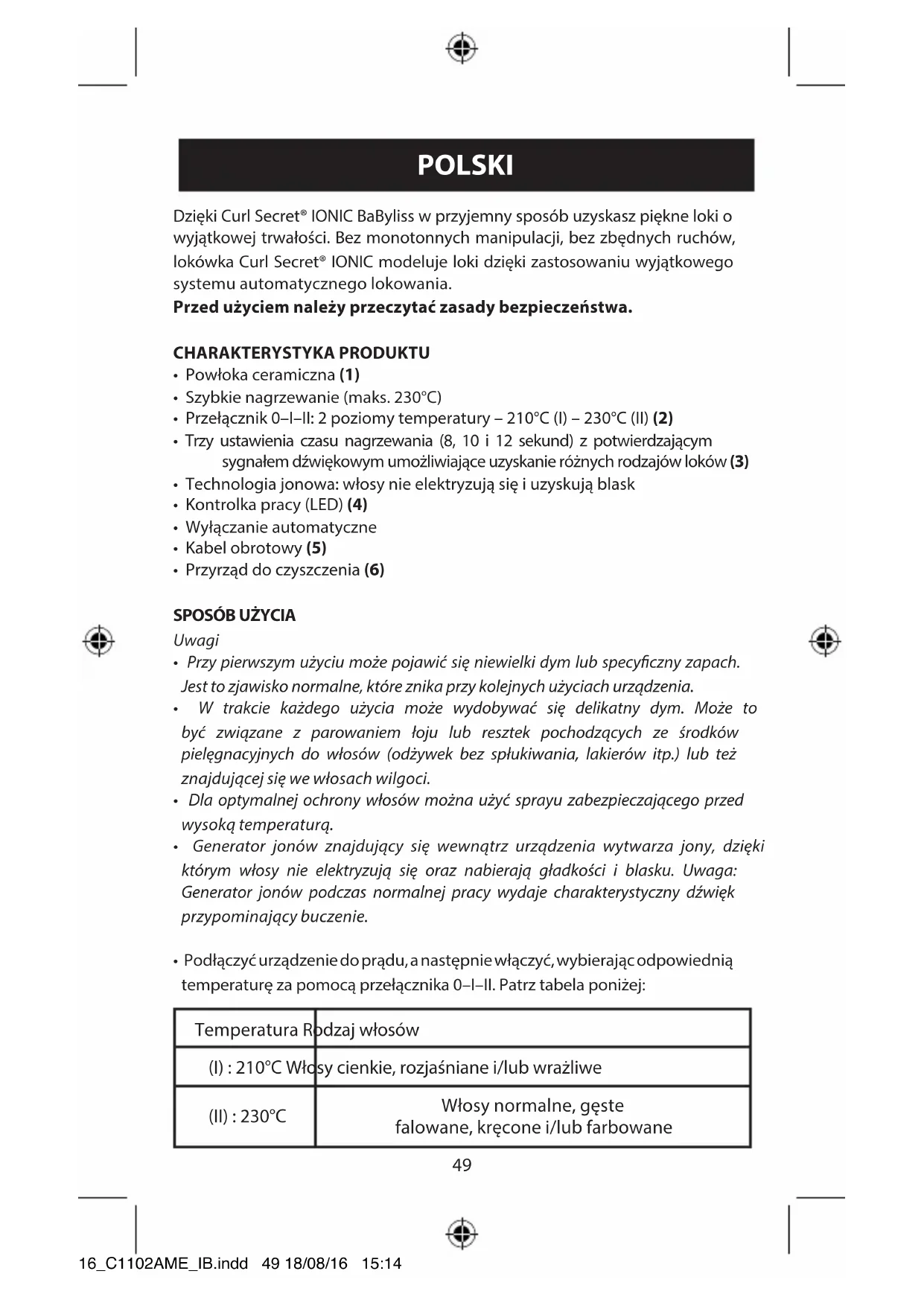 - Podłączyć urządzenie do prądu, a następnie włączyć, wybierając odpowiednią temperaturę za pomocą przełącznika 0–I–II. Patrz tabela poniżej: Temperatura Rodzaj włosów (I) : 210°C Włosy cienkie, rozjaśniane i/lub wrażliwe (II) : 230°C Włosy normalne, gęste falowane, kręcone i/lub farbowane 16_C1102AME_IB.indd 49 18/08/16 15:1450