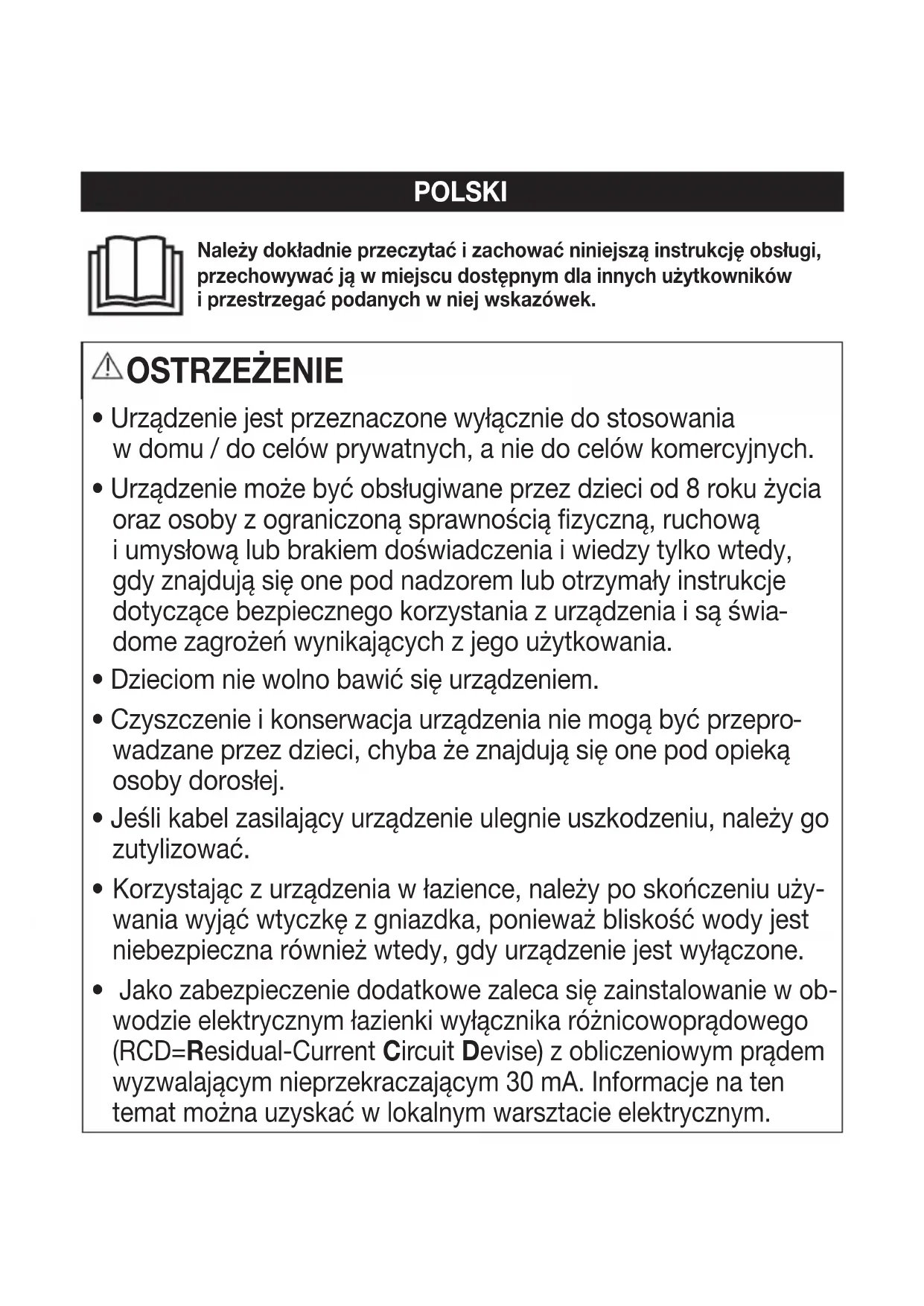 Jako zabezpieczenie dodatkowe zaleca się zainstalowanie wob- wodzie elektrycznym łazienki wyłącznika różnicowoprądowego (RCD=Residual-Current Circuit Devise) zobliczeniowym prądem wyzwalającym nieprzekraczającym 30 mA. Informacje na ten temat można uzyskać wlokalnym warsztacie elektrycznym. Należy dokładnie przeczytać izachować niniejszą instrukcję obsługi, przechowywać ją wmiejscu dostępnym dla innych użytkowników iprzestrzegać podanych wniej wskazówek.72