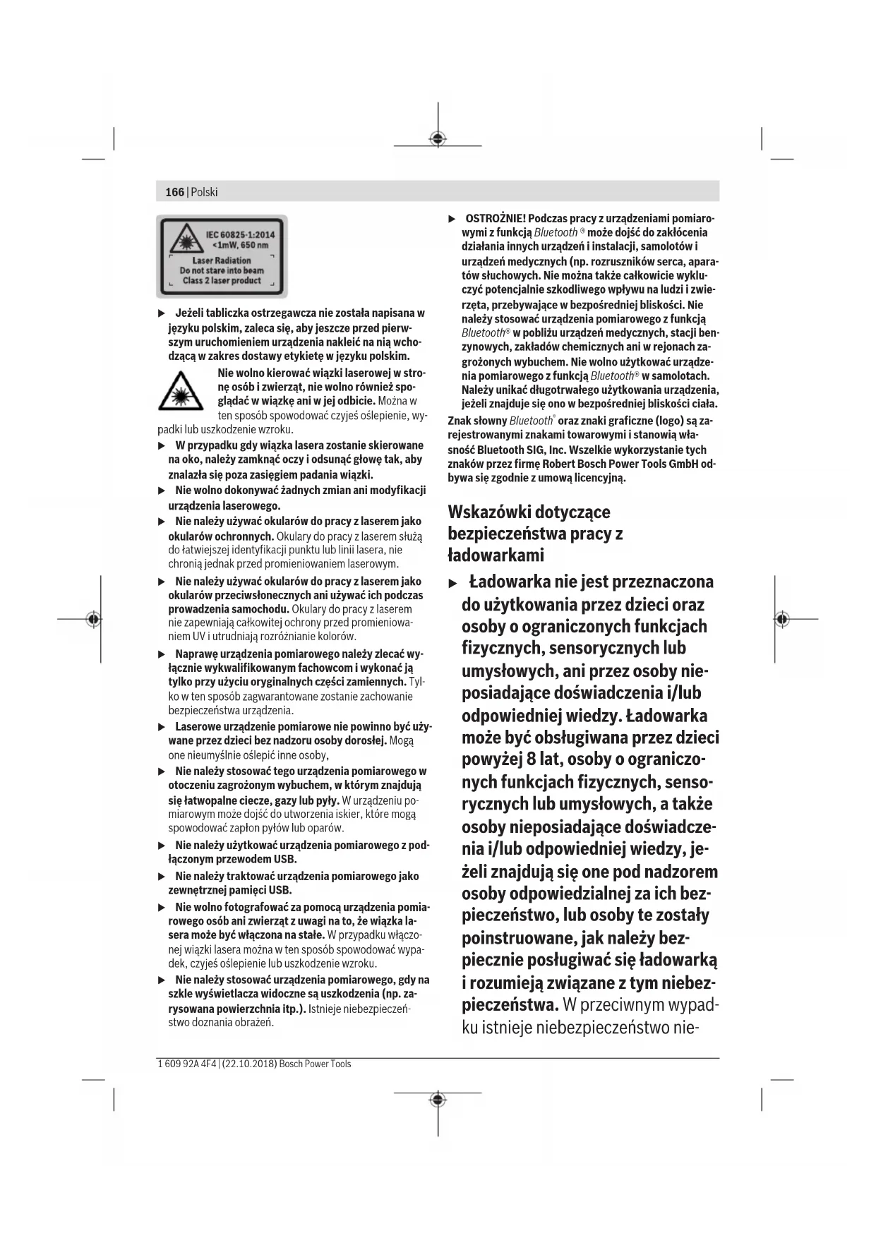 ZÓWKI, A ODDAJĄC LUB SPRZEDAJĄC URZĄDZENIE PO- MIAROWE, PRZEKAZAĆ JE NOWEMU UŻYTKOWNIKOWI. u Ostrożnie: Użycie innych, niż podane w niniejszej in- strukcji, elementów obsługowych iregulacyjnych oraz zastosowanie innych metod postępowania może pro- wadzić do niebezpiecznej ekspozycji na promieniowa- nie laserowe. W zakres dostawy urządzenia pomiarowego wchodzi ta- bliczka ostrzegawcza (na schemacie elektronarzędzia znajdującym się na stronie graficznej oznaczona jest ona numerem (14) ). Polski | 165 Bosch Power Tools 1 609 92A 4F4 | (22.10.2018)166 | Polski 1 609 92A 4F4 | (22.10.2018) Bosch Power Tools u Jeżeli tabliczka ostrzegawcza nie została napisana w języku polskim, zaleca się, aby jeszcze przed pierw- szym uruchomieniem urządzenia nakleić na nią wcho- dzącą w zakres dostawy etykietę w języku polskim. Nie wolno kierować wiązki laserowej wstro- nę osób i zwierząt, nie wolno również spo- glądać w wiązkę ani w jej odbicie. Można w ten sposób spowodować czyjeś oślepienie, wy- padki lub uszkodzenie wzroku. u W przypadku gdy wiązka lasera zostanie skierowane na oko, należy zamknąć oczy i odsunąć głowę tak, aby znalazła się poza zasięgiem padania wiązki. u Nie wolno dokonywać żadnych zmian ani modyfikacji urządzenia laserowego. u Nie należy używać okularów do pracy z laserem jako okularów ochronnych. Okulary do pracy z laserem służą do łatwiejszej identyfikacji punktu lub linii lasera, nie chronią jednak przed promieniowaniem laserowym. u Nie należy używać okularów do pracy z laserem jako okularów przeciwsłonecznych ani używać ich podczas prowadzenia samochodu. Okulary do pracy z laserem nie zapewniają całkowitej ochrony przed promieniowa- niem UV i utrudniają rozróżnianie kolorów. u Naprawę urządzenia pomiarowego należy zlecać wy- łącznie wykwalifikowanym fachowcom i wykonać ją tylko przy użyciu oryginalnych części zamiennych. Tyl- ko w ten sposób zagwarantowane zostanie zachowanie bezpieczeństwa urządzenia. u Laserowe urządzenie pomiarowe nie powinno być uży- wane przez dzieci bez nadzoru osoby dorosłej. Mogą one nieumyślnie oślepić inne osoby, u Nie należy stosować tego urządzenia pomiarowego w otoczeniu zagrożonym wybuchem, wktórym znajdują się łatwopalne ciecze, gazy lub pyły. W urządzeniu po- miarowym może dojść do utworzenia iskier, które mogą spowodować zapłon pyłów lub oparów. u Nie należy użytkować urządzenia pomiarowego z pod- łączonym przewodem USB. u Nie należy traktować urządzenia pomiarowego jako zewnętrznej pamięci USB. u Nie wolno fotografować za pomocą urządzenia pomia- rowego osób ani zwierząt z uwagi na to, że wiązka la- sera może być włączona na stałe. W przypadku włączo- nej wiązki lasera można w ten sposób spowodować wypa- dek, czyjeś oślepienie lub uszkodzenie wzroku. u Nie należy stosować urządzenia pomiarowego, gdy na szkle wyświetlacza widoczne są uszkodzenia (np. za- rysowana powierzchnia itp.). Istnieje niebezpieczeń- stwo doznania obrażeń. u OSTROŻNIE! Podczas pracy z urządzeniami pomiaro- wymi z funkcją Bluetooth ® może dojść do zakłócenia działania innych urządzeń i instalacji, samolotów i urządzeń medycznych (np. rozruszników serca, apara- tów słuchowych. Nie można także całkowicie wyklu- czyć potencjalnie szkodliwego wpływu na ludzi i zwie- rzęta, przebywające w bezpośredniej bliskości. Nie należy stosować urządzenia pomiarowego z funkcją Bluetooth® w pobliżu urządzeń medycznych, stacji ben- zynowych, zakładów chemicznych ani w rejonach za- grożonych wybuchem. Nie wolno użytkować urządze- nia pomiarowego z funkcją Bluetooth® w samolotach. Należy unikać długotrwałego użytkowania urządzenia, jeżeli znajduje się ono w bezpośredniej bliskości ciała. Znak słowny Bluetooth