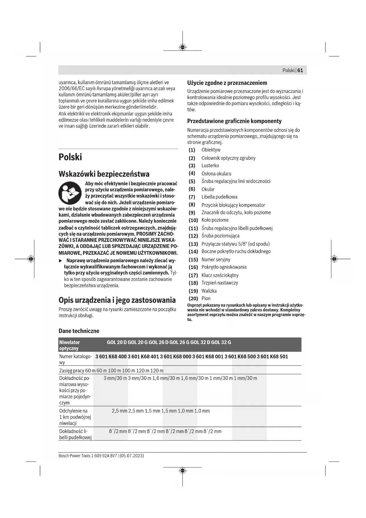 należy ustawić wartość 1,476m. Ponownie skontrolować krzyż nitek. W razie potrzeby powtó- rzyć proces regulacji lub skontaktować się z serwisem Bosch. 1 609 92A 8V7 | (05.07.2023) Bosch Power ToolsČeština | 65 Konserwacja i serwis Konserwacja i czyszczenie Urządzenie pomiarowe należy przechowywać i transporto- wać wyłącznie w walizce znajdującej się w wyposażeniu stan- dardowym. Urządzenie pomiarowe należy utrzymywać w czystości. Nie wolno zanurzać urządzenia pomiarowego w wodzie ani innych cieczach. Zanieczyszczenia należy usuwać za pomocą wilgotnej, mięk- kiej ściereczki. Nie stosować żadnych środków czyszczących ani rozpuszczalników. Należy szczególnie ostrożnie obchodzić się z soczewkami. Kurz należy usuwać za pomocą miękkiego pędzelka. Nie na- leży dotykać soczewek palcami. Przed przystąpieniem do przechowywania należy całkowicie wysuszyć urządzenie pomiarowe oraz walizkę. W walizce znajduje się woreczek ze środkiem osuszającym, który ab- sorbuje pozostałą wilgoć. Należy regularnie wymieniać wo- reczki ze środkiem osuszającym. W razie konieczności naprawy urządzenie pomiarowe należy przesłać w walizce. Obsługa klienta oraz doradztwo dotyczące użytkowania Ze wszystkimi pytaniami, dotyczącymi naprawy ikonserwa- cji nabytego produktu oraz dostępu do części zamiennych, prosimy zwracać się do punktów obsługi klienta. Rysunki techniczne oraz informacje o częściach zamiennych można znaleźć pod adresem: www.bosch-pt.com Nasz zespół doradztwa dotyczącego użytkowania odpowie na wszystkie pytania związane z produktami firmy Bosch oraz ich osprzętem. Przy wszystkich zgłoszeniach oraz zamówieniach części za- miennych konieczne jest podanie 10‑cyfrowego numeru ka- talogowego, znajdującego się na tabliczce znamionowej pro- duktu. Polska Robert Bosch Sp. z o.o. Serwis Elektronarzędzi Ul. Jutrzenki 102/104 02-230 Warszawa Na www.serwisbosch.com znajdą Państwo wszystkie szcze- góły dotyczące usług serwisowych online. Tel.: 22 7154450 Faks: 22 7154440 E-Mail: bsc@pl.bosch.com www.bosch-pt.pl Pozostałe adresy serwisów znajdują się na stronie: www.bosch-pt.com/serviceaddresses Utylizacja odpadów Narzędzia pomiarowe, osprzęt i opakowanie należy oddać do powtórnego przetworzenia zgodnie zprzepisami ochrony środowiska. Tylko dla krajów UE: Zgodnie z europejską dyrektywą 2012/19/UE w sprawie zu- żytego sprzętu elektrycznego i elektronicznego oraz jej trans- pozycją do prawa krajowego niezdatne do użytku urządzenia pomiarowe, a zgodnie z europejską dyrektywą 2006/66/WE uszkodzone lub zużyte akumulatory/baterie należy zbierać osobno i doprowadzić do ponownego użycia zgodnie z obo- wiązującymi przepisami ochrony środowiska. W przypadku nieprawidłowej utylizacji zużyty sprzęt elek- tryczny i elektroniczny może mieć szkodliwe skutki dla śro- dowiska i zdrowia ludzkiego, wynikające z potencjalnej obec- ności substancji niebezpiecznych. Čeština Bezpečnostní upozornění Aby byla zajištěna bezpečná aspolehlivá práce směřicím přístrojem, je nutné si přečíst adodržovat veškeré pokyny. Pokud se měřicí přístroj nepoužívá podle těchto pokynů, může to negativně ovlivnit ochranná opatření, která jsou integrovaná vměřicím přístroji. Nikdy nesmíte dopustit, aby byly výstražné štítky na měřicím přístroji nečitelné. TYTO POKYNY DOBŘE USCHOVEJTE, APOKUD BUDETE MĚŘICÍ PŘÍSTROJ PŘEDÁVAT DÁLE, PŘILOŽTE JE. u Měřicí přístroj svěřujte do opravy pouze kvalifikovaným odborným pracovníkům, kteří mají kdispozici originální náhradní díly. Tím bude zajištěno, že zůstane zachovaná bezpečnost měřicího přístroje. Popis výrobku avýkonu Řiďte se obrázky vpřední části návodu kobsluze. Použití vsouladu surčeným účelem Měřicí přístroj je určený kezjišťování akontrole přesných vodorovných linií. Rovněž je vhodný pro měření výšek, vzdáleností aúhlů. Zobrazené součásti Číslování zobrazených komponent se vztahuje na zobrazení měřicího přístroje na obrázkové straně. (1) Objektiv (2) Hrubý zaměřovač (3) Průzor libely (4) Kryt okuláru (5) Šroub pro seřízení záměrné čáry (6) Okulár (7) Krabicová libela (8) Zajišťovací tlačítko kompenzátoru Bosch Power Tools 1 609 92A 8V7 | (05.07.2023)66 | Čeština (9) Značka pro odečítání vodorovného kruhu (10) Vodorovný kruh (11) Šroub pro seřízení krabicové libely (12) Stavěcí šroub (13) Stativový závit 5/8" (na spodní straně) (14) Boční jemný pohon (15) Sériové číslo (16) Zaostřovací knoflík (17) Klíč na vnitřní šestihran (18) Seřizovací kolík (19) Kufr (20) Olovnice Zobrazené nebo popsané příslušenství nepatří kstandardnímu obsahu dodávky. Kompletní příslušenství naleznete vnašem programu příslušenství. Technické údaje Optický nivelační přístroj GOL 20 D GOL 20 G GOL 26 D GOL 26 G GOL 32 D GOL 32 G Číslo zboží 3601K68400 3601K68401 3601K68000 3601K68001 3601K68500 3601K68501 Pracovní dosah 60m 60m 100m 100m 120m 120m Přesnost výšky při jednotlivém měření 3mm/30m 3mm/30m 1,6mm/30m 1,6mm/30m 1mm/30m 1mm/30m Odchylka pro 1km dvojitý nivelační prvek 2,5mm 2,5mm 1,5mm 1,5mm 1,0mm 1,0mm Přesnost krabicové libely 8´/2mm 8´/2mm 8´/2mm 8´/2mm 8´/2mm 8´/2mm Kompenzátor – Rozsah nivelace ±15´ ±15´ ±15´ ±15´ ±15´ ±15´ – Magnetické tlumení ● ● ● ● ● ● Dalekohled – Obraz rovný rovný rovný rovný rovný rovný – Zvětšení 20× 20× 26× 26× 32× 32× – Zorné pole 1°30´ 1°30´ 1°30´ 1°30´ 1°30´ 1°30´ – Průměr objektivu 36mm 36mm 36mm 36mm 36mm 36mm – Minimální měřicí vzdálenost 0,3m 0,3m 0,3m 0,3m 0,3m 0,3m – Multiplikační faktor