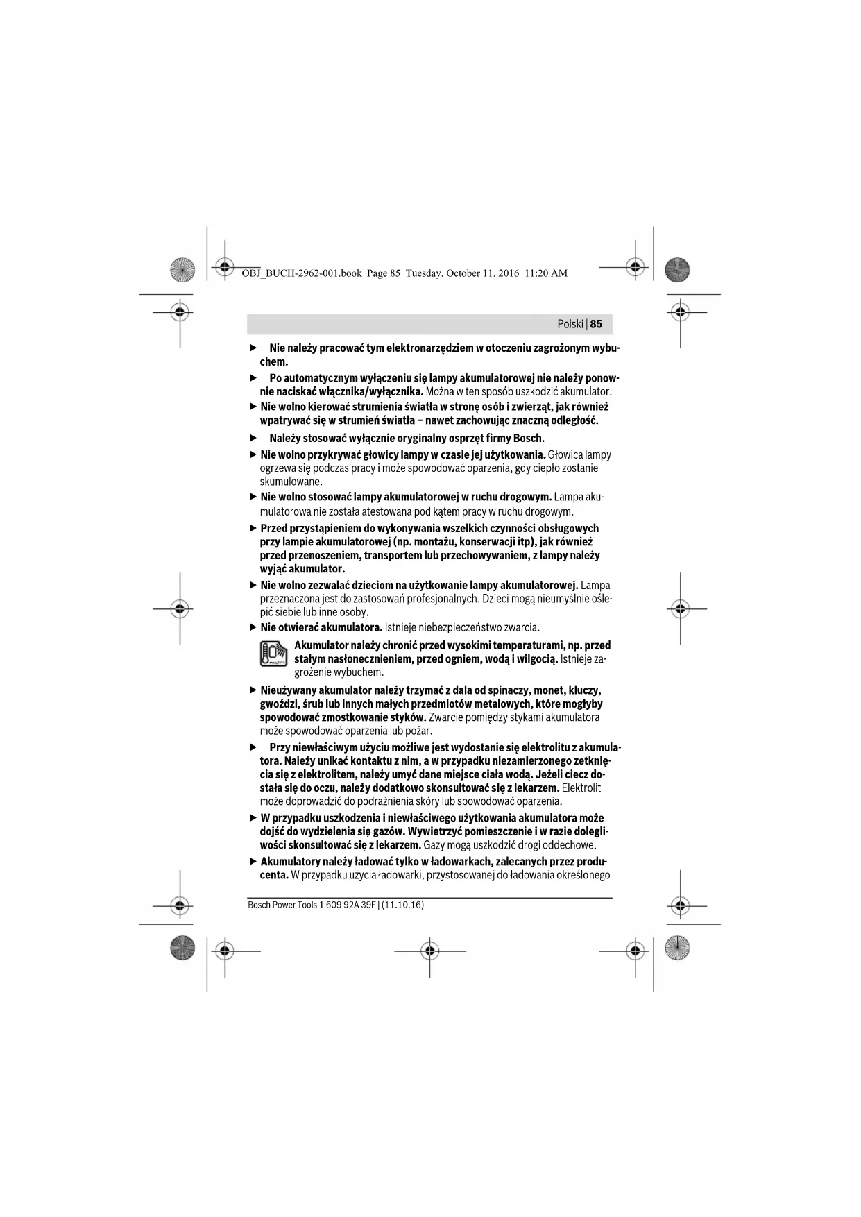 Denizli Tel.: 0258 2620666 Bulut Elektrik İstasyon Cad. No: 52/B Devlet Tiyatrosu Karşısı Elazığ Tel.: 0424 2183559 Körfez Elektrik Sanayi Çarşısı 770 Sok. No: 71 Erzincan Tel.: 0446 2230959 Ege Elektrik İnönü Bulvaro No: 135 Muğla Makasarası Fethiye Fethiye Tel.: 0252 6145701 Değer İş Bobinaj İsmetpaşa Mah. İlk Belediye Başkan Cad. 5/C Şahinbey Gaziantep Tel.: 0342 2316432 Çözüm Bobinaj İsmetpaşa Mah. Eski Şahinbey Belediyesi altı Cad. No: 3/C Gaziantep Tel.: 0342 2319500 Onarım Bobinaj Raifpaşa Cad. No: 67 İskenderun Hatay Tel.: 0326 6137546 Günşah Otomotiv Beylikdüzü Sanayi Sit. No: 210 Beylikdüzü İstanbul Tel.: 0212 8720066 Aygem 10021 Sok. No: 11 AOSB Çiğli İzmir Tel.: 0232 3768074 OBJ_BUCH-2962-001.book Page 82 Tuesday, October 11, 2016 11:20 AMTürkçe | 83 Bosch Power Tools 1 609 92A 39F | (11.10.16) Sezmen Bobinaj Ege İş Merkezi 1201/4 Sok. No: 4/B Yenişehir İzmir Tel.: 0232 4571465 Ankaralı Elektrik Eski Sanayi Bölgesi 3. Cad. No: 43 Kayseri Tel.: 0352 3364216 Asal Bobinaj Eski Sanayi Sitesi Barbaros Cad. No: 24 Samsun Tel.: 0362 2289090 Üstündağ Elektrikli Aletler Nusretiye Mah. Boyacılar Aralığı No: 9 Tekirdağ Tel.: 0282 6512884 Nakliye Alet içindeki lityum iyon (Li-Ion) aküler tehlikeli madde taşıma yönetmeliği hükümleri- ne tabidir. Aküler başka bir yükümlülük olmaksızın kullanıcı tarafından caddeler üze- rinde taşınabilir. Üçüncü kişiler eliyle yollanma durumunda (örneğin hava yolu ile veya nakliye şirketleri ile) paketleme ve etiketlemeye ilişkin özel hükümlere uyulmalıdır. Bu nedenle gönderi paketlenirken bir tehlikeli madde uzmanından yardım alınmalıdır. Aküleri sadece ve ancak gövdelerinde hasar yoksa gönderin. Açık kontakları kapatın ve aküyü ambalaj içinde hareket etmeyecek biçimde paketleyin. Lütfen olası ek ulusal yönetmelik hükümlerine de uyun. Tasfiye Akülü fenerler, aküler, aksesuar ve ambalaj malzemesi çevre dostu tasfiye amacıyla yeniden kazanım merkezine gönderilmelidir. Akülü feneri ve aküleri/bataryaları evsel çöplerin içine atmayın! OBJ_BUCH-2962-001.book Page 83 Tuesday, October 11, 2016 11:20 AM84 | Polski 1 609 92A 39F | (11.10.16) Bosch Power Tools Sadece AB üyesi ülkeler için: Kullanım ömrünü tamamlamış elektro ve elektrikli aletlere ilişkin 2012/19/EU yönetmeliği uyarınca kullanım ömrünü tamamlamış akülü fenerler ve 2006/66/EC yönetmeliği uyarınca arızalı veya kul- lanım ömrünü tamamlamış aküler ayrı ayrı toplanmak ve çevre dos- tu bir yöntemle tasfiye edilmek üzere bir geri dönüşüm merkezine yollanmak zorundadır. Aküler/Bataryalar: Li-Ion: Lütfen bölüm “Nakliye”, sayfa içindeki uyarılara uyun 83. Değişiklik haklarımız saklıdır. Polski Wskazówki bezpieczeństwa Wskazówki dotyczące bezpieczeństwa pracy z lampami akumulato- rowymi Należy przeczytać wszystkie wskazówki i przepisy. Błędy w przestrzeganiu poniższych wskazówek mogą spowodować porażenie prądem, pożar i/lub ciężkie obrażenia ciała. Proszę przeczytać wszystkie wskazówki bezpieczeństwa oraz zalecenia dołą- czone do akumulatora lub do elektronarzędzia, z którym akumulator został dostarczony i dokładnie ich przestrzegać. Z lampą akumulatorową należy obchodzić się ostrożnie. Lampa akumulatoro- wa rozgrzewa się do wysokich temperatur, co powoduje podwyższenie ryzyka po- żaru lub wybuchu. OBJ_BUCH-2962-001.book Page 84 Tuesday, October 11, 2016 11:20 AMPolski | 85 Bosch Power Tools 1 609 92A 39F | (11.10.16) Nie należy pracować tym elektronarzędziem w otoczeniu zagrożonym wybu- chem. Po automatycznym wyłączeniu się lampy akumulatorowej nie należy ponow- nie naciskać włącznika/wyłącznika. Można w ten sposób uszkodzić akumulator. Nie wolno kierować strumienia światła w stronę osób i zwierząt, jak również wpatrywać się w strumień światła – nawet zachowując znaczną odległość. Należy stosować wyłącznie oryginalny osprzęt firmy Bosch. Nie wolno przykrywać głowicy lampy w czasie jej użytkowania. Głowica lampy ogrzewa się podczas pracy i może spowodować oparzenia, gdy ciepło zostanie skumulowane. Nie wolno stosować lampy akumulatorowej w ruchu drogowym. Lampa aku- mulatorowa nie została atestowana pod kątem pracy w ruchu drogowym. Przed przystąpieniem do wykonywania wszelkich czynności obsługowych przy lampie akumulatorowej (np. montażu, konserwacji itp), jak również przed przenoszeniem, transportem lub przechowywaniem, z lampy należy wyjąć akumulator. Nie wolno zezwalać dzieciom na użytkowanie lampy akumulatorowej. Lampa przeznaczona jest do zastosowań profesjonalnych. Dzieci mogą nieumyślnie ośle- pić siebie lub inne osoby. Nie otwierać akumulatora. Istnieje niebezpieczeństwo zwarcia. Akumulator należy chronić przed wysokimi temperaturami, np. przed stałym nasłonecznieniem, przed ogniem, wodą i wilgocią. Istnieje za- grożenie wybuchem. Nieużywany akumulator należy trzymać z dala od spinaczy, monet, kluczy, gwoździ, śrub lub innych małych przedmiotów metalowych, które mogłyby spowodować zmostkowanie styków. Zwarcie pomiędzy stykami akumulatora może spowodować oparzenia lub pożar. Przy niewłaściwym użyciu możliwe jest wydostanie się elektrolitu z akumula- tora. Należy unikać kontaktu z nim, a w przypadku niezamierzonego zetknię- cia się z elektrolitem, należy umyć dane miejsce ciała wodą. Jeżeli ciecz do- stała się do oczu, należy dodatkowo skonsultować się z lekarzem. Elektrolit może doprowadzić do podrażnienia skóry lub spowodować oparzenia. W przypadku uszkodzenia i niewłaściwego użytkowania akumulatora może dojść do wydzielenia się gazów. Wywietrzyć pomieszczenie i w razie dolegli- wości skonsultować się z lekarzem. Gazy mogą uszkodzić drogi oddechowe. Akumulatory należy ładować tylko w ładowarkach, zalecanych przez produ- centa. W przypadku uż