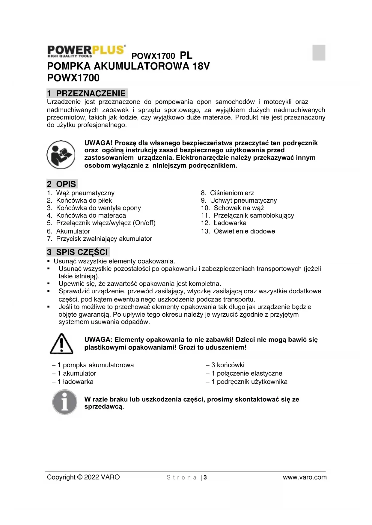 Dostarczone akcesoria spełniają różne funkcje. Zwężający się adapter może być używany na mniejszych zaworach zaciskowych do pompowania takich mniejszych artykułów jak zabawki dziecięce, które zwykle są nadmuchiwane ustami.POWX1700 PL Copyright © 2022 VARO S t r o n a | 8 www.varo.com Igła do piłek może być używana do pompowania dowolnych piłek i innych artykułów, do których pompowania potrzebna jest igła do piłek. UWAGA! Podczas pompowania artykułów o ciśnieniu znamionowym nieprzekraczającym 10 PSI należy pompować krótkimi dmuchami, a po każdym sprawdzić prawidłowość ciśnienia na wyczucie lub przy użyciu kalibrowanego urządzenia pomiarowego.