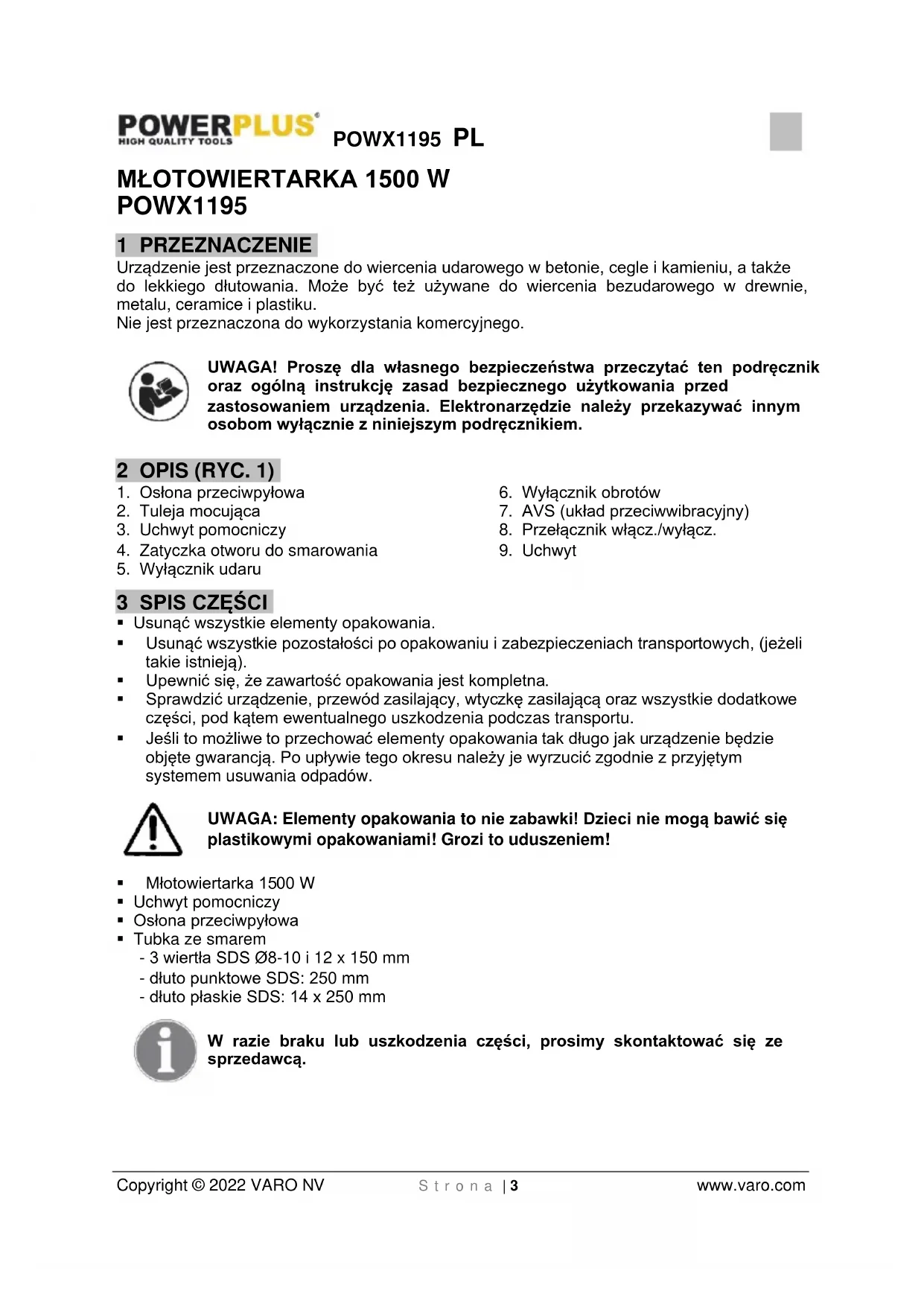 - Wibracje mogą być przyczyną urazu kończyn górnych. Należy maksymalnie skrócić czas ekspozycji na wibracje.POWX1195 PL Copyright © 2022 VARO NV S t r o n a | 7 www.varo.com