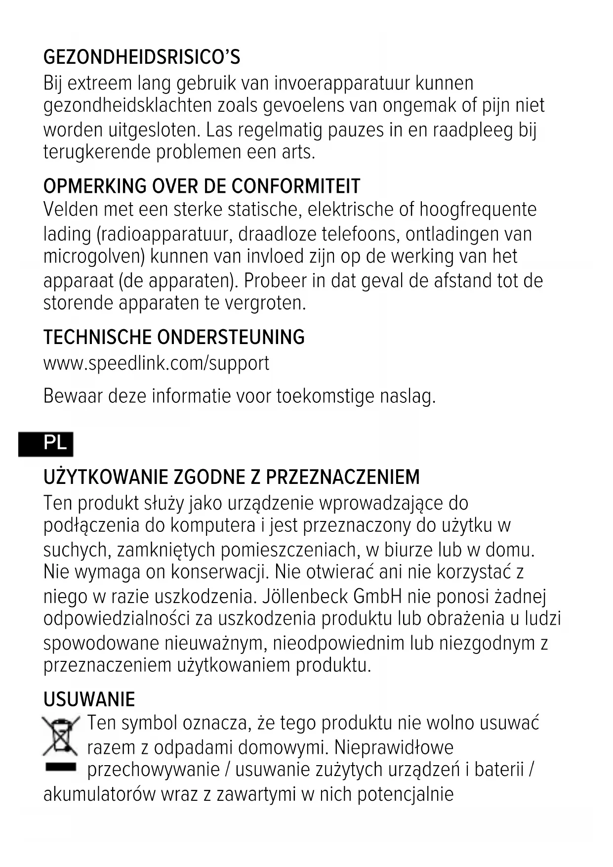 Silne pola elektrostatyczne, elektryczne lub elektromagnetyczne o wysokiej częstotliwości (urządzenia radiowe, telefony przenośne, telefony komórkowe, mikrofalówki, rozładowania elektryczne) mogą być przyczyną zakłóceń w działaniu urządzenia (urządzeń). W takim wypadku należy zachować większą odległość od źródeł zakłóceń. POMOC TECHNICZNA www.speedlink.com/support Prosimy zachować tę informację do późniejszego wykorzystania. PLHU