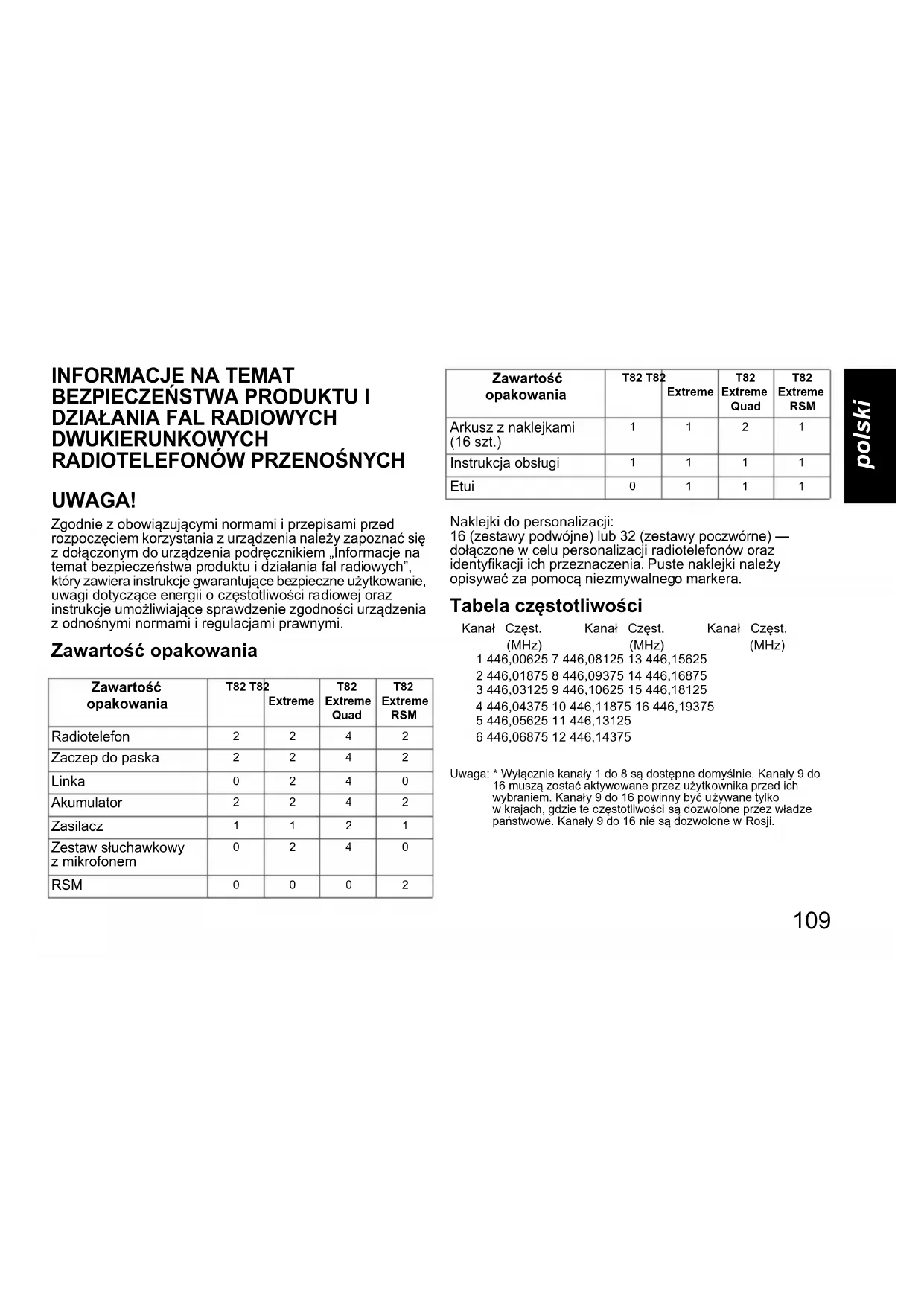 UWAGA! Zgodnie z obowiązującymi normami i przepisami przed rozpoczęciem korzystania z urządzenia należy zapoznać się z dołączonym do urządzenia podręcznikiem „Informacje na temat bezpieczeństwa produktu i działania fal radiowych”, który zawiera instrukcje gwarantujące bezpieczne użytkowanie, uwagi dotyczące energii o częstotliwości radiowej oraz instrukcje umożliwiające sprawdzenie zgodności urządzenia z odnośnymi normami i regulacjami prawnymi. Zawartość opakowania Naklejki do personalizacji: 16 (zestawy podwójne) lub 32 (zestawy poczwórne) — dołączone w celu personalizacji radiotelefonów oraz identyfikacji ich przeznaczenia. Puste naklejki należy opisywać za pomocą niezmywalnego markera. Tabela częstotliwości Uwaga: * Wyłącznie kanały 1 do 8 są dostępne domyślnie. Kanały 9 do 16 muszą zostać aktywowane przez użytkownika przed ich wybraniem. Kanały 9 do 16 powinny być używane tylko w krajach, gdzie te częstotliwości są dozwolone przez władze państwowe. Kanały 9 do 16 nie są dozwolone w Rosji. Zawartość opakowania T82 T82 Extreme T82 Extreme Quad T82 Extreme RSM Radiotelefon