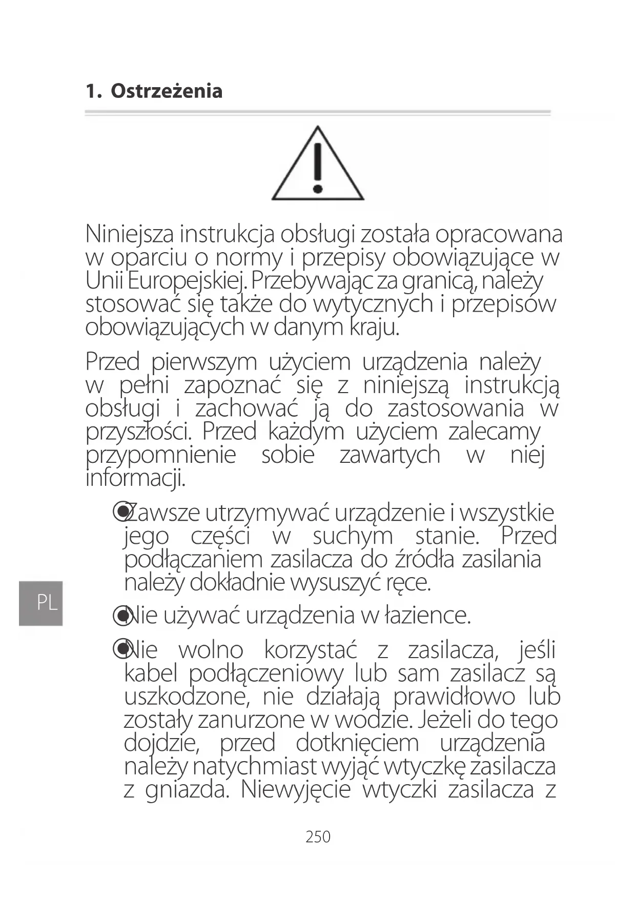 | W celu zabwezpieczenia uzytkownika przechyorieniem prȩdek elektrycznych urzążenie jest zabwezpieczone przech wnikaniem do seinem wnętrza przydmiotów o sądnicywcjejsnz 2,5 mm (np. palce). | |