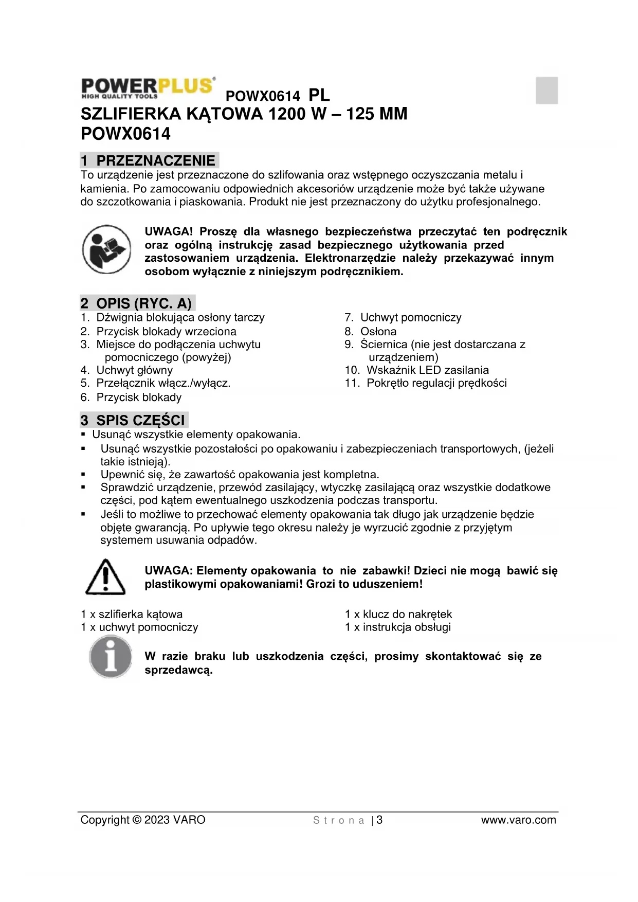 - Jeśli to możliwe to przechować elementy opakowania tak długo jak urządzenie będzie objęte gwarancją. Po upływie tego okresu należy je wyrzucić zgodnie z przyjętym systemem usuwania odpadów. UWAGA: Elementy opakowania to nie zabawki! Dzieci nie mogą bawić się plastikowymi opakowaniami! Grozi to uduszeniem! 1 x szlifierka kątowa 1 x uchwyt pomocniczy 1 x klucz do nakrętek 1 x instrukcja obsługi W razie braku lub uszkodzenia części, prosimy skontaktować się ze sprzedawcą.POWX0614 PL Copyright © 2023 VARO S t r o n a | 4 www.varo.com 4 OZNACZENIA W niniejszej instrukcji i/lub na urządzeniu użyto następujących symboli:
