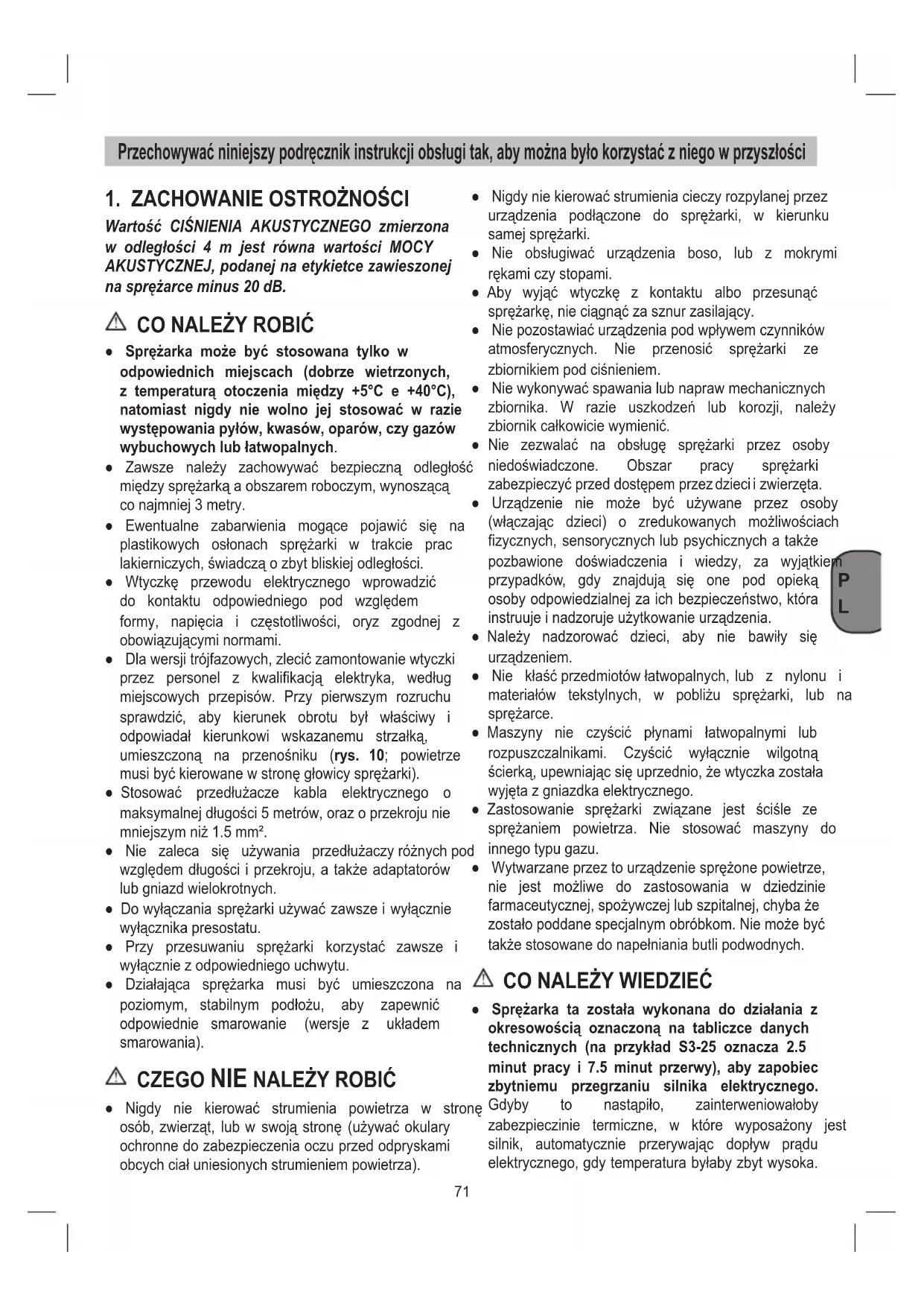 - Sprężarka ta zostafa wykonana do dzialania z okresowość oznaczona na tabliczce danych technicznych (na przyklad S3-25 oznacza 2.5 minut przyc y i 7.5 minut przyerwy), aby zapobiec zbytniemu przyegrzaniu silnika elektrycznégo.