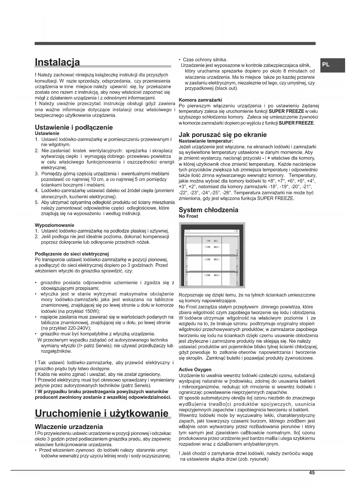 - Czas ochrony silnika. Urzadzenie jest wyposazone w kontrole zabezpieczajaca silnik, który uruchamia sprezarke dopiero po okolo 8 minutach od wlaczenia urzadzenia. Ma to miejsce takze po kazdej przerwie w zasilaniu elektrycznym, niezaleznie od tego, czy umyslnej, czy przypadkowej (black out). Komora zamrażarki Po pierwszym włączeniu urządzenia i po ustawieniu żądanej temperatury zaleca się uruchomienie funkcji SUPER FREEZE w celu szybszego schłodzenia komory. Zaleca się umieszczenie żywności w komorze zamrażarki dopiero po wyjściu z funkcji SUPER FREEZE. Jak poruszać się po ekranie Nastawianie temperatur: Jeżeli urządzenie jest włączone, na ekranach lodówki i zamrażarki są wyświetlone temperatury ustawione w danym momencie. Aby je zmienić wystarczy, nacisnąć przyciski - i + właściwe dla komory, w której użytkownik chce zmienić temperaturę. Każde naciśnięcie tych przycisków zwiększa lub zmniejsza temperaturę i odpowiednio także ilość zimna wytwarzanego wewnątrz komory. Temperatury, jakie można wybrać dla komory lodówki to +8°, +7°, +6°, +5°, +4°, +3°, +2°, natomiast dla komory zamrażarki -18°, -19°, -20°, -21°, -22°, -23°, -24°,-25°, -26°. Temperatura zamrażarki nie może być zmieniona, gdy jest włączona funkcja SUPER FREEZE. System chłodzenia No Frost Rozpoznaje się dzięki temu, że na tylnich ściankach umieszczone są komory napowietrzające. No Frost zarządza stałym przepływem zimnego powietrza, które zbiera wilgotność czym zapobiega tworzenie się lodu i oblodzenia. W lodówce utrzymuje wilgotność na właściwym poziomie i ze względu na to, że brakuje szronu podtrzymuje oryginalny stopień wilgotności przechowywanych produktów; w zamrażarce zapobiega tworzeniu się lodu na ściankach dzięki czemu usuwanie oblodzenia jest zbyteczne i zamrożone produkty nie sklejają się. Nie należy ustawiać produktów ani pojemników blisko tylnej ścianki chłodzącej, gdyż powoduje to zatkanie otworów napowietrzania i tworzenie się skroplin. Zamknąć butelki i pozawijać produkty żywnościowe. Active Oxygen Urzdzenie to uwalnia wewntrz lodówki czsteczki ozonu, substancji wystpujcej naturalnie w [rodowisku, zdolnej do usuwania bakterii i mikroorganizmów, redukujc ich mno|enie si wewntrz lodówki i ograniczajc powstawanie nieprzyjemnych zapachów. W sposób automatyczny okre[la ilo[ ozonu niezbdn do znacznego wydBu|enia trwaBo[ci produktów spo|ywczych, usunicia nieprzyjemnych zapachów i zapobiegnicia tworzeniu si bakterii. Wewntrz lodówki mo|e by wyczuwalny lekki, charakterystyczny zapach, jaki towarzyszy czasami burzom, którego zródBem jest wBa[nie ozon wytwarzany przez rozBadowania piorunów i który tym samym jest zjawiskiem caBkowicie normalnym. Ilo[ ozonu produkowana przez urzdzenie jest bardzo maBa i ulega szybkiemu rozpadowi wraz z dziaBaniem antybakteryjnym. ! Jeśli chodzi o zamykanie drzwi lodówki, należy zwróciću wagę na ustawienie słupka drzwi (zob. rysunek)46