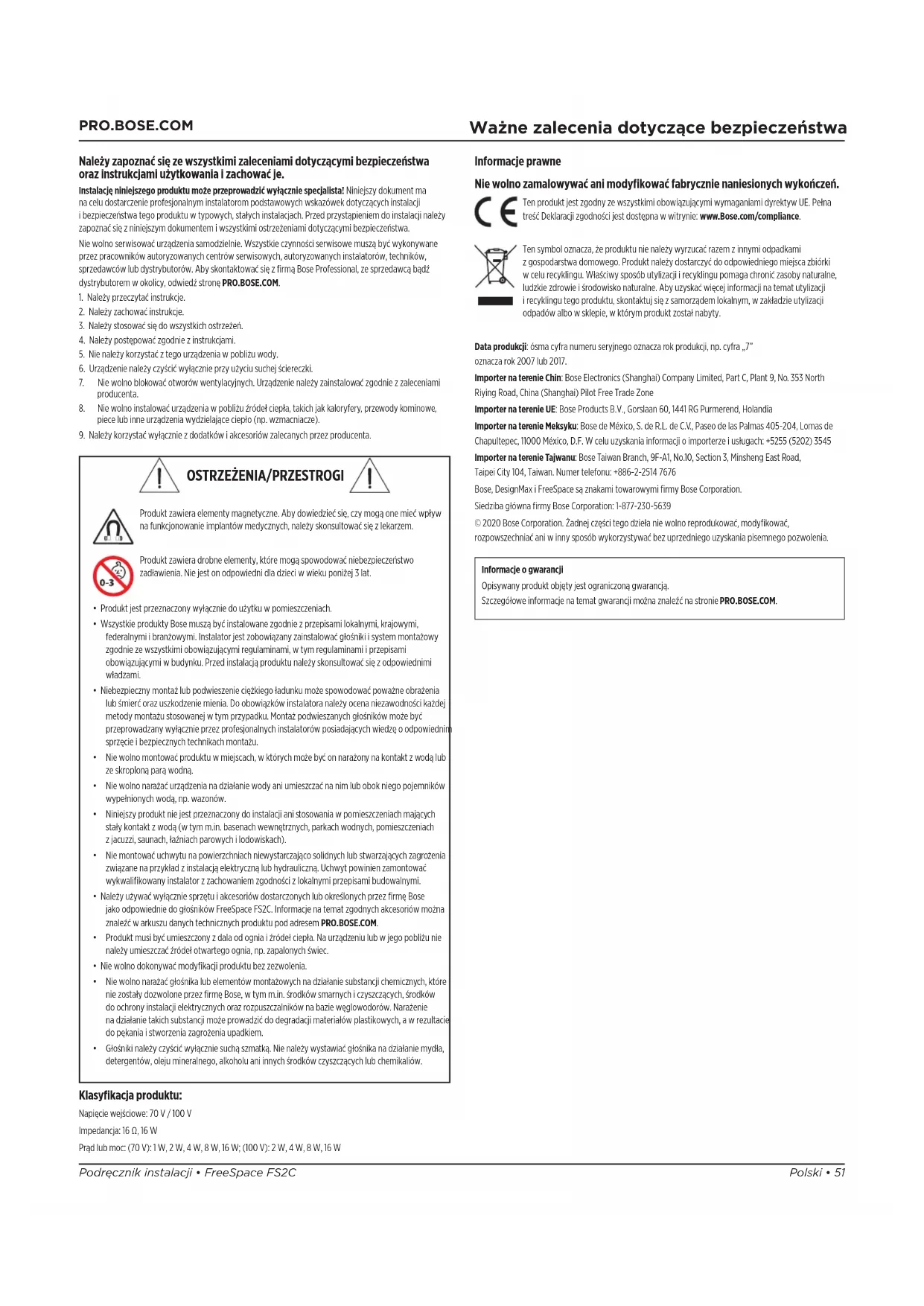piece lubinne urządzenia wydzielające ciepło (np.wzmacniacze). 9. Należy korzystać wyłącznie zdodatków iakcesoriów zalecanych przez producenta. Informacje prawne Nie wolno zamalowywać ani modyfikować fabrycznie naniesionych wykończeń. Ten produkt jest zgodny zewszystkimi obowiązującymi wymaganiami dyrektyw UE. Pełna treść Deklaracji zgodności jest dostępna wwitrynie: www.Bose.com/compliance. Ten symbol oznacza, że produktu nie należy wyrzucać razem zinnymi odpadkami zgospodarstwa domowego. Produkt należy dostarczyć do odpowiedniego miejsca zbiórki wcelu recyklingu. Właściwy sposób utylizacji irecyklingu pomaga chronić zasoby naturalne, ludzkie zdrowie iśrodowisko naturalne. Aby uzyskać więcej informacji na temat utylizacji irecyklingu tego produktu, skontaktuj się zsamorządem lokalnym, wzakładzie utylizacji odpadów albo wsklepie, wktórym produkt został nabyty. Data produkcji: ósma cyfra numeru seryjnego oznacza rok produkcji, np. cyfra „7” oznacza rok 2007 lub 2017. Importer na terenie Chin: Bose Electronics (Shanghai) Company Limited, Part C, Plant 9, No. 353 North Riying Road, China (Shanghai) Pilot Free Trade ZoneImporter na terenie UE: Bose Products B.V., Gorslaan 60, 1441 RG Purmerend, Holandia Importer na terenie Meksyku: Bose de México, S. de R.L. de C.V., Paseo de las Palmas 405-204, Lomas de Chapultepec, 11000 México, D.F. W celu uzyskania informacji oimporterze iusługach: +5255 (5202) 3545 Importer na terenie Tajwanu: Bose Taiwan Branch, 9F-A1, No.10, Section 3, Minsheng East Road, Taipei City 104, Taiwan. Numer telefonu: +886-2-2514 7676Bose, DesignMax i FreeSpace są znakami towarowymi firmy Bose Corporation.Siedziba główna firmy Bose Corporation: 1-877-230-5639©2020 Bose Corporation. Żadnej części tego dzieła nie wolno reprodukować, modyfikować, rozpowszechniać ani winny sposób wykorzystywać bez uprzedniego uzyskania pisemnego pozwolenia.Informacje ogwarancjiOpisywany produkt objęty jest ograniczoną gwarancją. Szczegółowe informacje na temat gwarancji można znaleźć na stronie PRO.BOSE.COM. Klasyfikacja produktu: Napięcie wejściowe: 70V / 100VImpedancja: 16Ω, 16WPrąd lub moc: (70V): 1W, 2W, 4W, 8W, 16W; (100V): 2W, 4W, 8W, 16W
