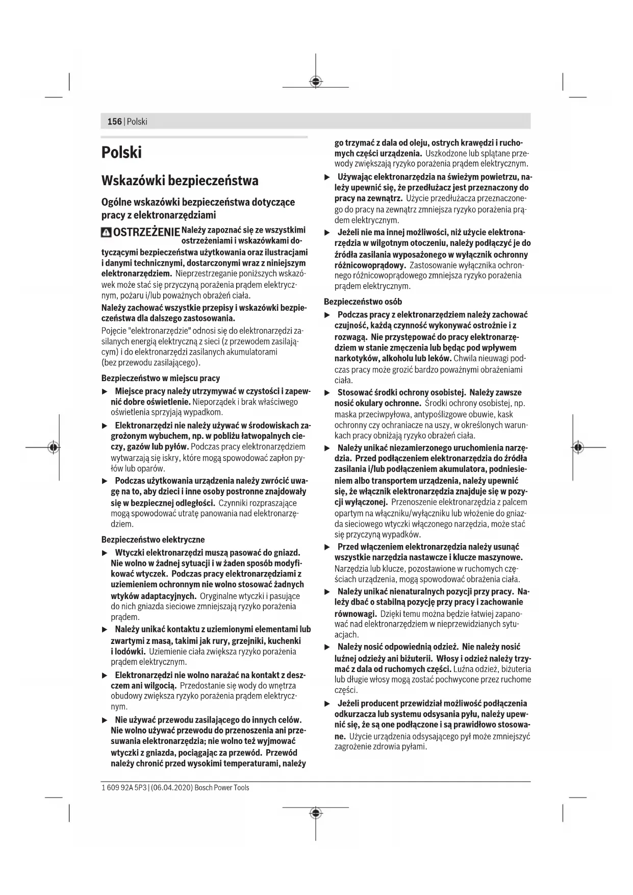 Karasoku Mahallesi 28028. Sokak No:20/A Merkez / ADANA Tel.: +903223599710 -3521379 Fax: +903223591323 E-mail: isiklar@isiklarelektrik.com Kırgızistan, Moğolistan, Tacikistan, Türkmenistan, Özbekistan TOO “Robert Bosch” Power Tools, Satış Sonrası Servis Muratbaev Cad., 180 050012, Almatı, Kazakistan Servis E-posta: service.pt.ka@bosch.com Resmi İnternet Sitesi: www.bosch.com, www.bosch-pt.com Tasfiye Elektrikli el aletleri, aküler, aksesuar ve ambalaj malzemesi çevre dostu tasfiye amacıyla bir geri dönüşüm merkezine yollanmalıdır. Elektrikli el aletlerini ve aküleri/bataryaları evsel çöplerin içine atmayın! Sadece AB ülkeleri için: 2012/19/EU yönetmeliği uyarınca kullanım ömrünü tamamlamış elektrikli el aletleri ve 2006/66/EC yönetmeliği uyarınca arızalı veya kullanım ömrünü tamamlamış aküler/ bataryalar ayrı ayrı toplanmak ve çevre dostu tasfiye için bir geri dönüşüm merkezine yollanmak zorundadır. Aküler/piller: Ni-MH: Nikel-Metalhidrit Bosch Power Tools 1 609 92A 5P3 | (06.04.2020)156 | Polski Polski Wskazówki bezpieczeństwa Ogólne wskazówki bezpieczeństwa dotyczące pracy z elektronarzędziami OSTRZEŻENIE Należy zapoznać się ze wszystkimi ostrzeżeniami i wskazówkami do- tyczącymi bezpieczeństwa użytkowania oraz ilustracjami i danymi technicznymi, dostarczonymi wraz z niniejszym elektronarzędziem. Nieprzestrzeganie poniższych wskazó- wek może stać się przyczyną porażenia prądem elektrycz- nym, pożaru i/lub poważnych obrażeń ciała. Należy zachować wszystkie przepisy i wskazówki bezpie- czeństwa dla dalszego zastosowania. Pojęcie "elektronarzędzie" odnosi się do elektronarzędzi za- silanych energią elektryczną z sieci (z przewodem zasilają- cym) i do elektronarzędzi zasilanych akumulatorami (bezprzewodu zasilającego). Bezpieczeństwo w miejscu pracy u Miejsce pracy należy utrzymywać w czystości i zapew- nić dobre oświetlenie. Nieporządek i brak właściwego oświetlenia sprzyjają wypadkom. u Elektronarzędzi nie należy używać w środowiskach za- grożonym wybuchem, np. w pobliżu łatwopalnych cie- czy, gazów lub pyłów. Podczas pracy elektronarzędziem wytwarzają się iskry, które mogą spowodować zapłon py- łów lub oparów. u Podczas użytkowania urządzenia należy zwrócić uwa- gę na to, aby dzieci i inne osoby postronne znajdowały się w bezpiecznej odległości. Czynniki rozpraszające mogą spowodować utratę panowania nad elektronarzę- dziem. Bezpieczeństwo elektryczne u Wtyczki elektronarzędzi muszą pasować do gniazd. Nie wolno w żadnej sytuacji i w żaden sposób modyfi- kować wtyczek. Podczas pracy elektronarzędziami z uziemieniem ochronnym nie wolno stosować żadnych wtyków adaptacyjnych. Oryginalne wtyczki i pasujące do nich gniazda sieciowe zmniejszają ryzyko porażenia prądem. u Należy unikać kontaktu z uziemionymi elementami lub zwartymi z masą, takimi jak rury, grzejniki, kuchenki ilodówki. Uziemienie ciała zwiększa ryzyko porażenia prądem elektrycznym. u Elektronarzędzi nie wolno narażać na kontakt z desz- czem ani wilgocią. Przedostanie się wody do wnętrza obudowy zwiększa ryzyko porażenia prądem elektrycz- nym. u Nie używać przewodu zasilającego do innych celów. Nie wolno używać przewodu do przenoszenia ani prze- suwania elektronarzędzia; nie wolno też wyjmować wtyczki z gniazda, pociągając za przewód. Przewód należy chronić przed wysokimi temperaturami, należy go trzymać zdala od oleju, ostrych krawędzi i rucho- mych części urządzenia. Uszkodzone lub splątane prze- wody zwiększają ryzyko porażenia prądem elektrycznym. u Używając elektronarzędzia na świeżym powietrzu, na- leży upewnić się, że przedłużacz jest przeznaczony do pracy na zewnątrz. Użycie przedłużacza przeznaczone- go do pracy na zewnątrz zmniejsza ryzyko porażenia prą- dem elektrycznym. u Jeżeli nie ma innej możliwości, niż użycie elektrona- rzędzia w wilgotnym otoczeniu, należy podłączyć je do źródła zasilania wyposażonego w wyłącznik ochronny różnicowoprądowy. Zastosowanie wyłącznika ochron- nego różnicowoprądowego zmniejsza ryzyko porażenia prądem elektrycznym. Bezpieczeństwo osób u Podczas pracy z elektronarzędziem należy zachować czujność, każdą czynność wykonywać ostrożnie i z rozwagą. Nie przystępować do pracy elektronarzę- dziem w stanie zmęczenia lub będąc pod wpływem narkotyków, alkoholu lub leków. Chwila nieuwagi pod- czas pracy może grozić bardzo poważnymi obrażeniami ciała. u Stosować środki ochrony osobistej. Należy zawsze nosić okulary ochronne. Środki ochrony osobistej, np. maska przeciwpyłowa, antypoślizgowe obuwie, kask ochronny czy ochraniacze na uszy, w określonych warun- kach pracy obniżają ryzyko obrażeń ciała. u Należy unikać niezamierzonego uruchomienia narzę- dzia. Przed podłączeniem elektronarzędzia do źródła zasilania i/lub podłączeniem akumulatora, podniesie- niem albo transportem urządzenia, należy upewnić się, że włącznik elektronarzędzia znajduje się w pozy- cji wyłączonej. Przenoszenie elektronarzędzia z palcem opartym na włączniku/wyłączniku lub włożenie do gniaz- da sieciowego wtyczki włączonego narzędzia, może stać się przyczyną wypadków. u Przed włączeniem elektronarzędzia należy usunąć wszystkie narzędzia nastawcze i klucze maszynowe. Narzędzia lub klucze, pozostawione wruchomych czę- ściach urządzenia, mogą spowodować obrażenia ciała. u Należy unikać nienaturalnych pozycji przy pracy. Na- leży dbać o stabilną pozycję przy pracy i zachowanie równowagi. Dzięki temu można będzie łatwiej zapano- wać nad elektronarzędziem w nieprzewidzianych sytu- acjach. u Należy nosić odpowiednią odzież. Nie należy nosić luźnej odzieży ani biżuterii. Włosy i odzież należy trzy- mać z dala od ruchomych części. Luźna odzież, biżuteria lub długie