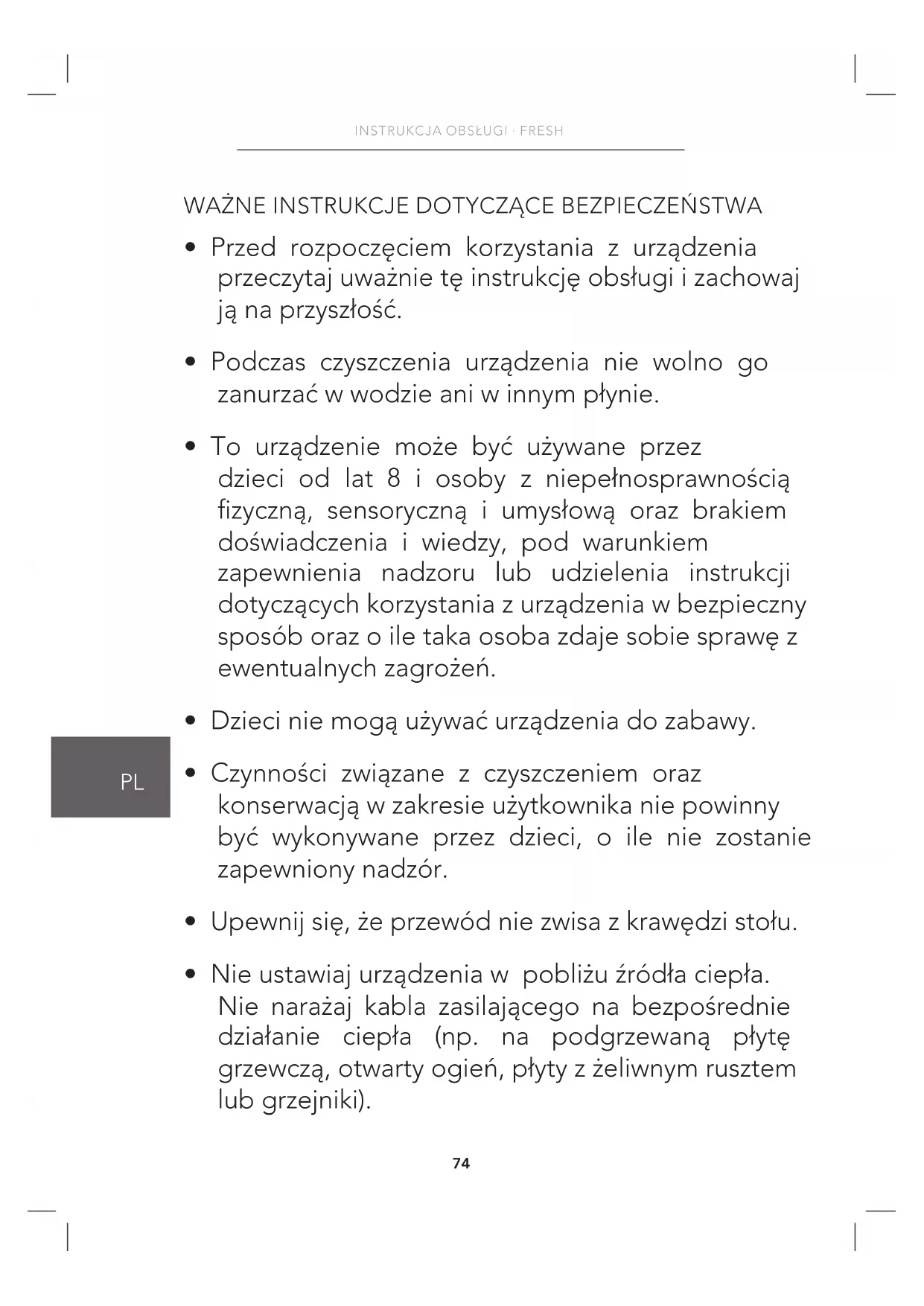- To urządzenie może być używane przez dzieci od lat 8 i osoby z niepełnosprawnością zyczną, sensoryczną i umysłową oraz brakiem doświadczenia i wiedzy, pod warunkiem zapewnienia nadzoru lub udzielenia instrukcji dotyczących korzystania z urządzenia w bezpieczny sposób oraz o ile taka osoba zdaje sobie sprawę z ewentualnych zagrożeń.