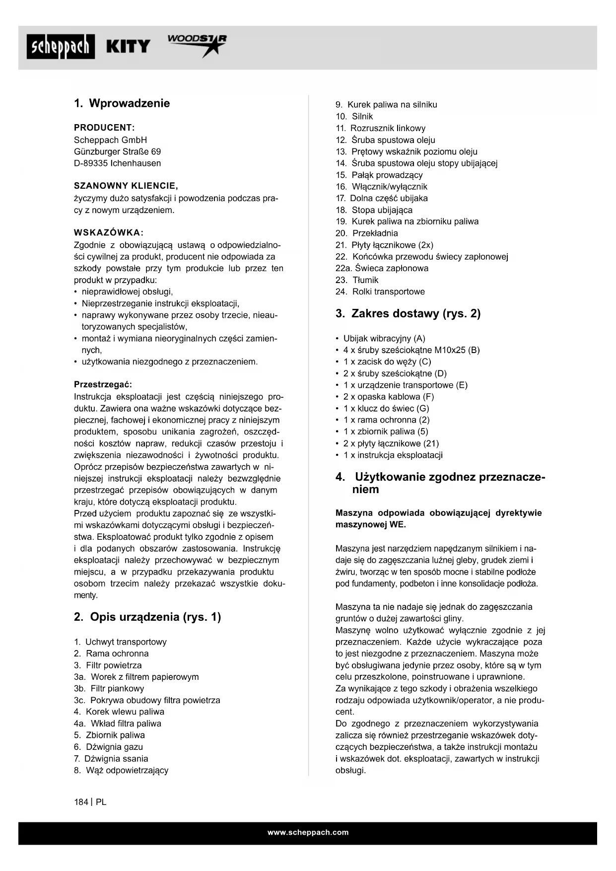niem Maszyna odpowiada obowiązującej dyrektywie maszynowej WE. Maszyna jest narzędziem napędzanym silnikiem i na- daje się do zagęszczania luźnej gleby, grudek ziemi i żwiru, tworząc w ten sposób mocne i stabilne podłoże pod fundamenty, podbeton i inne konsolidacje podłoża. Maszyna ta nie nadaje się jednak do zagęszczania gruntów o dużej zawartości gliny. Maszynę wolno użytkować wyłącznie zgodnie z jej przeznaczeniem. Każde użycie wykraczające poza to jest niezgodne z przeznaczeniem. Maszyna może być obsługiwana jedynie przez osoby, które są w tym celu przeszkolone, poinstruowane i uprawnione. Za wynikające z tego szkody i obrażenia wszelkiego rodzaju odpowiada użytkownik/operator, a nie produ- cent. Do zgodnego z przeznaczeniem wykorzystywania zalicza się również przestrzeganie wskazówek doty- czących bezpieczeństwa, a także instrukcji montażu i wskazówek dot. eksploatacji, zawartych w instrukcji obsługi.