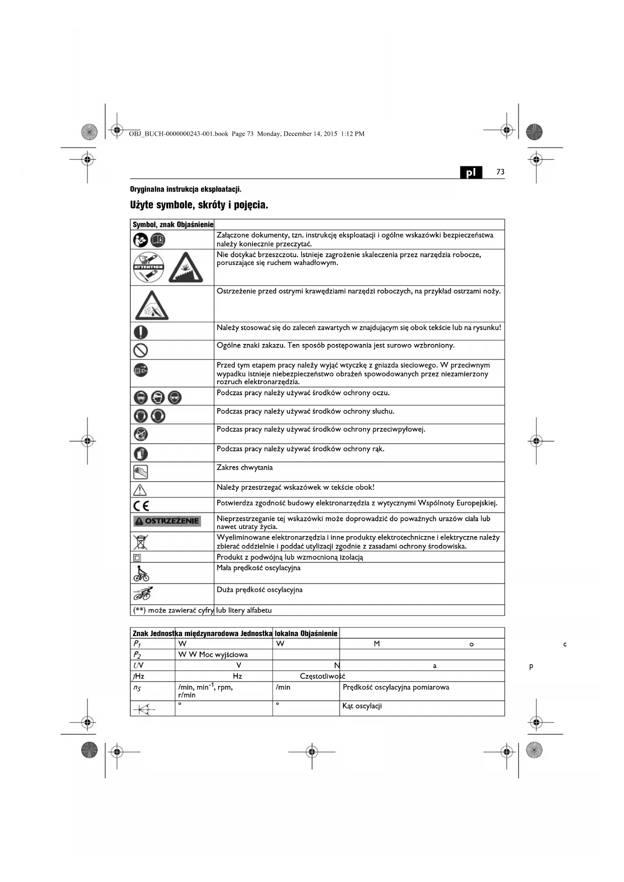 Oryginalna instrukcja eksploatacji. Użyte symbole, skróty i pojęcia. Symbol, znak Objaśnienie Załączone dokumenty, tzn. instrukcję eksploatacji i ogólne wskazówki bezpieczeństwa należy koniecznie przeczytać. Nie dotykać brzeszczotu. Istnieje zagrożenie skaleczenia przez narzędzia robocze, poruszające się ruchem wahadłowym. Ostrzeżenie przed ostrymi krawędziami narzędzi roboczych, na przykład ostrzami noży. Należy stosować się do zaleceń zawartych w znajdującym się obok tekście lub na rysunku! Ogólne znaki zakazu. Ten sposób postępowania jest surowo wzbroniony. Przed tym etapem pracy należy wyjąć wtyczkę z gniazda sieciowego. W przeciwnym wypadku istnieje niebezpieczeństwo obrażeń spowodowanych przez niezamierzony rozruch elektronarzędzia. Podczas pracy należy używać środków ochrony oczu. Podczas pracy należy używać środków ochrony słuchu. Podczas pracy należy używać środków ochrony przeciwpyłowej. Podczas pracy należy używać środków ochrony rąk. Zakres chwytania Należy przestrzegać wskazówek w tekście obok! Potwierdza zgodność budowy elektronarzędzia z wytycznymi Wspólnoty Europejskiej. Nieprzestrzeganie tej wskazówki może doprowadzić do poważnych urazów ciała lub nawet utraty życia. Wyeliminowane elektronarzędzia i inne produkty elektrotechniczne i elektryczne należy zbierać oddzielnie i poddać utylizacji zgodnie z zasadami ochrony środowiska. Produkt z podwójną lub wzmocnioną izolacją Mała prędkość oscylacyjna Duża prędkość oscylacyjna (**) może zawierać cyfry lub litery alfabetu Znak Jednostka międzynarodowa Jednostka lokalna Objaśnienie
