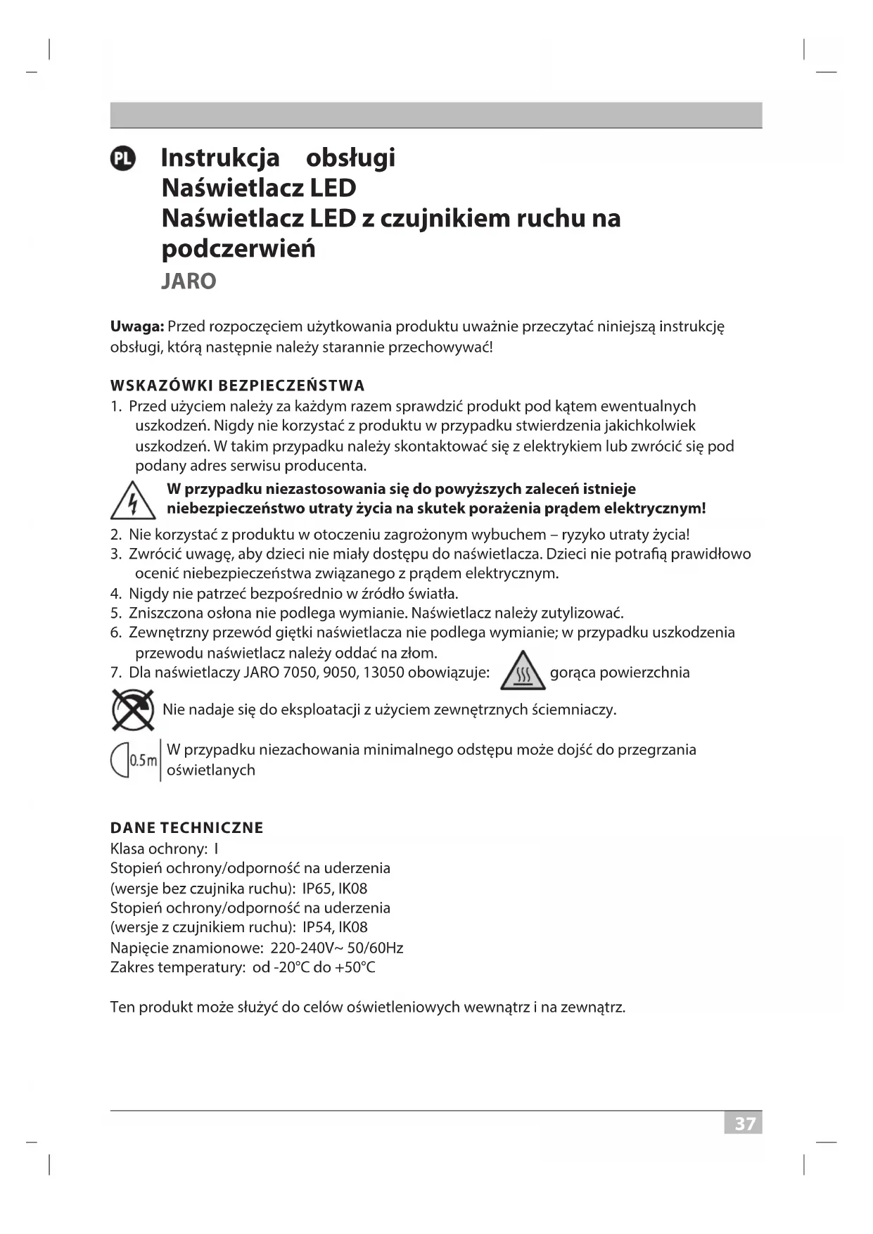 gorąca powierzchnia Nie nadaje się do eksploatacji z użyciem zewnętrznych ściemniaczy. W przypadku niezachowania minimalnego odstępu może dojść do przegrzania oświetlanych DANE TECHNICZNE Klasa ochrony: I Stopień ochrony/odporność na uderzenia (wersje bez czujnika ruchu): IP65, IK08 Stopień ochrony/odporność na uderzenia (wersje z czujnikiem ruchu): IP54, IK08 Napięcie znamionowe: 220-240V~ 50/60Hz Zakres temperatury: od -20°C do +50°C Ten produkt może służyć do celów oświetleniowych wewnątrz i na zewnątrz. 20P114 LED Strahler Jaro PIR 0533228 210327.indd 37 27.03.2021 16:10:503838 Instrukcja obsługi JARO MONTAŻ I PODŁĄCZENIE DO ZASILANIA ELEKTRYCZNEGO 10 – 50 W patrz ilustracje na stronach 4, 7 oraz 8