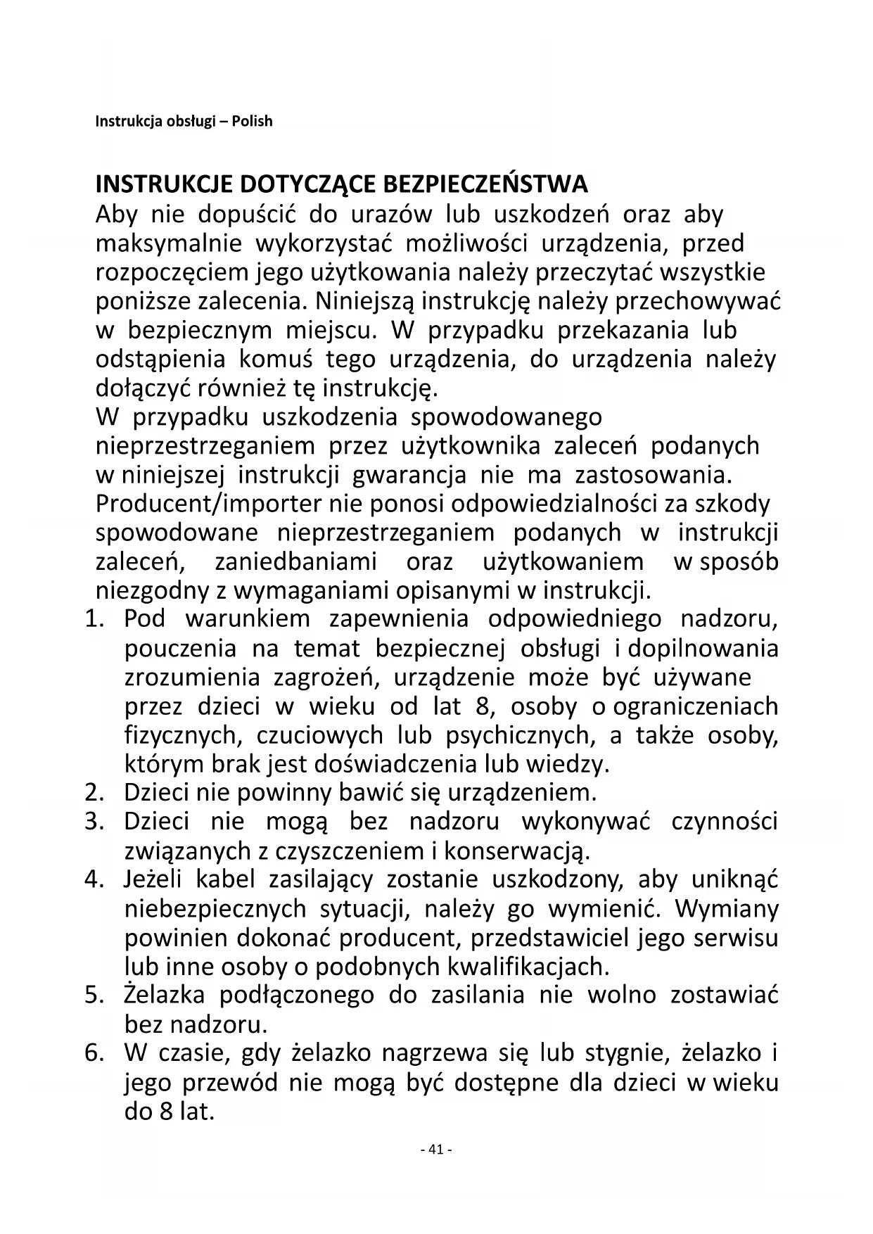 Aby nie dopuścić do urazów lub uszkodzeń oraz aby maksymalnie wykorzystać możliwości urządzenia, przed rozpoczęciem jego użytkowania należy przeczytać wszystkie poniższe zalecenia. Niniejszą instrukcję należy przechowywać w bezpiecznym miejscu. W przypadku przekazania lub odstąpienia komuś tego urządzenia, do urządzenia należy dołączyć również tę instrukcję. W przypadku uszkodzenia spowodowanego nieprzestrzeganiem przez użytkownika zaleceń podanych w niniejszej instrukcji gwarancja nie ma zastosowania. Producent/importer nie ponosi odpowiedzialności za szkody spowodowane nieprzestrzeganiem podanych w instrukcji zaleceń, zaniedbaniami oraz użytkowaniem w sposób niezgodny z wymaganiami opisanymi w instrukcji.