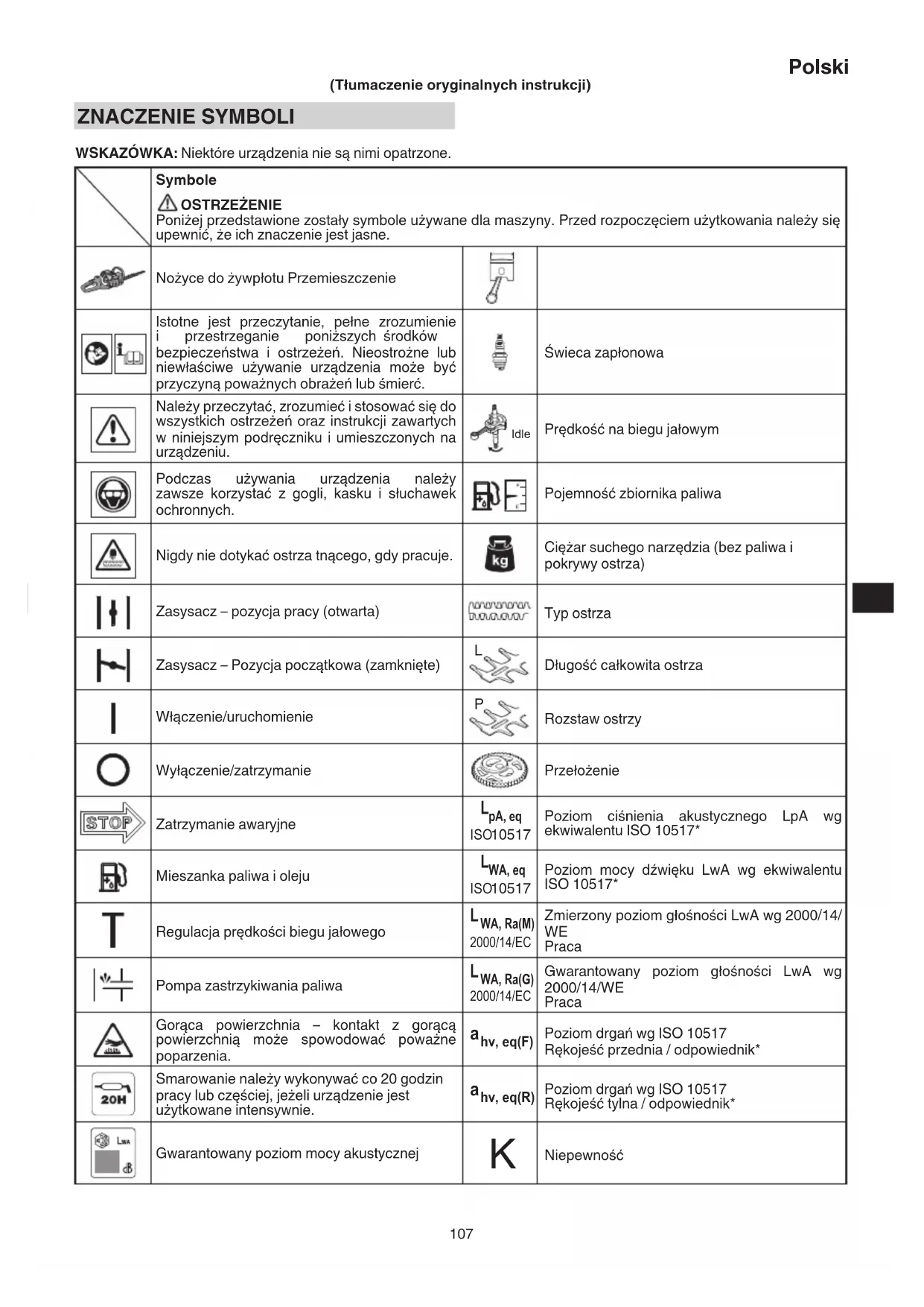 (Tłumaczenie oryginalnych instrukcji) ZNACZENIE SYMBOLI WSKAZÓWKA: Niektóre urządzenia nie są nimi opatrzone. Symbole OSTRZEŻENIE Poniżej przedstawione zostały symbole używane dla maszyny. Przed rozpoczęciem użytkowania należy się upewnić, że ich znaczenie jest jasne. Nożyce do żywpłotu Przemieszczenie Istotne jest przeczytanie, pełne zrozumienie i przestrzeganie poniższych środków bezpieczeństwa i ostrzeżeń. Nieostrożne lub niewłaściwe używanie urządzenia może być przyczyną poważnych obrażeń lub śmierć. Świeca zapłonowa Należy przeczytać, zrozumieć i stosować się do wszystkich ostrzeżeń oraz instrukcji zawartych w niniejszym podręczniku i umieszczonych na urządzeniu. Idle Prędkość na biegu jałowym Podczas używania urządzenia należy zawsze korzystać z gogli, kasku i słuchawek ochronnych. Pojemność zbiornika paliwa Nigdy nie dotykać ostrza tnącego, gdy pracuje. Ciężar suchego narzędzia (bez paliwa i pokrywy ostrza) Zasysacz – pozycja pracy (otwarta) Typ ostrza Zasysacz – Pozycja początkowa (zamknięte)