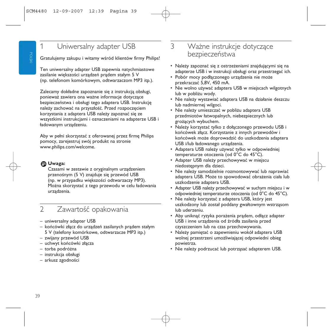 12-09-2007 12:39 Pagina 39 Uniwersalny adapter USB POLSKI Gratulujemy zakupu i witamy wśród klientów firmy Philips! Ten uniwersalny adapter USB zapewnia natychmiastowe zasilanie większości urządzeń prądem stałym 5 V (np. telefonom komórkowym, odtwarzaczom MP3 itp.). Zalecamy dokładne zapoznanie się z instrukcją obsługi, ponieważ zawiera ona ważne informacje dotyczące bezpieczeństwa i obsługi tego adaptera USB. Instrukcję należy zachować na przyszłość. Przed rozpoczęciem korzystania z adaptera USB należy zapoznać się ze wszystkimi instrukcjami i oznaczeniami na adapterze USB i ładowanym urządzeniu. Aby w pełni skorzystać z oferowanej przez firmę Philips pomocy, zarejestruj swój produkt na stronie www.philips.com/welcome. Uwaga: Czasami w zestawie z oryginalnym urządzeniem przenośnym (5 V) znajduje się przewód USB (np. w przypadku większości odtwarzaczy MP3). Można skorzystać z tego przewodu w celu ładowania urządzenia.