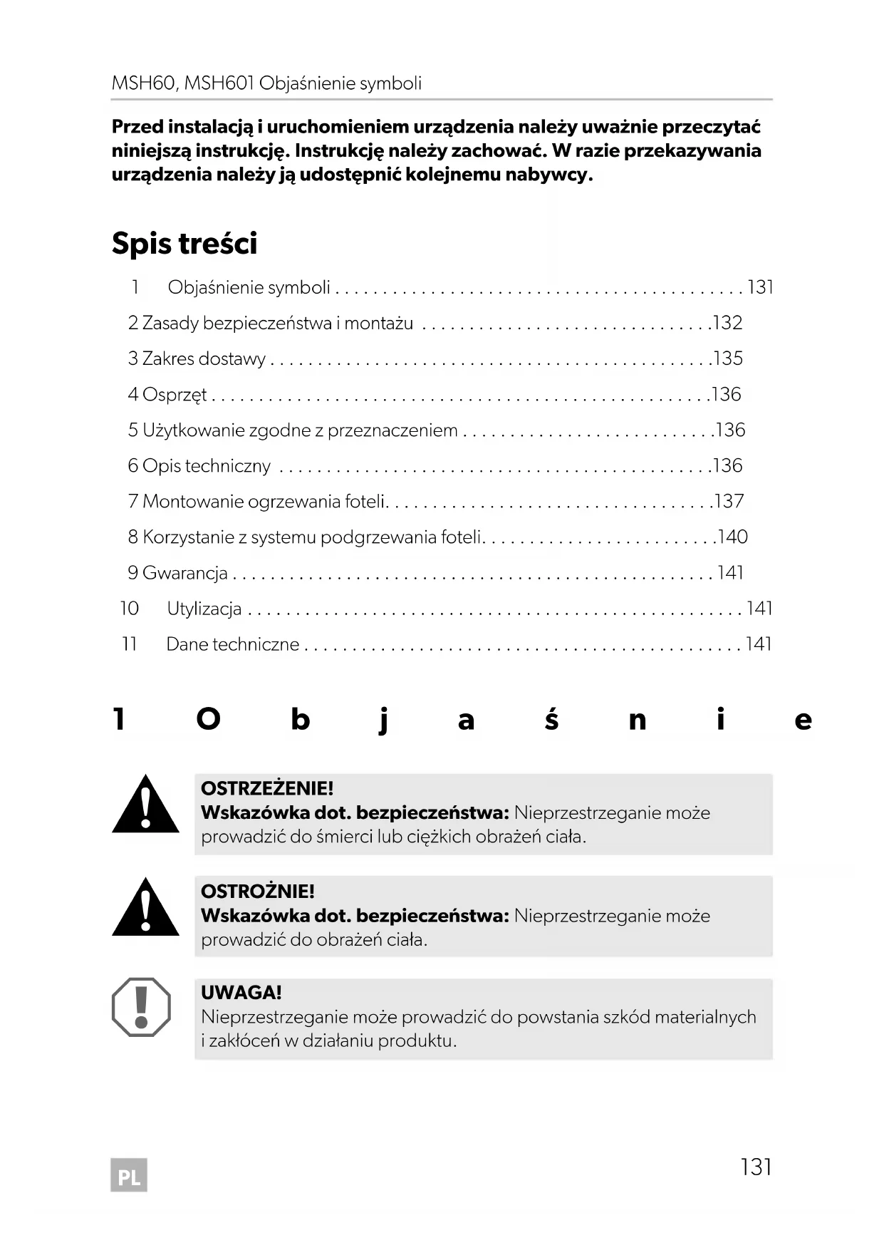 Jeżeli produkt nie będzie dłużej eksploatowany, koniecznie dowiedz się w najbliższym zakładzie recyklingu lub w specjalistycznym sklepie, jakie są aktualnie obowiązujące przepisy dotyczące utylizacji. 11 Dane techniczne MagicComfort MSH60 MagicComfort MSH601Nr produktu: 9600000393 9600000394Napięcie robocze: 12 VgPobór energii: Stopień I: 1,8 A na fotelStopień II: 3,4 A na fotelStopień I: 1,8 AStopień II: 3,4 AWymiary: Element do siedzenia: 400 x 280 mmElement oparcia: 300 x 280 mm MSH60-MSH601-IO-16s.book Seite 141 Dienstag, 30. August 2016 6:23 18SK Vysvetlenie symbolov MSH60, MSH601