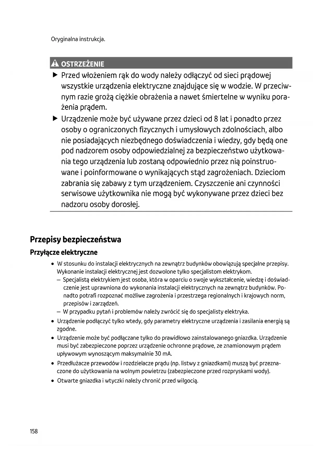OSTRZEŻENIE Przed włożeniem rąk do wody należy odłączyć od sieci prądowej wszystkie urządzenia elektryczne znajdujące się w wodzie. W przeciw- nym razie grożą ciężkie obrażenia a nawet śmiertelne w wyniku pora- żenia prądem. Urządzenie może być używane przez dzieci od 8 lat i ponadto przez osoby o ograniczonych fizycznych i umysłowych zdolnościach, albo nie posiadających niezbędnego doświadczenia i wiedzy, gdy będą one pod nadzorem osoby odpowiedzialnej za bezpieczeństwo użytkowa- nia tego urządzenia lub zostaną odpowiednio przez nią poinstruo- wane i poinformowane o wynikających stąd zagrożeniach. Dzieciom zabrania się zabawy z tym urządzeniem. Czyszczenie ani czynności serwisowe użytkownika nie mogą być wykonywane przez dzieci bez nadzoru osoby dorosłej.