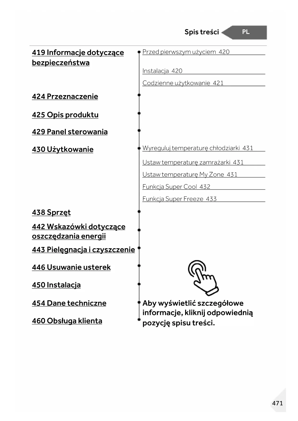 Przed pierwszym użyciem 420 Instalacja 420 Codzienne użytkowanie 421 424 Przeznaczenie 425 Opis produktu 429 Panel sterowania 430 Użytkowanie Wyreguluj temperaturę chłodziarki 431 Ustaw temperaturę zamrażarki 431 Ustaw temperaturę My Zone 431 Funkcja Super Cool 432 Funkcja Super Freeze 433 438 Sprzęt 442 Wskazówki dotyczące oszczędzania energii 443 Pielęgnacja i czyszczenie 446 Usuwanie usterek 450 Instalacja 454 Dane techniczne Aby wyświetlić szczegółowe informacje, kliknij odpowiednią pozycję spisu treści. 460 Obsługa klienta 471PL Dziękujemy Dziękujemy za zakup produktu firmy Haier. Przed użyciem urządzenia należy dokładnie przeczytać niniejsze instrukcje. Instrukcje zawierają ważne informacje, które pomogą możliwie najlepiej wykorzystać funkcje urządzenia, bezpiecznie i prawidłowo je zainstalować, eksploatować oraz konserwować. Niniejszą instrukcję obsługi należy przechowywać w dostępnym miejscu, aby móc z niej zawsze skorzystać w celu bezpiecznego i właściwego użytkowania urządzenia. Przy sprzedaży urządzenia należy do niego dołączyć niniejszą instrukcję obsługi, a w przypadku przeprowadzki przekazać ją nowemu właścicielowi, aby mógł się zapoznać z urządzeniem i ostrzeżeniami dotyczącymi bezpieczeństwa. Akcesoria Sprawdź akcesoria i materiały zgodnie z tą listą: Tacka na jajka Etykieta wydajności energetycznej Karta gwarancyjna Instrukcja obsługi Tacka na lód Zawiasy drzwi Osłona zawiasu Wkładka nasadki 472PL Informacje dotyczące bezpieczeństwa Informacje dotyczą ce bezpiecz eństwa OSTRZEŻENIE - Ważne informacje dotyczące bezpieczeństwa UWAGA - Ogólne informacje i wskazówki Informacje dotyczące ochrony środowiska Utylizacja Pomóż chronić środowisko i ludzkie zdrowie. Wyrzuć opakowanie do odpowiednich pojemników do recyklingu. Pomóż w recyklingu odpadów z urządzeń elektrycznych i elektronicznych. Nie wyrzucaj urządzeń oznaczonych tym symbolem razem z odpadami domowymi. Oddaj produkt do miejscowego zakładu recyklingu lub skontaktuj się z urzędem miejskim. OSTRZEŻENIE! Ryzyko obrażeń lub uduszenia! Czynniki chłodnicze i gazy muszą być utylizowane w profesjonalny sposób. Przed utylizacją upewnij się, że przewody układu chłodniczego nie są uszkodzone. Odłącz urządzenie od zasilania sieciowego. Odetnij przewód zasilający i zutylizuj go. Usuń tace i szuflady oraz zamek drzwi i uszczelki, aby zapobiec zamknięciu się dzieci i zwierząt w urządzeniu. 473PL Informacje dotyczące bezpieczeństwa Przed włączeniem urządzenia po raz pierwszy, przeczytaj poniższe wskazówki dotyczące bezpieczeństwa: OSTRZEŻENIE! Przed pierwszym użyciem ► Upewnij się, że nie ma uszkodzeń powstałych podczas transportu. ► Usunąć wszystkie opakowania i przechowywać w miejscu niedostępnym dla dzieci. ► Odczekaj co najmniej dwie godziny przed zainstalowaniem urządzenia, aby upewnić się, że obwód czynnika chłodniczego jest w pełni efektywny. ► Zawsze przenoś urządzenie z pomocą co najmniej dwóch osób, ponieważ jest ono ciężkie. Instalacja ► Urządzenie powinno być umieszczone w dobrze wentylowanym miejscu. Zapewnij przestrzeń co najmniej 10 cm nad urządzeniem i wokół niego. ► Nigdy nie umieszczaj urządzenia w wilgotnym miejscu lub w takim, w którym może być ochlapane wodą. Zetrzyj plamy i zachlapania do sucha miękką i czystą ściereczką. ► Nie instaluj urządzenia w miejscu, w którym będzie narażone na bezpośrednie działanie słońca lub w pobliżu źródeł ciepła (np. pieców, grzejników). ► Zainstaluj i wypoziomuj urządzenie w miejscu odpowiednim dla jego wielkości i przeznaczenia. ► Należy dbać o drożność otworów wentylacyjnych w obudowie urządzenia wolnostojącego lub w konstrukcji do zabudowy. ► Upewnij się, że informacje dotyczące elektryki na tabliczce znamionowej są zgodne z parametrami zasilania. Jeśli tak nie jest, skontaktuj się z elektrykiem. ► Urządzenie jest zasilane prądem 220–240 V AC/50 Hz. Odbiegające od normy wahania napięcia mogą spowodować niewłączenie się urządzenia albo uszkodzenie regulatora temperatury lub sprężarki. Mogą też być przyczyną nietypowego hałasu podczas pracy. W takim przypadku powinien zostać zamontowany automatyczny regulator. ► Nie używaj adapterów wtyczek i przedłużaczy.► Za urządzeniem nie należy umieszczać kilku listew zasilających ani przenośnych zasilaczy. ► Upewnij się, że kabel zasilający nie jest przytrzaśnięty przez chłodziarkę. Nie stawaj na przewodzie zasilającym. 474PL Informacje dotyczące bezpieczeństwa OSTRZEŻENIE! ► Używaj oddzielnego, łatwo dostępnego i uziemionego gniazdka. Urządzenie musi być uziemione. Dotyczy tylko Wielkiej Brytanii: Kabel zasilający urządzenie jest wyposażony we wtyczkę z 3 bolcami (z uziemieniem), która pasuje do standardowego gniazda z 3 przewodami (z uziemieniem). Nigdy nie odcinaj ani nie demontuj trzeciego bolca (z uziemieniem). Po zainstalowaniu urządzenia wtyczka powinna być łatwo dostępna. ► Uważaj, aby nie uszkodzić obwodu chłodniczego. Codzienne użytkowanie ► Urządzenie może być obsługiwane przez dzieci powyżej 8 roku życia i przez osoby o ograniczonych możliwościach fizycznych, sensorycznych lub umysłowych lub osoby nieposiadające doświadczenia ani wiedzy pod warunkiem, że są one pod odpowiednim nadzorem lub zostały poinstruowane, jak bezpiecznie obsługiwać urządzenie i rozumieją związane z nim zagrożenia. ► Dzieciom w wieku od 3 do 8 lat wolno ładować i rozładowywać, ale nie wolno czyścić ani instalować urządzeń chłodniczych. ► Trzymaj z dala od urządzenia dzieci poniżej 3 roku życia, chyba że są pod stałym nadzorem. ► Dzieci nie powinny bawić się urządzeniem.► Jeśli czynnik chłodniczy lub inny łatwopalny gaz wycieka w pobliżu urządzenia, zamknij zawór wyciekającego gazu, otwórz drzwi oraz okn