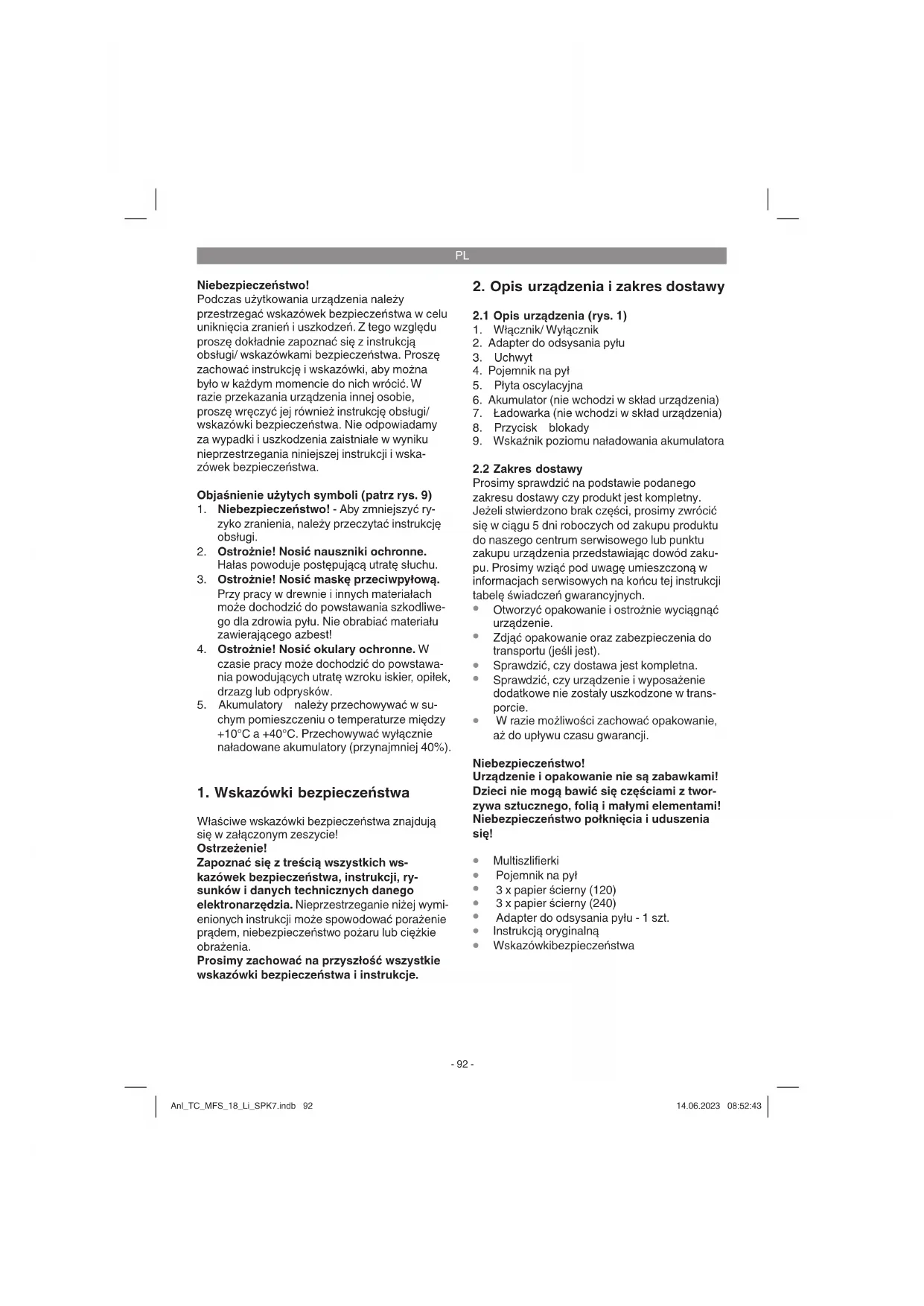 Nie włączać urządzenia, jeśli nie będzie używane. Ograniczyć czas pracy! Należy uwzględnić wszystkie etapy cyklu pracy, w tym również np. czas, w którym elektronarzędzie pozostaje wyłączone oraz czas, w którym pracuje ono bez obciążenia. Ostrożnie! Pozostałe zagrożenia Ta k że w przypadku, gdy to elektronarzędzie będzie obsługiwane zgodnie z instrukcją, zawsze zachodzi ryzyko powstawania zagrożenia. W zależności od budowy i spo- sobu wykonania tego elektronarzędzia mogą pojawić się następujące zagrożenia: Anl_TC_MFS_18_Li_SPK7.indb 93Anl_TC_MFS_18_Li_SPK7.indb 93 14.06.2023 08:52:4314.06.2023 08:52:43PL