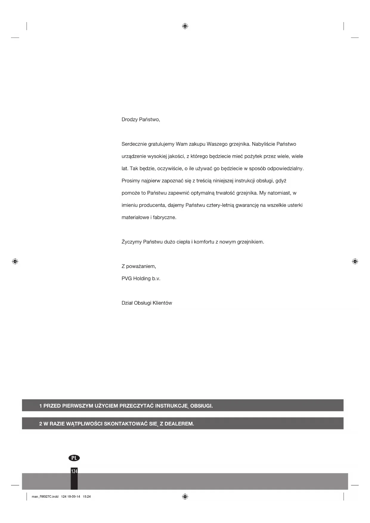 Drodzy Państwo, Serdecznie gratulujemy Wam zakupu Waszego grzejnika. Nabyliście Państwo urządzenie wysokiej jakości, z którego będziecie mieć pożytek przez wiele, wiele lat. Tak będzie, oczywiście, o ile używać go będziecie w sposób odpowiedzialny. Prosimy najpierw zapoznać się z treścią niniejszej instrukcji obsługi, gdyż pomoże to Państwu zapewnić optymalną trwałość grzejnika. My natomiast, w imieniu producenta, dajemy Państwu cztery-letnią gwarancję na wszelkie usterki materiałowe i fabryczne. Życzymy Państwu dużo ciepła i komfortu z nowym grzejnikiem. Z poważaniem, PVG Holding b.v. Dział Obsługi Klientów man_R8027C.indd 124 18-09-14 15:24R 125 E 1998 / 1999 1 PRZED PIERWSZYM UŻYCIEM PRZECZYTAĆ INSTRUKCJE˛ OBSłUGI. 2 W RAZIE WĄTPLIWOŚCI SKONTAKTOWAĆ SIE˛ Z DEALEREM.