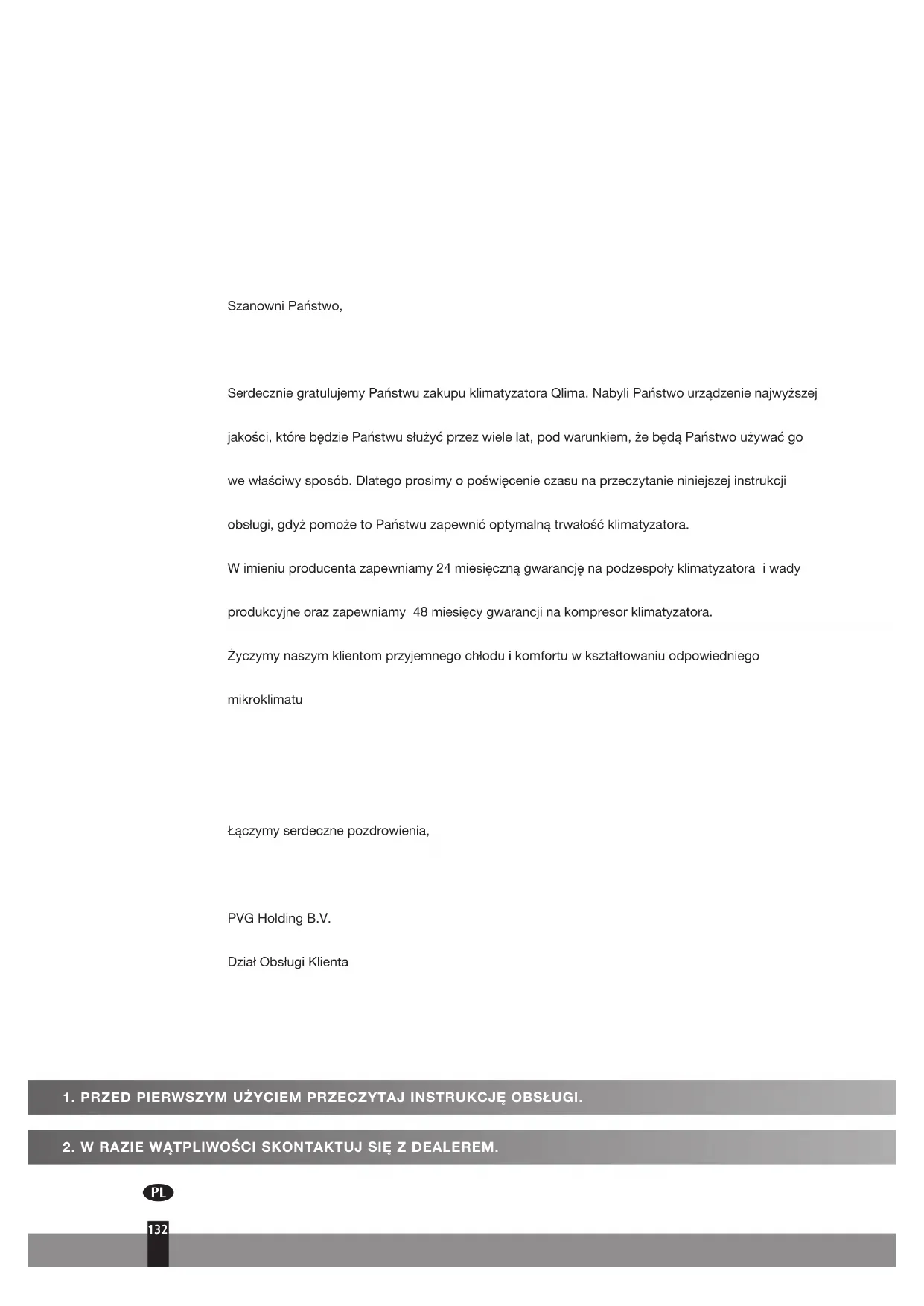 Szanowni Państwo, Serdecznie gratulujemy Państwu zakupu klimatyzatora Qlima. Nabyli Państwo urządzenie najwyższej jakości, które będzie Państwu służyć przez wiele lat, pod warunkiem, że będą Państwo używać go we właściwy sposób. Dlatego prosimy o poświęcenie czasu na przeczytanie niniejszej instrukcji obsługi, gdyż pomoże to Państwu zapewnić optymalną trwałość klimatyzatora. W imieniu producenta zapewniamy 24 miesięczną gwarancję na podzespoły klimatyzatora i wady produkcyjne oraz zapewniamy 48 miesięcy gwarancji na kompresor klimatyzatora. Życzymy naszym klientom przyjemnego chłodu i komfortu w kształtowaniu odpowiedniego mikroklimatu Łączymy serdeczne pozdrowienia, PVG Holding B.V. Dział Obsługi Klienta 132:
