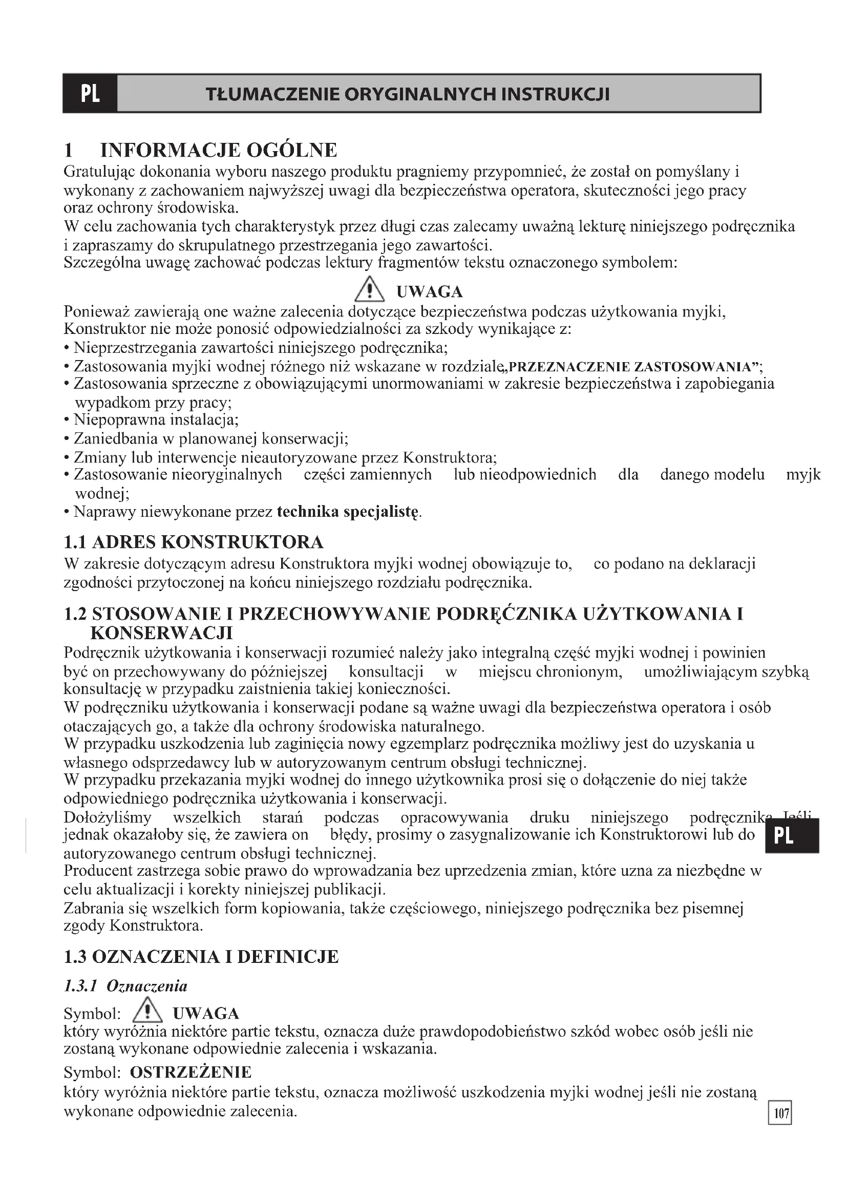 W zakresie dotyczym adresu Konstruktora myjki wodnej obowiazuju to, co podano na deklaracje zgodnosci przytoczonej na koncu niniejszego Rozdiazu podręcznika.