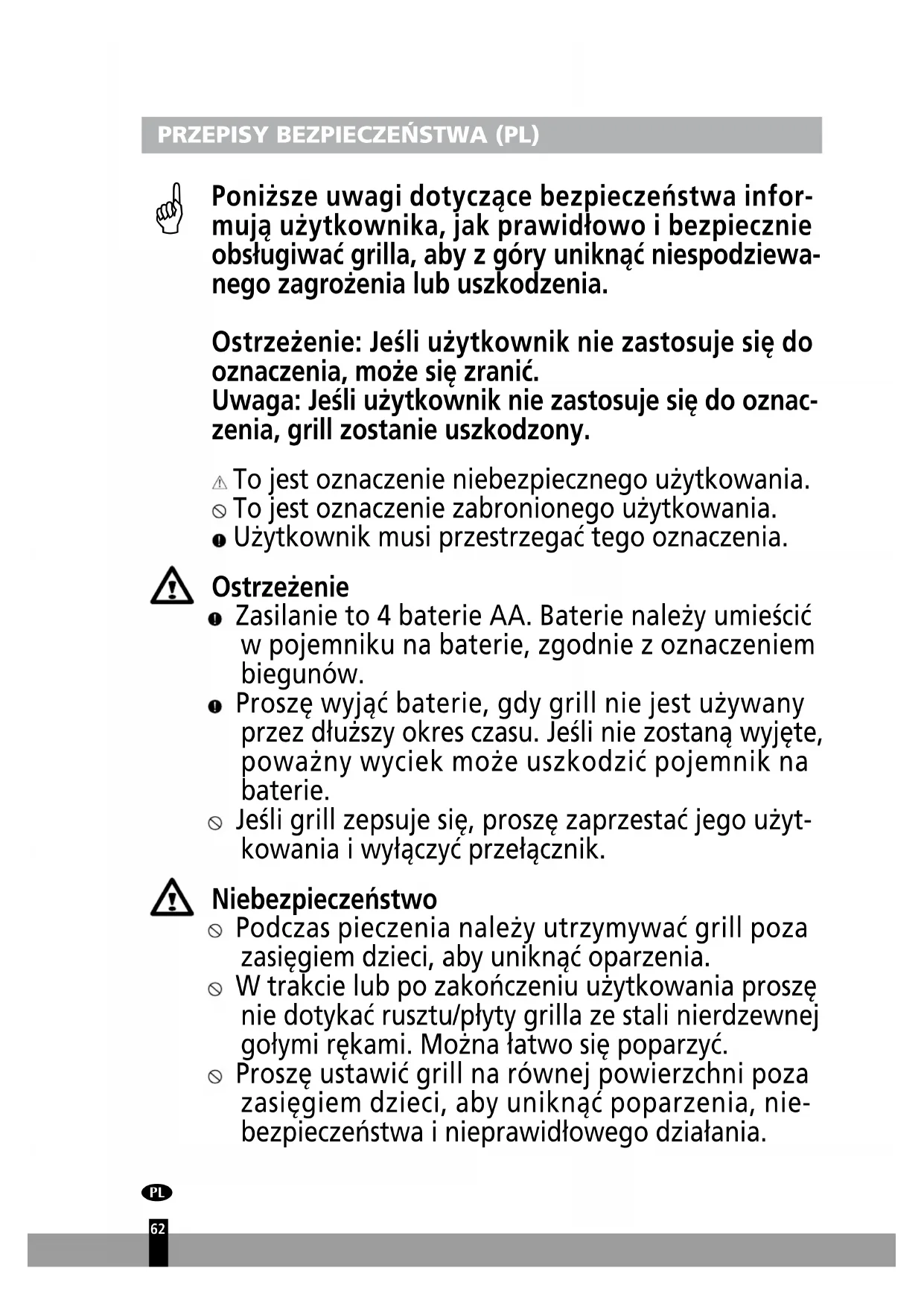 Poniższe uwagi dotyczące bezpieczeństwa infor- mują użytkownika, jak prawidłowo i bezpiecznie obsługiwać grilla, aby z góry uniknąć niespodziewa- nego zagrożenia lub uszkodzenia. Ostrzeżenie: Jeśli użytkownik nie zastosuje się do oznaczenia, może się zranić. Uwaga: Jeśli użytkownik nie zastosuje się do oznac- zenia, grill zostanie uszkodzony. To jest oznaczenie niebezpiecznego użytkowania. To jest oznaczenie zabronionego użytkowania. Użytkownik musi przestrzegać tego oznaczenia. Ostrzeżenie Zasilanie to 4 baterie AA. Baterie należy umieścić w pojemniku na baterie, zgodnie z oznaczeniem biegunów. Proszę wyjąć baterie, gdy grill nie jest używany przez dłuższy okres czasu. Jeśli nie zostaną wyjęte, poważny wyciek może uszkodzić pojemnik na baterie. Jeśli grill zepsuje się, proszę zaprzestać jego użyt- kowania i wyłączyć przełącznik. Niebezpieczeństwo Podczas pieczenia należy utrzymywać grill poza zasięgiem dzieci, aby uniknąć oparzenia. W trakcie lub po zakończeniu użytkowania proszę nie dotykać rusztu/płyty grilla ze stali nierdzewnej gołymi rękami. Można łatwo się poparzyć. Proszę ustawić grill na równej powierzchni poza zasięgiem dzieci, aby uniknąć poparzenia, nie- bezpieczeństwa i nieprawidłowego działania. :63 Po zakończeniu użytkowania